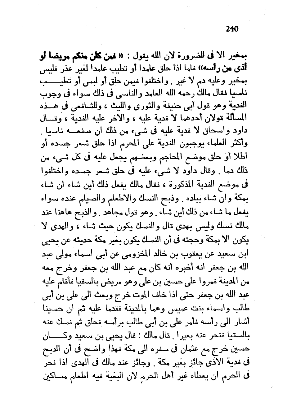 بِمُخَيَّرٍ إِلَّا فِي الضَّرُورَةِ لِأَنَّ اللَّهَ يَقُولُ فمن كان منكم مريضا أو أَذًى مِنْ رَأْسِهِ فَأَمَّا إِذَا حَلَقَ عَامِدًا أَوْ تَطَيَّبَ عَامِدًا لِغَيْرِ عُذْرٍ فَلَيْسَ بِمُخَيَّرٍ وَعَلَيْهِ دَمٌ لَا غَيْرُ وَاخْتَلَفُوا فَيمَنْ حَلَقَ أَوْ لَبِسَ أَوْ تَطَيَّبَ نَاسِيًا فَقَالَ مَالِكٌ رَحِمَهُ اللَّهُ الْعَامِدُ وَالنَّاسِي فِي ذَلِكَ سَوَاءٌ فِي وُجُوبِ الْفِدْيَةِ وَهُوَ قَوْلُ أَبِي حَنِيفَةَ وَالثَّوْرِيِّ وَاللَّيْثِ وَلِلشَّافِعِيِّ فِي هَذِهِ الْمَسْأَلَةِ قَوْلَانِ أَحَدُهُمَا لَا فِدْيَةَ عَلَيْهِ وَالْآخَرُ عَلَيْهِ الْفِدْيَةُ وَقَالَ دَاوُدُ وَإِسْحَاقُ لَا فِدْيَةَ عَلَيْهِ فِي شَيْءٍ مِنْ ذَلِكَ إِنْ صَنَعَهُ نَاسِيًا وَأَكْثَرُ العلماء يوجبون الفدية على المحرم إاذ حَلَقَ شَعْرَ جَسَدِهِ أَوْ إِطِلًا أَوْ حَلَقَ مَوْضِعَ الْمَحَاجِمِ وَبَعْضُهُمْ يَجْعَلُ عَلَيْهِ فِي كُلِّ شيء من ذلك دما وقال داود لاشيء عَلَيْهِ فِي حَلْقِ شَعْرِ جَسَدِهِ وَاخْتَلَفُوا فِي موضع الفدية المذكروة فَقَالَ مَالِكٌ يَفْعَلُ ذَلِكَ أَيْنَ شَاءَ إِنْ شَاءَ بِمَكَّةَ وَإِنْ شَاءَ بِبَلَدِهِ وَذَبْحُ النُّسُكِ وَالْإِطْعَامُ وَالصِّيَامُ عِنْدَهُ سَوَاءٌ يَفْعَلُ مَا شَاءَ مِنْ ذَلِكَ أَيْنَ شَاءَ وَهُوَ قَوْلُ مُجَاهِدٍ والذبح ها هنا عِنْدَ مَالِكٍ نُسُكٌ وَلَيْسَ بِهَدْيٍ قَالَ وَالنُّسُكُ يَكُونُ حَيْثُ شَاءَ وَالْهَدْيُ لَا يَكُونُ إِلَّا بِمَكَّةَ وَحُجَّتُهُ فِي أَنَّ النُّسُكَ يَكُونُ بِغَيْرِ مكة حديثه عن يحيى ابن سَعِيدٍ عَنْ يَعْقُوبَ بْنِ خَالِدٍ الْمَخْزُومِيِّ عَنْ أَبِي أَسْمَاءَ مَوْلَى عَبْدِ اللَّهِ بْنِ جَعْفَرٍ أَنَّهُ أَخْبَرَهُ أَنَّهُ كَانَ مَعَ عَبْدِ اللَّهِ بْنِ جَعْفَرٍ وَخَرَجَ مَعَهُ مِنَ الْمَدِينَةِ فَمَرُّوا عَلَى حُسَيْنِ بْنِ عَلِيٍّ وَهُوَ مَرِيضٌ بِالسُّقْيَا فَأَقَامَ عَلَيْهِ عَبْدُ اللَّهِ بْنُ جَعْفَرٍ حَتَّى إِذَا خَافَ الْمَوْتَ خَرَجَ وَبَعَثَ إِلَى عَلِيِّ بْنِ أَبِي طَالِبٍ وَأَسْمَاءَ بِنْتِ عُمَيْسٍ وَهُمَا بِالْمَدِينَةِ فَقَدِمَا عَلَيْهِ ثُمَّ إِنَّ حُسَيْنًا أَشَارَ إِلَى رَأْسِهِ فَأَمَرَ عَلِيُّ بْنُ أَبِي طَالِبٍ بِرَأْسِهِ فَحُلِقَ ثُمَّ نَسَكَ عَنْهُ بِالسُّقْيَا فَنَحَرَ عَنْهُ بَعِيرًا قَالَ مَالِكٌ قَالَ يَحْيَى بْنُ سَعِيدٍ وَكَانَ حُسَيْنٌ خَرَجَ مَعَ عُثْمَانَ فِي سَفَرِهِ إِلَى مَكَّةَ فَهَذَا وَاضِحٌ فِي أَنَّ الذَّبْحَ فِي فِدْيَةِ الْأَذَى جَائِزٌ بِغَيْرِ مَكَّةَ وَجَائِزٌ عِنْدَ مَالِكٍ فِي الْهَدْيِ إِذَا نَحَرَ فِي الْحَرَمِ أَنْ يُعْطَاهُ غَيْرُ أَهْلِ الْحَرَمِ لِأَنَّ الْبُغْيَةَ فِيهِ إِطْعَامُ مَسَاكِينِ