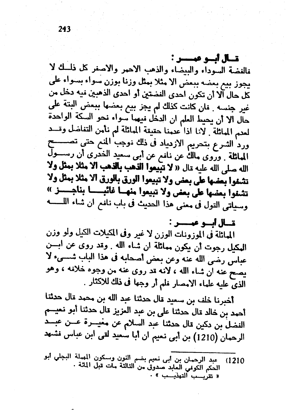 قَالَ أَبُو عُمَرَ فَالْفِضَّةُ السَّوْدَاءُ وَالْبَيْضَاءُ وَالذَّهَبُ الْأَحْمَرُ وَالْأَصْفَرُ كُلُّ ذَلِكَ لَا يَجُوزُ بَيْعُ بَعْضِهِ بِبَعْضٍ إِلَّا مِثْلًا بِمِثْلٍ وَزْنًا بِوَزْنٍ سَوَاءً بِسَوَاءٍ عَلَى كُلِّ حَالٍ إِلَّا أَنْ تَكُونَ إِحْدَى الْفِضَّتَيْنِ أَوْ إِحْدَى الذَّهَبَيْنِ فِيهِ دَخَلٌ مِنْ غَيْرِ جِنْسِهِ فَإِنْ كَانَتْ كَذَلِكَ لَمْ يَجُزْ بَيْعُ بَعْضِهَا بِبَعْضٍ أَلْبَتَّةَ عَلَى حَالٍ إِلَّا أَنْ يُحِيطَ الْعِلْمُ أَنَّ الدَّخْلَ فِيهِمَا سَوَاءٌ نَحْوَ السِّكَّةِ الْوَاحِدَةِ لِعَدَمِ الْمُمَاثَلَةِ لِأَنَّا إِذَا عَدِمْنَا حَقِيقَةَ الْمُمَاثَلَةِ لَمْ نَأْمَنِ التَّفَاضُلَ وَقَدْ وَرَدَ الشَّرْعُ بِتَحْرِيمِ الِازْدِيَادِ فِي ذلك فوجب المنع حتى تصحة الْمُمَاثَلَةُ وَرَوَى مَالِكٌ عَنْ نَافِعٍ عَنْ أَبِي سَعِيدٍ الْخُدْرِيِّ أَنَّ رَسُولَ اللَّهِ صَلَّى اللَّهُ عَلَيْهِ وَسَلَّمَ قَالَ لَا تَبِيعُوا الذَّهَبَ بِالذَّهَبِ إِلَّا مِثْلًا بِمِثْلٍ وَلَا تُشِفُّوا بَعْضَهَا عَلَى بَعْضٍ وَلَا تَبِيعُوا الْوَرِقَ بِالْوَرِقِ إِلَّا مِثْلًا بِمِثْلٍ وَلَا تُشِفُّوا بَعْضَهَا عَلَى بَعْضٍ وَلَا تَبِيعُوا مِنْهَا غَائِبًا بِنَاجِزٍ وَسَيَأْتِي الْقَوْلُ فِي مَعْنَى هَذَا الْحَدِيثِ فِي بَابِ نَافِعٍ إِنْ شَاءَ اللَّهُ قَالَ أَبُو عُمَرَ الْمُمَاثَلَةُ فِي الْمَوْزُونَاتِ الْوَزْنُ لَا غَيْرَ وَفِي الْمَكِيلَاتِ الْكَيْلُ وَلَوْ وُزِنَ الْمَكِيلُ رَجَوْتُ أَنْ يَكُونَ مُمَاثَلَةً إِنْ شَاءَ اللَّهُ وَقَدْ رُوِيَ عَنِ ابْنِ عَبَّاسٍ رَضِيَ اللَّهُ عَنْهُ وَعَنْ بَعْضِ أَصْحَابِهِ فِي هَذَا الْبَابِ شَيْءٌ لَا يَصِحُّ عَنْهُ إِنْ شَاءَ اللَّهُ لِأَنَّهُ قَدْ رُوِيَ عَنْهُ مِنْ وُجُوهٍ خِلَافُهُ وَهُوَ الَّذِي عَلَيْهِ عُلَمَاءُ الْأَمْصَارِ فَلَمْ أَرَ وَجْهًا فِي ذَلِكَ لِلْإِكْثَارِ أَخْبَرَنَا خَلَفُ بْنُ سَعِيدٍ قَالَ حَدَّثَنَا عَبْدُ اللَّهِ بْنُ مُحَمَّدٍ قَالَ حَدَّثَنَا أَحْمَدُ بْنُ خَالِدٍ قَالَ حَدَّثَنَا عَلِيُّ بْنُ عَبْدِ الْعَزِيزِ قَالَ حَدَّثَنَا أَبُو نُعَيْمٍ الْفَضْلُ بْنُ دُكَيْنٍ قَالَ حَدَّثَنَا عَبْدُ السَّلَامِ عَنْ مُغِيرَةَ عَنْ عبد الرحمان بْنِ أَبِي نُعَيْمٍ أَنَّ أَبَا سَعِيدٍ لَقِيَ ابْنَ عَبَّاسٍ فَشَهِدَ