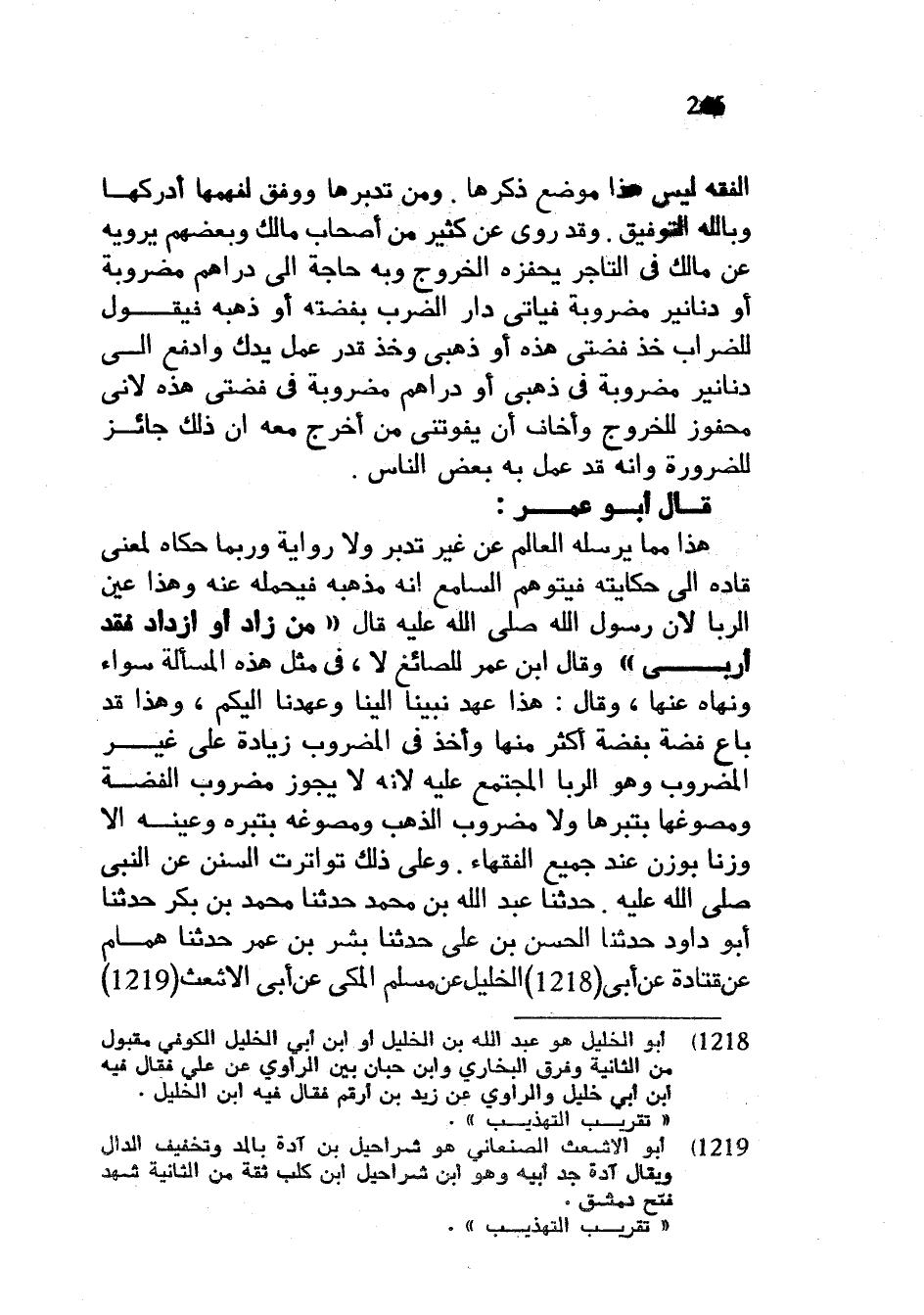 الْفِقْهِ لَيْسَ هَذَا مَوْضِعَ ذِكْرِهَا وَمَنْ تَدَبَّرَهَا وَوُفِّقَ لِفَهْمِهَا أَدْرَكَهَا وَبِاللَّهِ التَّوْفِيقُ وَقَدْ رُوِيَ عَنْ كَثِيرٍ مِنْ أَصْحَابِ مَالِكٍ وَبَعْضُهُمْ يَرْوِيهِ عَنْ مَالِكٍ فِي التَّاجِرِ يَحْفِزُهُ الْخُرُوجُ وَبِهِ حَاجَةٌ إِلَى دَرَاهِمَ مَضْرُوبَةٍ أَوْ دَنَانِيرَ مَضْرُوبَةٍ فَيَأْتِي دَارَ الضَّرْبِ بِفِضَّتِهِ أَوْ ذَهَبِهِ فَيَقُولُ لِلضَّرَّابِ خُذْ فِضَّتِي هَذِهِ أَوْ ذَهَبِي وَخُذْ قَدْرَ عَمَلِ يَدِكَ وَادْفَعْ إِلَيَّ دَنَانِيرَ مَضْرُوبَةً فِي ذَهَبِي أَوْ دَرَاهِمَ مَضْرُوبَةً فِي فِضَّتِي هَذِهِ لِأَنِّي مَحْفُوزٌ لِلْخُرُوجِ وَأَخَافُ أَنْ يَفُوتَنِي مَنْ أَخْرَجَ مَعَهُ أَنَّ ذَلِكَ جَائِزٌ لِلضَّرُورَةِ وَإِنَّهُ قَدْ عَمِلَ بِهِ بَعْضُ النَّاسِ قَالَ أَبُو عُمَرَ هَذَا مِمَّا يُرْسِلُهُ الْعَالِمُ عَنْ غَيْرِ تَدَبُّرٍ وَلَا رِوَايَةٍ وَرُبَّمَا حَكَاهُ لِمَعْنًى قَادَهُ إِلَى حِكَايَتِهِ فَيَتَوَهَّمُ السَّامِعُ أَنَّهُ مَذْهَبُهُ فَيَحْمِلُهُ عَنْهُ وَهَذَا عَيْنُ الرِّبَا لِأَنَّ رَسُولَ اللَّهِ صَلَّى اللَّهُ عَلَيْهِ وَسَلَّمَ قَالَ مَنْ زَادَ أَوِ ازْدَادَ فَقَدْ أَرْبَى وَقَالَ ابْنُ عُمَرَ لِلصَّائِغِ لَا فِي مِثْلِ هَذِهِ الْمَسْأَلَةِ سَوَاءٌ وَنَهَاهُ عَنْهَا وَقَالَ هَذَا عَهْدُ نَبِيِّنَا إِلَيْنَا وَعَهْدُنَا إِلَيْكُمْ وَهَذَا قَدْ بَاعَ فِضَّةً بِفِضَّةٍ أَكْثَرَ مِنْهَا وَأَخَذَ فِي الْمَضْرُوبِ زِيَادَةً عَلَى غَيْرِ الْمَضْرُوبِ وَهُوَ الرِّبَا الْمُجْتَمَعُ عَلَيْهِ لِأَنَّهُ لَا يَجُوزُ مَضْرُوبُ الْفِضَّةِ وَمَصُوغُهَا بِتِبْرِهَا وَلَا مَضْرُوبُ الذَّهَبِ وَمَصُوغُهُ بِتِبْرِهِ وَعَيْنِهِ إِلَّا وَزْنًا بِوَزْنٍ عِنْدَ جَمِيعِ الْفُقَهَاءِ وَعَلَى ذَلِكَ تَوَاتَرَتِ السُّنَنُ عَنِ النَّبِيِّ صَلَّى اللَّهُ عَلَيْهِ وَسَلَّمَ حَدَّثَنَا عَبْدُ اللَّهِ بْنُ مُحَمَّدٍ حَدَّثَنَا مُحَمَّدُ بْنُ بَكْرٍ حَدَّثَنَا أَبُو دَاوُدَ حَدَّثَنَا الْحَسَنُ بْنُ عَلِيٍّ حَدَّثَنَا بِشْرُ بْنُ عُمَرَ حَدَّثَنَا هَمَّامٌ عَنْ قَتَادَةَ عَنْ أَبِي الْخَلِيلِ عَنْ مُسْلِمٍ الْمَكِّيِّ عَنْ أَبِي الْأَشْعَثِ