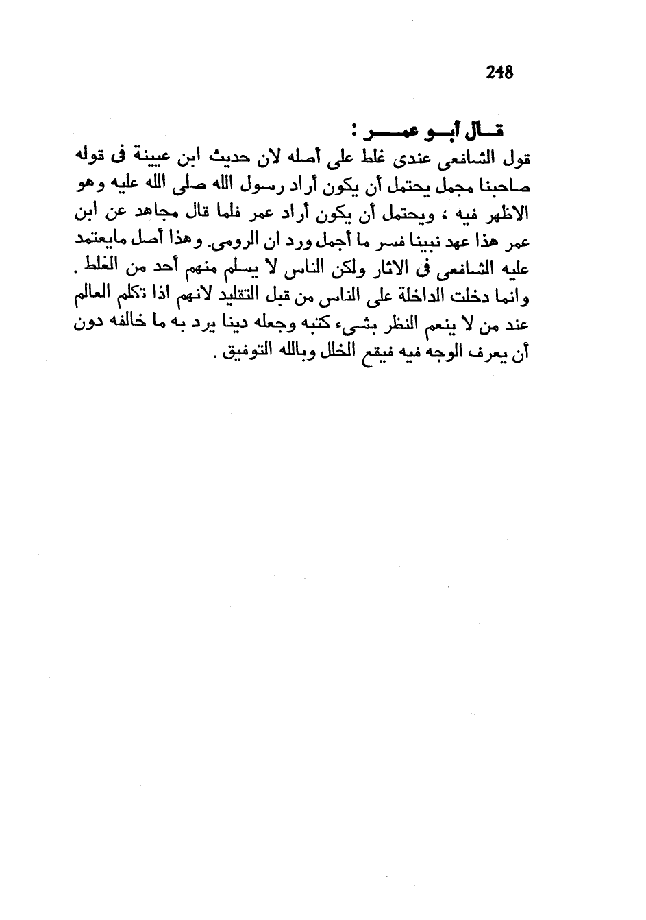 قَالَ أَبُو عُمَرَ قَوْلُ الشَّافِعِيِّ عِنْدِي غَلَطٌ عَلَى أَصْلِهِ لِأَنَّ حَدِيثَ ابْنِ عُيَيْنَةَ فِي قَوْلِهِ صَاحِبِنَا مُجْمَلٌ يُحْتَمَلُ أَنْ يَكُونَ أَرَادَ رَسُولُ اللَّهِ صَلَّى اللَّهُ عَلَيْهِ وَسَلَّمَ وهو الْأَظْهَرُ فِيهِ وَيُحْتَمَلُ أَنْ يَكُونَ أَرَادَ عُمَرَ فَلَمَّا قَالَ مُجَاهِدٌ عَنِ ابْنِ عُمَرَ هَذَا عهد نبينا فسر ما أجمل ورد أن الرُّومِيُّ وَهَذَا أَصْلُ مَا يَعْتَمِدُ عَلَيْهِ الشَّافِعِيُّ فِي الْآثَارِ وَلَكِنَّ النَّاسَ لَا يَسْلَمُ مِنْهُمْ أَحَدٌ مِنَ الْغَلَطِ وَإِنَّمَا دَخَلَتِ الدَّاخِلَةُ عَلَى النَّاسِ مِنْ قَبِلَ التَّقْلِيدِ لِأَنَّهُمْ إِذَا تَكَلَّمَ العالم عند من لا ينعم النَّظَرَ بِشَيْءٍ كَتَبَهُ وَجَعَلَهُ دَيْنًا يَرُدُّ بِهِ مَا خَالَفَهُ دُونَ أَنْ يَعْرِفَ الْوَجْهَ فِيهِ فَيَقَعُ الْخَلَلُ وَبِاللَّهِ التَّوْفِيقُ