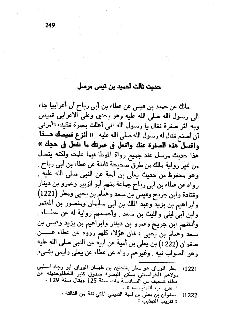 حَدِيثٌ ثَالِثٌ لِحُمَيْدِ بْنِ قَيْسٍ مُرْسَلٌ مَالِكٌ عَنْ حُمَيْدِ بْنِ قَيْسٍ عَنْ عَطَاءِ بْنِ أَبِي رَبَاحٍ أَنَّ أَعْرَابِيًّا جَاءَ إِلَى رَسُولِ اللَّهِ صَلَّى اللَّهُ عَلَيْهِ وَسَلَّمَ وَهُوَ بِحُنَيْنٍ وَعَلَى الْأَعْرَابِيِّ قَمِيصٌ وَبِهِ أَثَرُ صُفْرَةٍ فَقَالَ يَا رَسُولَ اللَّهِ إِنِّي أَهَلَلْتُ بِعُمْرَةٍ فَكَيْفَ تَأْمُرُنِي أَنْ أَصْنَعَ فَقَالَ لَهُ رَسُولُ اللَّهِ صَلَّى اللَّهُ عَلَيْهِ وَسَلَّمَ انْزِعْ قَمِيصَكَ هَذَا وَاغْسِلْ هَذِهِ الصُّفْرَةَ عَنْكَ وَافْعَلْ فِي عُمْرَتِكَ مَا تَفْعَلُ فِي حَجِّكَ هَذَا حَدِيثٌ مُرْسَلٌ عِنْدَ جَمِيعِ رُوَاةِ الْمُوَطَّأِ فِيمَا عَلِمْتُ وَلَكِنَّهُ يَتَّصِلُ مِنْ غَيْرِ رِوَايَةِ مَالِكٍ مَنْ طُرُقٍ صَحِيحَةٍ ثَابِتَةٍ عَنْ عَطَاءِ بْنِ أَبِي رَبَاحٍ وَهُوَ مَحْفُوظٌ مِنْ حَدِيثِ يَعْلَى بْنِ أُمَيَّةَ عَنِ النَّبِيِّ صَلَّى اللَّهُ عَلَيْهِ وَسَلَّمَ رَوَاهُ عَنْ عَطَاءِ بْنِ أَبِي رَبَاحٍ جَمَاعَةٌ مِنْهُمْ أَبُو الزُّبَيْرِ وَعَمْرُو بْنُ دِينَارٍ وَقَتَادَةُ وَابْنُ جُرَيْحٍ وَقَيْسُ بْنُ سَعْدٍ وَهَمَّامُ بْنُ يَحْيَى وَمَطَرٌ وَإِبْرَاهِيمُ بْنُ يَزِيدَ وَعَبْدُ الْمَلِكِ بْنُ أَبِي سُلَيْمَانَ وَمَنْصُورُ بْنُ الْمُعْتَمِرِ وَابْنُ أَبِي لَيْلَى وَاللَّيْثُ بْنُ سَعْدٍ وَأَحْسَنُهُمْ رِوَايَةً لَهُ عن عطاء وأتقنهم ابن جريج وَعَمْرُو بْنُ دِينَارٍ وَإِبْرَاهِيمُ بْنُ يَزِيدَ وَقَيْسُ بْنُ سَعْدٍ وَهَمَّامُ بْنُ يَحْيَى فَإِنَّ هَؤُلَاءِ كُلَّهُمْ رَوَوْهُ عَنْ عَطَاءٍ عَنْ صَفْوَانَ بْنِ يَعْلَى بْنِ أُمَيَّةَ عَنْ أَبِيهِ عَنِ النَّبِيِّ صَلَّى اللَّهُ عَلَيْهِ وَسَلَّمَ وَهُوَ الصَّوَابُ فِيهِ وَغَيْرُهُمْ رَوَاهُ عَنْ عَطَاءٍ عَنْ يَعْلَى وَلَيْسَ بشيء