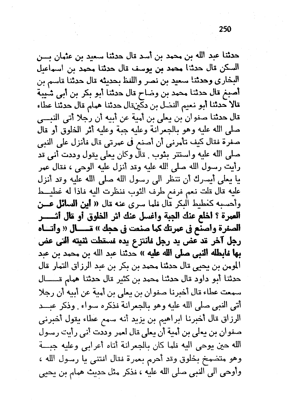 حَدَّثَنَا عَبْدُ اللَّهِ بْنُ مُحَمَّدِ بْنِ أَسَدٍ قَالَ حَدَّثَنَا سَعِيدُ بْنُ عُثْمَانَ بْنِ السَّكَنِ قَالَ حَدَّثَنَا مُحَمَّدُ بْنُ يُوسُفَ قَالَ حَدَّثَنَا مُحَمَّدُ بْنُ إِسْمَاعِيلَ الْبُخَارِيُّ وَحَدَّثَنَا سَعِيدُ بْنُ نَصْرٍ وَاللَّفْظُ بِحَدِيثِهِ قَالَ حَدَّثَنَا قَاسِمُ بْنُ أَصْبَغَ قَالَ حَدَّثَنَا مُحَمَّدُ بْنُ وَضَّاحٍ قَالَ حَدَّثَنَا أَبُو بَكْرِ بْنُ أَبِي شَيْبَةَ قَالَا حَدَّثَنَا أَبُو نُعَيْمٍ الْفَضْلُ بْنُ دُكَيْنٍ قَالَ حَدَّثَنَا هَمَّامٌ قَالَ حَدَّثَنَا عَطَاءٌ قَالَ حَدَّثَنَا صفوان بن يعلى بن أمية عن أبيه أَنَّ رَجُلًا أَتَى النَّبِيَّ صَلَّى اللَّهُ عَلَيْهِ وَسَلَّمَ وَهُوَ بِالْجِعْرَانَةِ وَعَلَيْهِ جُبَّةٌ وَعَلَيْهِ أَثَرُ الْخَلُوقِ أَوْ قَالَ صُفْرَةٌ فَقَالَ كَيْفَ تَأْمُرُنِي أَنْ أَصْنَعَ فِي عُمْرَتِي قَالَ فَأُنْزِلَ عَلَى النَّبِيِّ صَلَّى اللَّهُ عَلَيْهِ وَسَلَّمَ وَاسْتَتَرَ بِثَوْبٍ قَالَ وَكَانَ يَعْلَى يَقُولُ وَدِدْتُ أَنِّي قَدْ رَأَيْتُ رَسُولَ اللَّهِ صَلَّى اللَّهُ عَلَيْهِ وَسَلَّمَ وَقَدْ أُنْزِلَ عَلَيْهِ الْوَحْيَ فَقَالَ عُمَرُ يَا يَعْلَى أَيَسُرُّكَ أَنْ تَنْظُرَ إِلَى رَسُولِ اللَّهِ صَلَّى اللَّهُ عَلَيْهِ وَسَلَّمَ وَقَدْ أُنْزِلَ عَلَيْهِ قَالَ قُلْتُ نَعَمْ فَرَفَعَ طَرَفَ الثَّوْبِ فَنَظَرْتُ إِلَيْهِ فَإِذَا لَهُ غَطِيطٌ وَأَحْسَبُهُ كَغَطِيطِ الْبِكْرِ قَالَ فَلَمَّا سُرِّيَ عَنْهُ قَالَ أَيْنَ السَّائِلُ عَنِ الْعُمْرَةِ اخْلَعْ عَنْكَ الْجُبَّةَ وَاغْسِلْ عَنْكَ أَثَرَ الْخَلُوقِ أَوْ قَالَ أَثَرَ الصُّفْرَةِ وَاصْنَعْ فِي عُمْرَتِكَ كَمَا صَنَعْتَ فِي حَجِّكَ قَالَ وَأَتَاهُ رَجُلٌ آخَرُ قَدْ عَضَّ يَدَ رَجُلٍ فَانْتَزَعَ يَدَهُ فَسَقَطَتْ ثَنِيَّتُهُ الَّتِي عَضَّ بِهَا فَأَبْطَلَهُ النَّبِيُّ صَلَّى اللَّهُ عَلَيْهِ وَسَلَّمَ حَدَّثَنَا عَبْدُ اللَّهِ بْنُ مُحَمَّدِ بْنِ عَبْدِ الْمُؤْمِنِ بْنِ يَحْيَى قَالَ حَدَّثَنَا مُحَمَّدُ بْنُ بَكْرِ بْنِ عَبْدِ الرَّزَّاقِ التَّمَّارُ قَالَ حَدَّثَنَا أَبُو دَاوُدَ قَالَ حَدَّثَنَا مُحَمَّدُ بْنُ كَثِيرٍ قَالَ حَدَّثَنَا هَمَّامٌ قَالَ سَمِعْتُ عَطَاءً قَالَ أَخْبَرَنَا صفوان بن يعلى بن أمية عن أبيه أَنَّ رَجُلًا أَتَى النَّبِيَّ صَلَّى اللَّهُ عَلَيْهِ وَسَلَّمَ وَهُوَ بِالْجِعْرَانَةِ فَذَكَرَهُ سَوَاءً وَذَكَرَ عَبْدُ الرَّزَّاقِ قَالَ أَخْبَرَنَا إِبْرَاهِيمُ بْنُ يَزِيدَ أَنَّهُ سَمِعَ عَطَاءً يَقُولُ أَخْبَرَنِي صَفْوَانُ بْنُ يَعْلَى بْنِ أُمَيَّةَ أَنَّ يَعْلَى قَالَ لِعُمَرَ وَدِدْتُ أَنِّي رَأَيْتُ رَسُولَ اللَّهِ حِينَ يُوحَى إِلَيْهِ فَلَمَّا كَانَ بِالْجِعْرَانَةِ أَتَاهُ أَعْرَابِيٌّ وَعَلَيْهِ جُبَّةٌ وَهُوَ مُتَضَمِّخٌ بِخَلُوقٍ وَقَدْ أَحْرَمَ بِعُمْرَةٍ فَقَالَ أَفْتِنِي يَا رَسُولَ اللَّهِ وَأُوحِيَ إِلَى النَّبِيِّ صَلَّى اللَّهُ عَلَيْهِ وَسَلَّمَ فَذَكَرَ مِثْلَ حَدِيثِ هَمَّامِ بْنِ يَحْيَى