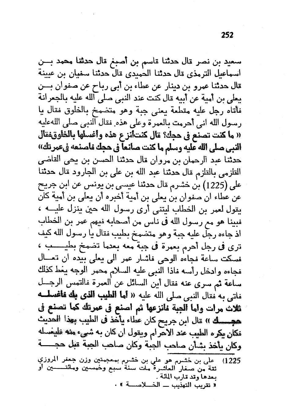 سَعِيدُ بْنُ نَصْرٍ قَالَ حَدَّثَنَا قَاسِمُ بْنُ أَصْبَغَ قَالَ حَدَّثَنَا مُحَمَّدُ بْنُ إِسْمَاعِيلَ التِّرْمِذِيُّ قَالَ حَدَّثَنَا الْحُمَيْدِيُّ قَالَ حَدَّثَنَا سُفْيَانُ بْنُ عُيَيْنَةَ قَالَ حَدَّثَنَا عَمْرُو بْنُ دِينَارٍ عَنْ عَطَاءِ بْنِ أَبِي رَبَاحٍ عَنْ صَفْوَانَ بْنِ يَعْلَى بْنِ أُمَيَّةَ عَنْ أَبِيهِ قَالَ كُنْتُ عِنْدَ النَّبِيِّ صَلَّى اللَّهُ عَلَيْهِ وَسَلَّمَ بِالْجِعْرَانَةِ فَأَتَاهُ رَجُلٌ عَلَيْهِ مُقَطَّعَةٌ يَعْنِي جُبَّةٌ وَهُوَ مُتَضَمِّخٌ بِالْخَلُوقِ فَقَالَ يَا رَسُولَ اللَّهِ إِنِّي أَحْرَمْتُ بِالْعُمْرَةِ وَعَلَيَّ هَذِهِ فَقَالَ النَّبِيُّ صَلَّى اللَّهُ عَلَيْهِ وَسَلَّمَ مَا كُنْتَ تَصْنَعُ فِي حَجِّكَ قَالَ كُنْتُ أَنْزِعُ هَذِهِ وَأَغْسِلُهَا بِالْخَلُوقِ فَقَالَ النَّبِيُّ صَلَّى اللَّهُ عَلَيْهِ وَسَلَّمَ مَا كُنْتَ صَانِعًا فِي حَجِّكَ فَاصْنَعْهُ فِي عُمْرَتِكَ حدثنا عبد الرحمان بْنُ مَرْوَانَ قَالَ حَدَّثَنَا الْحَسَنُ بْنُ يَحْيَى الْقَاضِي الْقَلْزُمِيُّ بِالْقَلْزُمِ قَالَ حَدَّثَنَا عَبْدُ اللَّهِ بْنُ عَلِيِّ بْنِ الْجَارُودِ قَالَ حَدَّثَنَا عَلِيُّ بْنُ خَشْرَمٍ قَالَ حَدَّثَنَا عِيسَى بْنُ يُونُسَ عَنِ ابْنِ جُرَيْجٍ! عَنْ عَطَاءٍ أَنَّ صَفْوَانَ بْنَ يَعْلَى بْنِ أُمَيَّةَ أَخْبَرَهُ أَنَّ يَعْلَى بْنَ أُمَيَّةَ كَانَ يَقُولُ لِعُمَرَ بْنِ الْخَطَّابِ لَيْتَنِي أَرَى رَسُولَ اللَّهِ حِينَ يُنْزَلُ عَلَيْهِ فَبَيْنَا هُوَ مَعَ رَسُولِ اللَّهِ فِي نَاسٍ مِنْ أَصْحَابِهِ فِيهِمْ عُمَرُ بْنُ الْخَطَّابِ إِذْ جَاءَهُ رَجُلٌ عَلَيْهِ جُبَّةٌ وَهُوَ مُتَضَمِّخٌ بِطِيبٍ فَقَالَ يَا رَسُولَ اللَّهِ كَيْفَ تَرَى فِي رَجُلٍ أَحْرَمَ بِعُمْرَةٍ فِي جُبَّةٍ مَعَهُ بَعْدَمَا تَضَمَّخَ بِطِيبٍ فَسَكَتَ سَاعَةً فَجَاءَهُ الْوَحْيُ فَأَشَارَ عمر إلى يعلى بيده أن تعالى فَجَاءَهُ وَأَدْخَلَ رَأْسَهُ فَإِذَا النَّبِيُّ عَلَيْهِ السَّلَامُ مُحْمَرُّ الْوَجْهِ يَغِطُّ كَذَلِكَ سَاعَةً ثُمَّ سُرِّيَ عَنْهُ فَقَالَ أَيْنَ السَّائِلُ عَنِ الْعُمْرَةِ فَالْتَمَسَ الرَّجُلَ فَأُتِيَ بِهِ فَقَالَ النَّبِيُّ صَلَّى اللَّهُ عَلَيْهِ وَسَلَّمَ أَمَّا الطِّيبُ الَّذِي بِكَ فَاغْسِلْهُ ثَلَاثَ مَرَّاتٍ وَأَمَّا الْجُبَّةُ فَانْزِعْهَا ثُمَّ اصْنَعْ فِي عُمْرَتِكَ كَمَا تَصْنَعُ فِي حَجِّكَ قَالَ ابْنُ جُرَيْحٍ كَانَ عَطَاءٌ يَأْخُذُ فِي الطِّيبِ بِهَذَا الْحَدِيثِ فَكَانَ يَكْرَهُ الطِّيبَ عِنْدَ الْإِحْرَامِ وَيَقُولُ إِنْ كَانَ بِهِ شَيْءٌ مِنْهُ فَلْيَغْسِلْهُ وَكَانَ يَأْخُذُ بِشَأْنِ صَاحِبِ الْجُبَّةِ وَكَانَ صَاحِبُ الْجُبَّةِ قَبْلَ حَجَّةِ