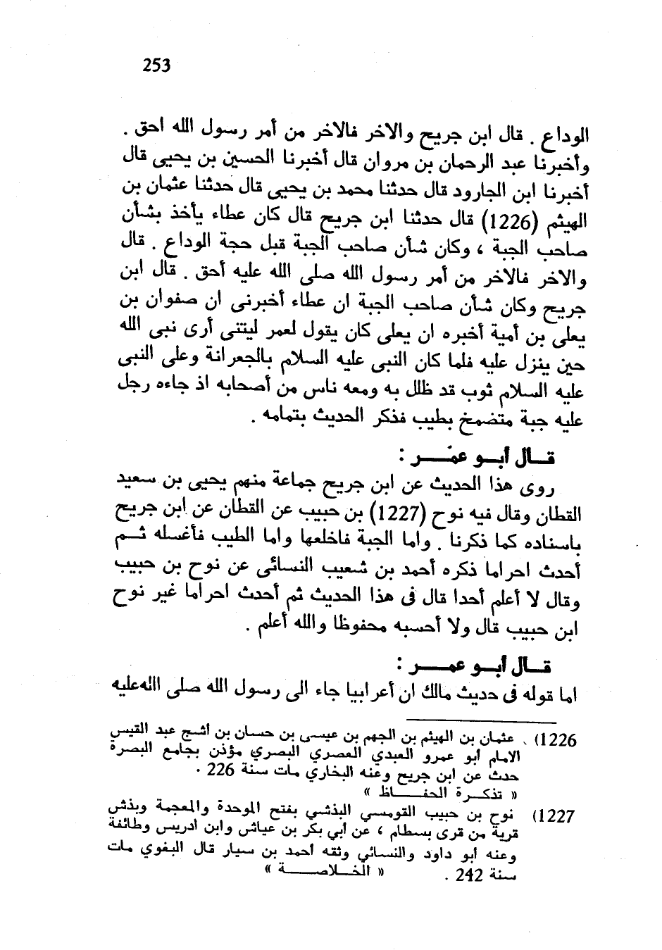 الْوَدَاعِ قَالَ ابْنُ جُرَيْحٍ وَالْآخِرُ فَالْآخِرُ مِنْ أمر رسول الله أحق واخبرنا عبد الرحمان بْنُ مَرْوَانَ قَالَ أَخْبَرَنَا الْحُسَيْنُ بْنُ يَحْيَى قَالَ أَخْبَرَنَا ابْنُ الْجَارُودِ قَالَ حَدَّثَنَا مُحَمَّدُ بْنُ يَحْيَى قَالَ حَدَّثَنَا عُثْمَانُ بْنُ الْهَيْثَمِ قَالَ حَدَّثَنَا ابْنُ جُرَيْحٍ قَالَ كَانَ عَطَاءٌ يَأْخُذُ بِشَأْنِ صَاحِبِ الْجُبَّةِ وَكَانَ شَأْنُ صَاحِبِ الْجُبَّةِ قَبْلَ حَجَّةِ الْوَدَاعِ قَالَ وَالْآخِرُ فَالْآخِرُ مِنْ أَمْرِ رَسُولِ اللَّهِ صَلَّى اللَّهُ عَلَيْهِ وَسَلَّمَ أَحَقُّ قَالَ ابْنُ جُرَيْحٍ وَكَانَ شَأْنُ صَاحِبِ الْجُبَّةِ أَنَّ عَطَاءً أَخْبَرَنِي أَنَّ صَفْوَانَ بْنَ يَعْلَى بْنِ أُمَيَّةَ أَخْبَرَهُ أَنَّ يَعْلَى كَانَ يَقُولُ لِعُمَرَ لَيْتَنِي أَرَى نَبِيَّ اللَّهِ حِينَ يُنْزَلُ عَلَيْهِ فَلَمَّا كَانَ النَّبِيُّ عَلَيْهِ السَّلَامُ بِالْجِعْرَانَةِ وَعَلَى النَّبِيِّ عَلَيْهِ السَّلَامُ ثَوْبٌ قَدْ ظُلِّلَ بِهِ وَمَعَهُ نَاسٌ مِنْ أَصْحَابِهِ إِذْ جَاءَهُ رَجُلٌ عَلَيْهِ جُبَّةٌ مُتَضَمِّخٌ بِطِيبٍ فَذَكَرَ الْحَدِيثَ بِتَمَامِهِ قَالَ أَبُو عُمَرَ رَوَى هَذَا الْحَدِيثَ عَنِ ابْنِ جُرَيْحٍ جَمَاعَةٌ مِنْهُمْ يَحْيَى بْنُ سَعِيدٍ الْقَطَّانُ وَقَالَ فِيهِ نُوحُ بْنُ حَبِيبٍ عَنِ الْقِطَّانِ عَنِ ابْنِ جُرَيْحٍ بِإِسْنَادِهِ كَمَا ذَكَرْنَا وَأَمَّا الْجُبَّةُ فَاخْلَعْهَا وَأَمَّا الطِّيبُ فَاغْسِلْهُ ثُمَّ أَحْدَثَ إِحْرَامًا ذَكَرَهُ أَحْمَدُ بْنُ شُعَيْبٍ النَّسَائِيُّ عَنْ نُوحِ بْنِ حَبِيبٍ وَقَالَ لَا أَعْلَمُ أَحَدًا قَالَ فِي هَذَا الْحَدِيثِ ثم احدث احراما غير نوح ابن حَبِيبٍ قَالَ وَلَا أَحْسَبُهُ مَحْفُوظًا وَاللَّهُ أَعْلَمُ قَالَ أَبُو عُمَرَ أَمَّا قَوْلُهُ فِي حَدِيثِ مَالِكٍ إِنَّ أَعْرَابِيًّا جَاءَ إِلَى رَسُولِ اللَّهِ صَلَّى اللَّهُ عَلَيْهِ وَسَلَّمَ