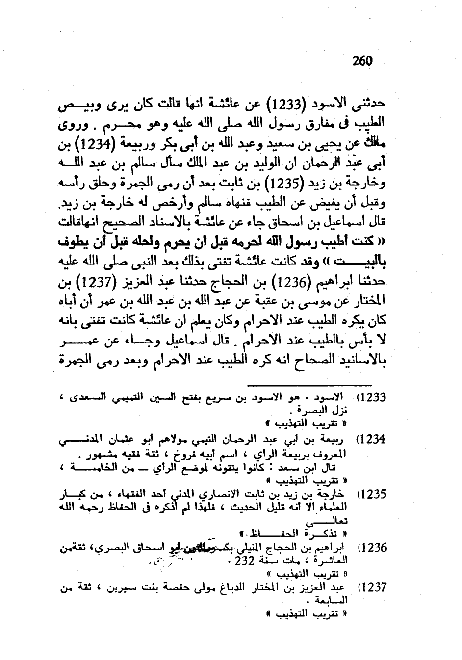 حَدَّثَنِي الْأَسْوَدُ عَنْ عَائِشَةَ أَنَّهَا قَالَتْ كَانَ يُرَى وَبِيصُ الطِّيبِ فِي مَفَارِقِ رَسُولِ اللَّهِ صَلَّى اللَّهُ عَلَيْهِ وَسَلَّمَ وَهُوَ مُحْرِمٌ وَرَوَى مَالِكٌ عَنْ يَحْيَى بْنِ سَعِيدٍ وَعَبْدِ اللَّهِ بْنِ أَبِي بَكْرٍ وَرَبِيعَةَ بْنِ أَبِي عَبْدِ الرحمان أَنَّ الْوَلِيدَ بْنَ عَبْدِ الْمَلِكِ سَأَلَ سَالِمَ بْنَ عَبْدِ اللَّهِ وَخَارِجَةَ بْنَ زَيْدِ بْنِ ثَابِتٍ بَعْدَ أَنْ رَمَى الْجَمْرَةَ وَحَلَقَ رَأْسَهُ وَقَبْلَ أَنْ يُفِيضَ عَنِ الطِّيبِ فَنَهَاهُ سَالِمٌ وَأَرْخَصَ لَهُ خَارِجَةُ بْنُ زَيْدٍ قَالَ إِسْمَاعِيلُ بْنُ إِسْحَاقَ جَاءَ عَنْ عَائِشَةَ بِالْإِسْنَادِ الصَّحِيحِ أَنَّهَا قَالَتْ كُنْتُ أَطَيِّبُ رَسُولَ اللَّهِ لِحُرْمِهِ قَبْلَ أَنْ يُحْرِمَ وَلِحِلِّهِ قَبْلَ أَنْ يَطُوفَ بِالْبَيْتِ وَقَدْ كَانَتْ عَائِشَةُ تُفْتِي بِذَلِكَ بَعْدَ النَّبِيِّ صَلَّى اللَّهُ عَلَيْهِ وَسَلَّمَ حَدَّثَنَا إِبْرَاهِيمُ بْنُ الْحَجَّاجِ حَدَّثَنَا عَبْدُ الْعَزِيزُ بْنُ الْمُخْتَارِ عَنْ مُوسَى بْنِ عُقْبَةَ عَنْ عَبْدِ اللَّهِ بْنِ عَبْدِ اللَّهِ بْنِ عُمَرَ أَنَّ أَبَاهُ كان يكره الطيب عندالاحرام وَكَانَ يَعْلَمُ أَنَّ عَائِشَةَ كَانَتْ تُفْتِي بِأَنَّهُ لَا بَأْسَ بِالطِّيبِ عِنْدَ الْإِحْرَامِ قَالَ إِسْمَاعِيلُ وَجَاءَ عَنْ عُمَرَ بِالْأَسَانِيدِ الصِّحَاحِ أَنَّهُ كَرِهَ الطِّيبَ عِنْدَ الْإِحْرَامِ وَبَعْدَ رَمْيِ الْجَمْرَةِ