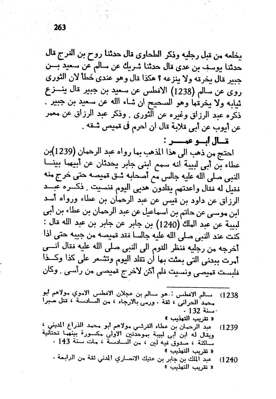 يَخْلَعُهُ مِنْ قِبَلِ رِجْلَيْهِ وَذَكَرَ الطَّحَاوِيُّ قَالَ حَدَّثَنَا رَوْحُ بْنُ الْفَرَجِ قَالَ حَدَّثَنَا يُوسُفُ بْنُ عَدِيٍّ قَالَ حَدَّثَنَا شَرِيكٌ عَنْ سَالِمٍ عَنْ سَعِيدِ بْنِ جُبَيْرٍ قَالَ يَخْرِقُهُ وَلَا يَنْزِعُهُ هَكَذَا قَالَ وَهُوَ عِنْدِي خَطَأٌ لِأَنَّ الثَّوْرِيَّ رَوَى عَنْ سَالِمٍ (1238 9 الْأَفْطَسِ عَنْ سَعِيدِ بْنِ جُبَيْرِ قَالَ يَنْزِعُ ثِيَابَهُ وَلَا يَخْرِقُهَا وَهُوَ الصَّحِيحُ إِنْ شَاءَ اللَّهُ عَنْ سَعِيدِ بْنِ جُبَيْرٍ ذَكَرَهُ عَبْدُ الرَّزَّاقِ وَغَيْرُهُ عَنِ الثَّوْرِيِّ وَذَكَرَ عَبْدُ الرَّزَّاقِ عَنْ مَعْمَرٍ عَنْ أَيُّوبَ عَنْ أَبِي قِلَابَةَ قَالَ إِنْ أَحْرَمَ فِي قَمِيصٍ شَقَّهُ قَالَ أَبُو عُمَرَ احْتَجَّ مَنْ ذَهَبَ إِلَى هَذَا الْمَذْهَبِ بِمَا رَوَاهُ عبد الرحمان (1239) بْنُ عَطَاءِ بْنِ أَبِي لَبِيبَةَ أَنَّهُ سَمِعَ ابْنَيْ جَابِرٍ يُحَدِّثَانِ عَنْ أَبِيهِمَا بَيْنَا النَّبِيُّ صَلَّى اللَّهُ عَلَيْهِ وَسَلَّمَ جَالِسٌ مَعَ أَصْحَابِهِ شَقَّ قَمِيصَهُ حَتَّى خَرَجَ مِنْهُ فَقِيلَ لَهُ فقال واعتدهم يُقَلِّدُونَ هَدْيِيَ الْيَوْمَ فَنَسِيتُ ذَكَرَهُ عَبْدُ الرَّزَّاقِ عَنْ دَاوُدَ بْنِ قَيْسٍ عَنْ عبد الرحمان بن عطاء ورواه أسد ابن مُوسَى عَنْ حَاتِمِ بْنِ إِسْمَاعِيلَ عَنْ عَبْدِ الرحمان بْنِ عَطَاءِ بْنِ أَبِي لَبِيبَةَ عَنْ عَبْدِ الْمَلِكِ بْنِ جَابِرٍ عَنْ جَابِرِ بْنِ عَبْدِ الله قال كنت عندالنبي صَلَّى اللَّهُ عَلَيْهِ وَسَلَّمَ جَالِسًا فَقَدَّ قَمِيصَهُ مِنْ جَيْبِهِ حَتَّى إِذَا أَخْرَجَهُ مِنْ رِجْلَيْهِ فَنَظَرَ الْقَوْمُ إِلَى النَّبِيِّ صَلَّى اللَّهُ عَلَيْهِ وَسَلَّمَ فَقَالَ إِنِّي أَمَرْتُ بِبُدْنِيَ الَّتِي بَعَثْتُ بِهَا أَنْ تُقَلَّدَ الْيَوْمَ وَتُشْعَرَ عَلَى كَذَا وَكَذَا فَلَبِسْتُ قَمِيصِي وَنَسِيتُ فَلَمْ أَكُنْ لِأُخْرِجَ قَمِيصِي مِنْ رَأْسِي وَكَانَ