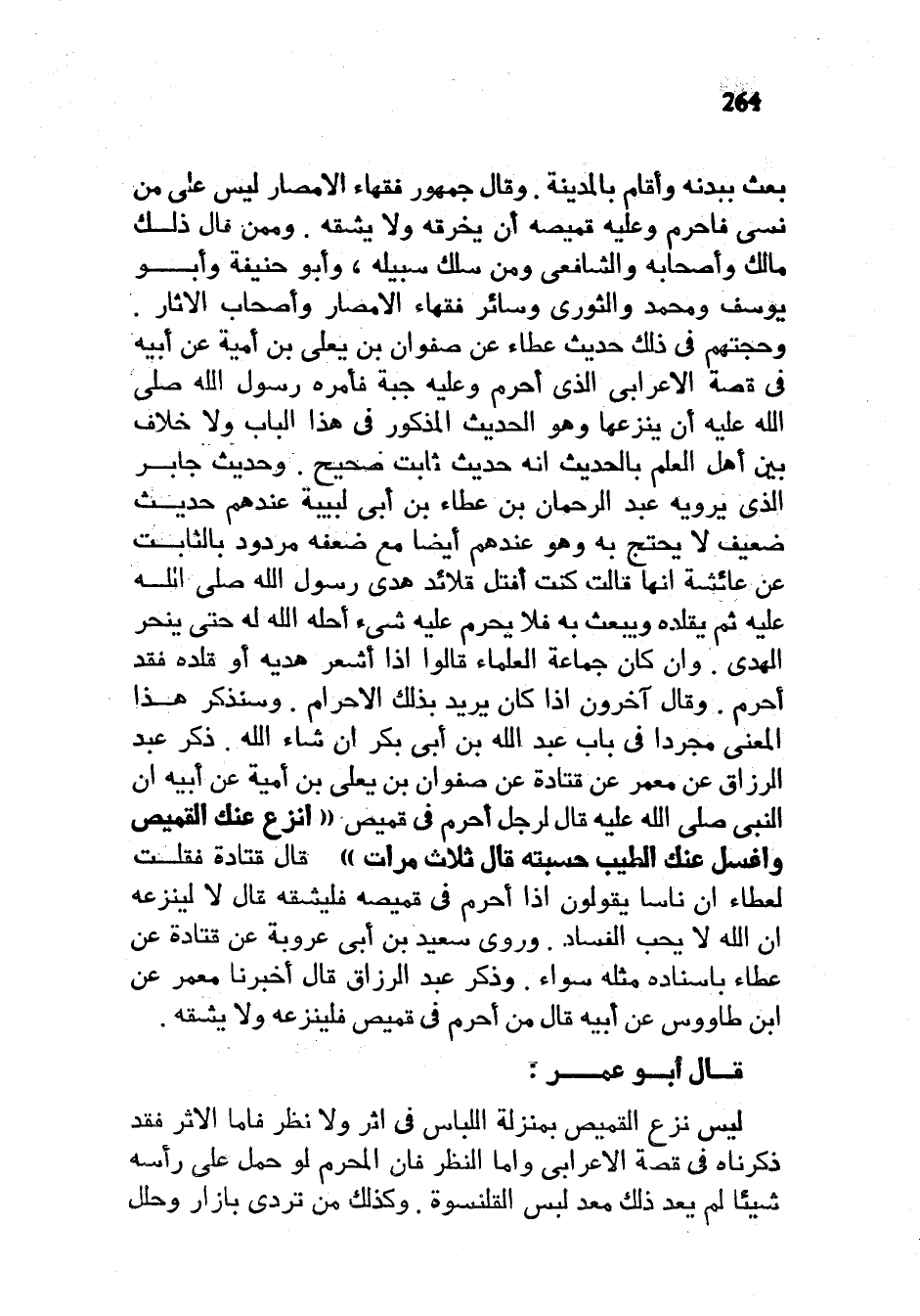 بَعَثَ بِبُدْنِهِ وَأَقَامَ بِالْمَدِينَةِ وَقَالَ جُمْهُورُ فُقَهَاءِ الْأَمْصَارِ لَيْسَ عَلَى مَنْ نَسِيَ فَأَحْرَمَ وَعَلَيْهِ قَمِيصُهُ أَنْ يَخْرِقَهُ وَلَا يَشُقَّهُ وَمِمَّنْ قَالَ ذَلِكَ مَالِكٌ وَأَصْحَابُهُ وَالشَّافِعِيُّ وَمَنْ سَلَكَ سَبِيلَهُ وَأَبُو حَنِيفَةَ وَأَبُو يُوسُفَ وَمُحَمَّدٌ وَالثَّوْرِيُّ وَسَائِرُ فُقَهَاءِ الْأَمْصَارِ وَأَصْحَابُ الْآثَارِ وَحُجَّتُهُمْ فِي ذَلِكَ حَدِيثُ عَطَاءٍ عَنْ صَفْوَانَ بْنِ يَعْلَى بْنِ أُمَيَّةَ عَنْ أَبِيهِ فِي قِصَّةِ الْأَعْرَابِيِّ الَّذِي أَحْرَمَ وَعَلَيْهِ جُبَّةٌ فَأَمَرَهُ رَسُولُ اللَّهِ صَلَّى اللَّهُ عَلَيْهِ وَسَلَّمَ أَنْ يَنْزِعَهَا وَهُوَ الْحَدِيثُ الْمَذْكُورُ فِي هَذَا الْبَابِ وَلَا خِلَافَ بَيْنَ أَهْلِ الْعِلْمِ بِالْحَدِيثِ أَنَّهُ حَدِيثٌ ثَابِتٌ صَحِيحٌ وحديث جابر الذي يرويه عبد الرحمان بْنُ عَطَاءِ بْنِ أَبِي لَبِيبَةَ عِنْدَهُمْ حَدِيثٌ ضَعِيفٌ لَا يُحْتَجُّ بِهِ وَهُوَ عِنْدَهُمْ أَيْضًا مَعَ ضَعْفِهِ مَرْدُودٌ بِالثَّابِتِ عَنْ عَائِشَةَ أَنَّهَا قَالَتْ كُنْتُ أَفْتِلُ قَلَائِدَ هَدْيِ رَسُولِ اللَّهِ صَلَّى اللَّهُ عَلَيْهِ وَسَلَّمَ ثُمَّ يُقَلِّدُهُ وَيَبْعَثُ بِهِ فَلَا يَحْرُمُ عَلَيْهِ شَيْءٌ أَحَلَّهُ اللَّهُ لَهُ حَتَّى يَنْحَرَ الْهَدْيَ وَإِنْ كَانَ جَمَاعَةُ الْعُلَمَاءِ قَالُوا إِذَا أَشْعَرَ هَدْيَهُ أَوْ قَلَّدَهُ فَقَدْ أَحْرَمَ وَقَالَ آخَرُونَ إِذَا كَانَ يُرِيدُ بِذَلِكَ الْإِحْرَامَ وَسَنَذْكُرُ هَذَا الْمَعْنَى مُجَرَّدًا فِي بَابِ عَبْدِ اللَّهِ بْنِ أَبِي بَكْرٍ إِنْ شَاءَ اللَّهُ وَذَكَرَ عَبْدُ الرَّزَّاقِ عَنْ مَعْمَرٍ عَنْ قَتَادَةَ عَنْ صَفْوَانَ بْنِ يَعْلَى بْنِ أُمَيَّةَ عَنْ أَبِيهِ أَنَّ النَّبِيَّ صَلَّى اللَّهُ عَلَيْهِ وَسَلَّمَ قَالَ لِرَجُلٍ أَحْرَمَ فِي قَمِيصٍ انْزِعْ عَنْكَ الْقَمِيصَ وَاغْسِلْ عَنْكَ الطِّيبَ حَسِبْتُهُ قَالَ ثَلَاثَ مَرَّاتٍ قَالَ قَتَادَةُ فَقُلْتُ لِعَطَاءٍ إِنَّ نَاسًا يَقُولُونَ إِذَا أَحْرَمَ فِي قَمِيصِهِ فَلْيَشُقَّهُ قَالَ لَا لِيَنْزِعْهُ إِنَّ اللَّهَ لَا يُحِبُّ الْفَسَادَ وَرَوَى سَعِيدُ بْنُ أَبِي عَرُوبَةَ عَنْ قَتَادَةَ عَنْ عَطَاءٍ بِإِسْنَادِهِ مِثْلَهُ سَوَاءً وَذَكَرَ عَبْدُ الرَّزَّاقِ قَالَ أَخْبَرَنَا مَعْمَرٌ عَنِ ابْنِ طَاوُسٍ عَنْ أَبِيهِ قَالَ مَنْ أَحْرَمَ فِي قَمِيصٍ فَلْيَنْزِعْهُ وَلَا يَشُقَّهُ قَالَ أَبُو عُمَرَ لَيْسَ نَزْعُ الْقَمِيصِ بِمَنْزِلَةِ اللِّبَاسِ فِي أَثَرٍ وَلَا نَظَرٍ فَأَمَّا الْأَثَرُ فَقَدْ ذَكَرْنَاهُ فِي قِصَّةِ الْأَعْرَابِيِّ وَأَمَّا النَّظَرُ فَإِنَّ الْمُحْرِمَ لَوْ حَمَلَ عَلَى رَأْسِهِ شَيْئًا لَمْ يُعَدَّ ذلك معد لُبْسِ الْقَلَنْسُوَةِ وَكَذَلِكَ مَنْ تَرَدَّى بِإِزَارٍ وَحُلَلٍ