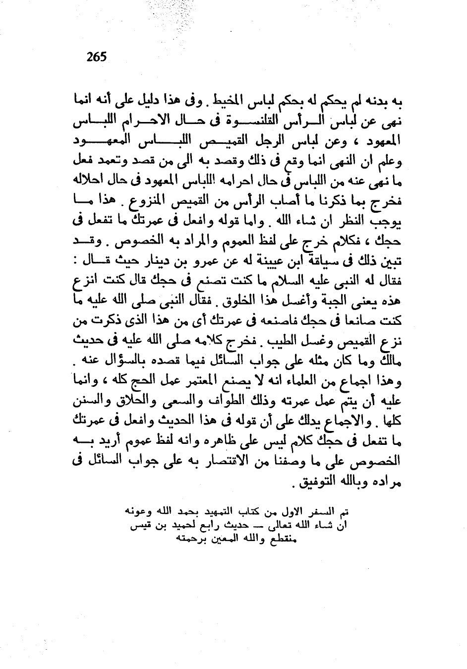 بِهِ بَدَنُهُ لَمْ يُحْكَمْ لَهُ بِحُكْمِ لِبَاسِ الْمَخِيطِ وَفِي هَذَا دَلِيلٌ عَلَى أَنَّهُ إِنَّمَا نَهَى عَنْ لِبَاسِ الرَّأْسِ الْقَلَنْسُوَةِ فِي حَالِ الْإِحْرَامِ اللِّبَاسَ الْمَعْهُودَ وَعَنْ لِبَاسِ الرَّجُلِ الْقَمِيصَ اللِّبَاسَ الْمَعْهُودَ وَعَلِمَ أَنَّ النَّهْيَ إِنَّمَا وَقَعَ فِي ذَلِكَ وَقَصَدَ بِهِ إِلَى مَنْ قَصَدَ وَتَعَمَّدَ فِعْلَ مَا نُهِيَ عَنْهُ مِنَ اللِّبَاسِ فِي حَالِ إِحْرَامِهِ اللِّبَاسَ الْمَعْهُودَ فِي حَالِ إِحْلَالِهِ فَخَرَجَ بِمَا ذَكَرْنَا مَا أَصَابَ الرَّأْسَ مِنَ الْقَمِيصِ الْمَنْزُوعِ هَذَا مَا يُوجِبُ النَّظَرَ إِنْ شَاءَ اللَّهُ وَأَمَّا قَوْلُهُ وَافْعَلْ فِي عُمْرَتِكَ مَا تَفْعَلُ فِي حَجِّكَ فَكَلَامٌ خَرَجَ عَلَى لَفْظِ الْعُمُومِ وَالْمُرَادُ بِهِ الْخُصُوصُ وَقَدْ تَبَيَّنَ ذَلِكَ فِي سِيَاقَةٍ ابْنِ عُيَيْنَةَ لَهُ عَنْ عَمْرِو بْنِ دِينَارٍ حَيْثُ قَالَ فَقَالَ لَهُ النَّبِيُّ عَلَيْهِ السَّلَامُ مَا كُنْتَ تَصْنَعُ فِي حَجِّكَ قَالَ كُنْتُ أَنْزِعُ هَذِهِ يَعْنِي الْجُبَّةَ وَأَغْسِلُ هَذَا الْخَلُوقَ فَقَالَ النَّبِيُّ صَلَّى اللَّهُ عَلَيْهِ وَسَلَّمَ مَا كُنْتَ صَانِعًا فِي حَجِّكَ فَاصْنَعْهُ فِي عُمْرَتِكَ أَيْ مِنْ هَذَا الَّذِي ذَكَرْتَ مِنْ نَزْعِ الْقَمِيصِ وَغَسْلِ الطِّيبِ فَخَرَجَ كَلَامُهُ صَلَّى اللَّهُ عَلَيْهِ وَسَلَّمَ فِي حَدِيثِ مَالِكٍ وَمَا كَانَ مِثْلَهُ عَلَى جَوَابِ السَّائِلِ فِيمَا قَصَدَهُ بِالسُّؤَالِ عَنْهُ وَهَذَا إِجْمَاعٌ مِنَ الْعُلَمَاءِ أَنَّهُ لَا يَصْنَعُ الْمُعْتَمِرُ عَمَلَ الْحَجِّ كُلَّهُ وَإِنَّمَا عَلَيْهِ أَنْ يُتِمَّ عَمَلَ عُمْرَتِهِ وَذَلِكَ الطَّوَافُ وَالسَّعْيُ وَالْحِلَاقُ وَالسُّنَنُ كُلُّهَا وَالْإِجْمَاعُ يَدُلُّكَ عَلَى أَنَّ قَوْلَهُ فِي هَذَا الْحَدِيثِ وَافْعَلْ فِي عُمْرَتِكَ مَا تَفْعَلُ فِي حَجِّكَ كَلَامٌ لَيْسَ عَلَى ظَاهِرِهِ وَأَنَّهُ لَفْظُ عُمُومٍ أُرِيدَ بِهِ الْخُصُوصُ عَلَى مَا وَصَفْنَا مِنَ الِاقْتِصَارِ بِهِ عَلَى جَوَابِ السَّائِلِ فِي مراده وبالله التوفيق تم السفر الاول من كتاب التمهيد بحمد الله وعونه إن شاء الله تعالى حديث رابع لحميد بن قيس منقطع والله المعين برحمته