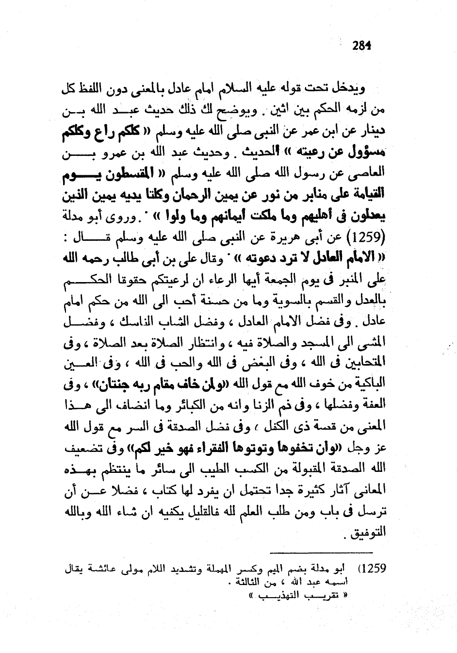 وَيَدْخُلُ تَحْتَ قَوْلِهِ عَلَيْهِ السَّلَامُ إِمَامٌ عَادِلٌ بِالْمَعْنَى دُونَ اللَّفْظِ كُلُّ مَنْ لَزِمَهُ الْحُكْمُ بَيْنَ اثْنَيْنِ وَيُوَضِّحُ لَكَ ذَلِكَ حَدِيثُ عَبْدِ اللَّهِ بْنِ دِينَارٍ عَنِ ابْنِ عُمَرَ عَنِ النَّبِيِّ صَلَّى اللَّهُ عَلَيْهِ وَسَلَّمَ كُلُّكُمْ رَاعٍ وَكُلُّكُمْ مسؤول عَنْ رَعِيَّتِهِ الْحَدِيثَ وَحَدِيثُ عَبْدِ اللَّهِ بْنِ عَمْرِو بْنِ الْعَاصِي عَنْ رَسُولِ اللَّهِ صَلَّى اللَّهُ عَلَيْهِ وَسَلَّمَ الْمُقْسِطُونَ يَوْمَ الْقِيَامَةِ عَلَى مَنَابِرَ مِنْ نُورٍ عن يمين الرحمان وَكِلْتَا يَدَيْهِ يَمِينٌ الَّذِينَ يَعْدِلُونَ فِي أَهْلِيهِمْ وَمَا مَلَكَتْ أَيْمَانُهُمْ وَمَا وَلُوا وَرَوَى أَبُو مُدِلَّةَ عَنْ أَبِي هُرَيْرَةَ عَنِ النَّبِيِّ صَلَّى اللَّهُ عَلَيْهِ وَسَلَّمَ قَالَ الْإِمَامُ الْعَادِلُ لَا تُرَدُّ دَعْوَتُهُ وَقَالَ عَلِيُّ بْنُ أَبِي طَالِبٍ رَحِمَهُ اللَّهُ عَلَى الْمِنْبَرِ فِي يَوْمِ الْجُمُعَةِ أَيُّهَا الرِّعَاءُ إِنَّ لِرَعِيَّتِكُمْ حُقُوقًا الْحُكْمُ بِالْعَدْلِ وَالْقَسْمُ بِالسَّوِيَّةِ وَمَا مِنْ حَسَنَةٍ أَحَبَّ إِلَى اللَّهِ مِنْ حُكْمِ إِمَامٍ عَادِلٍ وَفِي فَضْلِ الْإِمَامِ الْعَادِلِ وَفَضْلِ الشَّابِّ النَّاسِكِ وَفَضْلِ الْمَشْيِ إِلَى الْمَسْجِدِ وَالصَّلَاةِ فِيهِ وَانْتِظَارِ الصَّلَاةِ بَعْدَ الصَّلَاةِ وَفِي الْمُتَحَابِّينَ فِي اللَّهِ وَفِي الْبُغْضِ فِي اللَّهِ وَالْحُبِّ فِي اللَّهِ وَفِي الْعَيْنِ الْبَاكِيَةِ مِنْ خَوْفِ اللَّهِ مَعَ قَوْلِ اللَّهِ وَلِمَنْ خَافَ مَقَامَ رَبِّهِ جَنَّتَانِ وَفِي الْعِفَّةِ فَضْلُهَا وَفِي ذَمِّ الزِّنَا وَأَنَّهُ مِنَ الْكَبَائِرِ وَمَا انْضَافَ إِلَى هَذَا الْمَعْنَى مِنْ قِصَّةِ ذِي الْكِفْلِ وَفِي فَضْلِ الصَّدَقَةِ فِي السِّرِّ مَعَ قَوْلِ اللَّهِ عَزَّ وَجَلَّ وَإِنْ تُخْفُوهَا وَتُؤْتُوهَا الْفُقَرَاءَ فَهُوَ خَيْرٌ لَكُمْ وَفِي تَضْعِيفِ اللَّهِ الصَّدَقَةَ الْمَقْبُولَةَ مِنَ الْكَسْبِ الطَّيِّبِ إِلَى سَائِرِ مَا يَنْتَظِمُ بِهَذِهِ الْمَعَانِي آثَارٌ كَثِيرَةٌ جِدًّا تَحْتَمِلُ أَنْ يُفْرَدَ لَهَا كِتَابٌ فَضْلًا عَنْ أَنْ تُرْسَلَ فِي بَابٍ وَمَنْ طَلَبَ الْعِلْمَ لِلَّهِ فَالْقَلِيلُ يَكْفِيهِ إِنْ شَاءَ اللَّهُ وبالله التوفيق