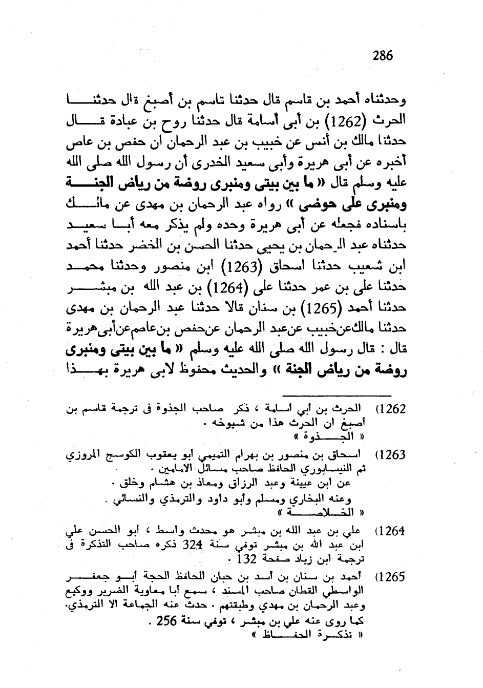 وَحَدَّثَنَاهُ أَحْمَدُ بْنُ قَاسِمٍ قَالَ حَدَّثَنَا قَاسِمُ بْنُ أَصْبَغَ قَالَ حَدَّثَنَا الْحَرْثُ بْنُ أَبِي أُسَامَةَ قَالَ حَدَّثَنَا رَوْحُ بْنُ عُبَادَةَ قَالَ حَدَّثَنَا مَالِكُ بْنُ أَنَسٍ عَنْ خبيب بن عبد الرحمان ان حفص بن عاص أَخْبَرَهُ عَنْ أَبِي هُرَيْرَةَ وَأَبِي سَعِيدٍ الْخُدْرِيِّ أَنَّ رَسُولَ اللَّهِ صَلَّى اللَّهُ عَلَيْهِ وَسَلَّمَ قَالَ مَا بَيْنَ بَيْتِي وَمِنْبَرِي رَوْضَةٌ مِنْ رياض الجن ومنبري على حوضي رواه عبد الرحمان بْنُ مَهْدِيٍّ عَنْ مَالِكٍ بِإِسْنَادِهِ فَجَعَلَهُ عَنْ أَبِي هُرَيْرَةَ وَحْدَهُ وَلَمْ يَذْكُرْ مَعَهُ أَبَا سعيد حدثناه عبد الرحمان بْنُ يَحْيَى حَدَّثَنَا الْحَسَنُ بْنُ الْخَضِرِ حَدَّثَنَا أحمد ابن شعيب حدثنا إسحاق ابن مَنْصُورٍ وَحَدَّثَنَا مُحَمَّدٌ حَدَّثَنَا عَلِيُّ بْنُ عُمَرَ حَدَّثَنَا عَلِيُّ بْنُ عَبْدِ اللَّهِ بْنِ مُبَشِّرٍ حَدَّثَنَا أَحْمَدُ بْنُ سِنَانٍ قَالَا حَدَّثَنَا عَبْدُ الرحمان بْنُ مَهْدِيٍّ حَدَّثَنَا مَالِكٌ عَنْ خُبَيْبٍ عَنْ عبد الرحمان عَنْ حَفْصِ بْنِ عَاصِمٍ عَنْ أَبِي هُرَيْرَةَ قَالَ قَالَ رَسُولُ اللَّهِ صَلَّى اللَّهُ عَلَيْهِ وَسَلَّمَ مَا بَيْنَ بَيْتِي وَمِنْبَرِي رَوْضَةٌ مِنْ رِيَاضِ الْجَنَّةِ وَالْحَدِيثُ مَحْفُوظٌ لِأَبِي هُرَيْرَةَ بِهَذَا