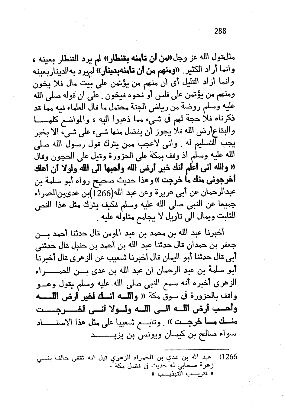 مِثْلُ قَوْلِ اللَّهِ عَزَّ وَجَلَّ مَنْ إِنْ تَأْمَنْهُ بِقِنْطَارٍ لَمْ يُرِدِ الْقِنْطَارَ بِعَيْنِهِ وَإِنَّمَا أَرَادَ الْكَثِيرَ وَمِنْهُمْ مَنْ إِنْ تَأْمَنْهُ بِدِينَارٍ لَمْ يُرِدْ بِهِ الدِّينَارَ بِعَيْنِهِ وَإِنَّمَا أَرَادَ الْقَلِيلَ أَيْ أَنَّ مِنْهُمْ مَنْ يُؤْتَمَنُ عَلَى بَيْتِ مَالٍ فَلَا يَخُونُ وَمِنْهُمْ مَنْ يُؤْتَمَنُ عَلَى فَلْسٍ أَوْ نَحْوِهُ فَيَخُونُ عَلَى أَنَّ قَوْلَهُ صَلَّى اللَّهُ عَلَيْهِ وَسَلَّمَ رَوْضَةٌ مِنْ رِيَاضِ الْجَنَّةِ مُحْتَمِلٌ مَا قَالَ الْعُلَمَاءُ فِيهِ مِمَّا قَدْ ذَكَرْنَاهُ فَلَا حُجَّةَ لَهُمْ فِي شَيْءٍ مِمَّا ذَهَبُوا إِلَيْهِ وَالْمَوَاضِعُ كُلُّهَا وَالْبِقَاعُ أَرْضُ اللَّهِ فَلَا يَجُوزُ أَنْ يُفَضَّلَ مِنْهَا شَيْءٌ عَلَى شَيْءٍ إِلَّا بِخَبَرٍ يَجِبُ التَّسْلِيمُ لَهُ وَإِنِّي لَأَعْجَبُ مِمَّنْ يَتْرُكُ قَوْلَ رَسُولِ اللَّهِ صَلَّى اللَّهُ عَلَيْهِ وَسَلَّمَ إِذْ وَقَفَ بِمَكَّةَ عَلَى الْحَزْوَرَةِ وَقِيلَ عَلَى الْحَجُونِ وَقَالَ وَاللَّهِ إِنِّي أَعْلَمُ أَنَّكِ خَيْرُ أَرْضِ اللَّهِ وَأَحَبُّهَا إِلَى اللَّهِ وَلَوْلَا أَنَّ أَهْلَكِ أَخْرَجُونِي مِنْكِ مَا خَرَجْتُ وَهَذَا حَدِيثٌ صَحِيحٌ رَوَاهُ أبو سلمة بن عبد الرحمان عَنْ أَبِي هُرَيْرَةَ وَعَنْ عَبْدِ اللَّهِ بْنِ عَدِيِّ بْنِ الْحَمْرَاءِ جَمِيعًا عَنِ النَّبِيِّ صَلَّى اللَّهُ عَلَيْهِ وَسَلَّمَ فَكَيْفَ يُتْرَكُ مِثْلُ هَذَا النَّصِّ الثَّابِتِ وَيُمَالُ إِلَى تَأْوِيلٍ لَا يُجَامَعُ مُتَأَوِّلُهُ عَلَيْهِ أَخْبَرَنَا عَبْدُ اللَّهِ بْنُ مُحَمَّدِ بْنِ عَبْدِ الْمُؤْمِنِ قَالَ حَدَّثَنَا أَحْمَدُ بْنُ جَعْفَرِ بْنِ حَمْدَانَ قَالَ حَدَّثَنَا عَبْدُ اللَّهِ بْنُ أَحْمَدَ بْنِ حَنْبَلٍ قَالَ حَدَّثَنِي أَبِي قَالَ حَدَّثَنَا أَبُو الْيَمَانِ قَالَ أَخْبَرَنَا شُعَيْبٌ عَنِ الزُّهْرِيِّ قَالَ أَخْبَرَنَا أَبُو سَلَمَةَ بْنُ عبد الرحمان أَنَّ عَبْدَ اللَّهِ بْنَ عَدِيِّ بْنِ الْحَمْرَاءِ الزُّهْرِيَّ أَخْبَرَهُ أَنَّهُ سَمِعَ النَّبِيَّ صَلَّى اللَّهُ عَلَيْهِ وَسَلَّمَ يَقُولُ وَهُوَ وَاقِفٌ بِالْحَزْوَرَةِ فِي سُوقِ مَكَّةَ وَاللَّهِ إِنَّكِ لِخَيْرُ أَرْضِ اللَّهِ وَأَحَبُّ أَرْضِ اللَّهِ إِلَى اللَّهِ وَلَوْلَا أَنِّي أُخْرِجْتُ مِنْكِ مَا خَرَجْتُ وَتَابَعَ شُعَيْبًا عَلَى مِثْلِ هَذَا الْإِسْنَادِ سَوَاءً صَالِحُ بْنُ كَيْسَانَ وَيُونُسُ بْنُ يَزِيدَ