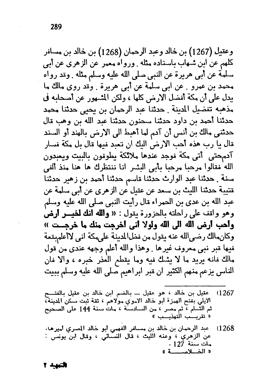 وعقيل بن خالد وعبد الرحمان بْنُ خَالِدِ بْنِ مُسَافِرٍ كُلُّهُمْ عَنِ ابْنِ شِهَابٍ بِإِسْنَادِهِ مِثْلَهُ وَرَوَاهُ مَعْمَرٌ عَنِ الزُّهْرِيِّ عَنْ أَبِي سَلَمَةَ عَنْ أَبِي هُرَيْرَةَ عَنِ النَّبِيِّ صَلَّى اللَّهُ عَلَيْهِ وَسَلَّمَ مِثْلَهُ وَقَدْ رَوَاهُ مُحَمَّدُ بْنُ عَمْرٍو عَنْ أَبِي سَلَمَةَ عَنْ أَبِي هُرَيْرَةَ وَقَدْ رَوَى مَالِكٌ مَا يَدُلُّ عَلَى أَنَّ مَكَّةَ أَفْضَلُ الْأَرْضِ كُلِّهَا وَلَكِنَّ الْمَشْهُورَ عَنْ أَصْحَابِهِ فِي مَذْهَبِهِ تَفْضِيلُ المدينة حدثنا عبد الرحمان بْنُ يَحْيَى حَدَّثَنَا مُحَمَّدٌ حَدَّثَنَا أَحْمَدُ بْنُ دَاوُدَ حَدَّثَنَا سَحْنُونُ حَدَّثَنَا عَبْدُ اللَّهِ بْنُ وَهْبٍ قَالَ حَدَّثَنِي مَالِكُ بْنُ أَنَسٍ أَنَّ آدَمَ لَمَّا أُهْبِطَ إِلَى الْأَرْضِ بِالْهِنْدِ أَوِ السِّنْدِ قَالَ يَا رَبِّ هَذِهِ أَحَبُّ الْأَرْضِ إِلَيْكَ أَنْ تُعْبَدَ فِيهَا قَالَ بَلْ مَكَّةُ فَسَارَ آدَمُ حَتَّى أَتَى مَكَّةَ فَوَجَدَ عِنْدَهَا مَلَائِكَةً يَطُوفُونَ بِالْبَيْتِ وَيَعْبُدُونَ اللَّهَ فَقَالُوا مَرْحَبًا مرحبا بأبي البشر إنا ننتظرك ها هنا مُنْذُ أَلْفَيْ سَنَةٍ حَدَّثَنَا عَبْدُ الْوَارِثِ حَدَّثَنَا قَاسِمٌ حَدَّثَنَا أَحْمَدُ بْنُ زُهَيْرٍ حَدَّثَنَا قُتَيْبَةُ حَدَّثَنَا اللَّيْثُ بْنُ سَعْدٍ عَنْ عُقَيْلٍ عَنِ الزُّهْرِيِّ عَنْ أَبِي سَلَمَةَ عَنْ عَبْدِ اللَّهِ بْنِ عَدِيِّ بْنِ الْحَمْرَاءِ قَالَ رَأَيْتُ النَّبِيَّ صَلَّى اللَّهُ عَلَيْهِ وَسَلَّمَ وَهُوَ وَاقِفٌ عَلَى راحلته الحزورة يَقُولُ وَاللَّهِ إِنَّكِ لِخَيْرُ أَرْضٍ وَأَحَبُّ أَرْضِ اللَّهِ إِلَى اللَّهِ وَلَوْلَا أَنِّي أُخْرِجْتُ مِنْكِ مَا خَرَجْتُ وَكَانَ مَالِكٌ رَضِيَ اللَّهُ عَنْهُ يَقُولُ مَنْ فَضَّلَ الْمَدِينَةَ عَلَى مَكَّةَ إِنِّي لَا أَعْلَمُ بُقْعَةً فِيهَا قَبْرُ نَبِيٍّ مَعْرُوفٍ غَيْرَهَا وَهَذَا وَاللَّهُ أَعْلَمُ وَجْهُهُ عِنْدِي مِنْ قَوْلِ مَالِكٍ فَإِنَّهُ يُرِيدُ مَا لَا يُشَكُّ فيه وما يقطع العذر خَبَرُهُ وَإِلَّا فَإِنَّ النَّاسَ يَزْعُمُ مِنْهُمُ الْكَثِيرُ أَنَّ قَبْرَ إِبْرَاهِيمَ صَلَّى اللَّهُ عَلَيْهِ وَسَلَّمَ ببيت