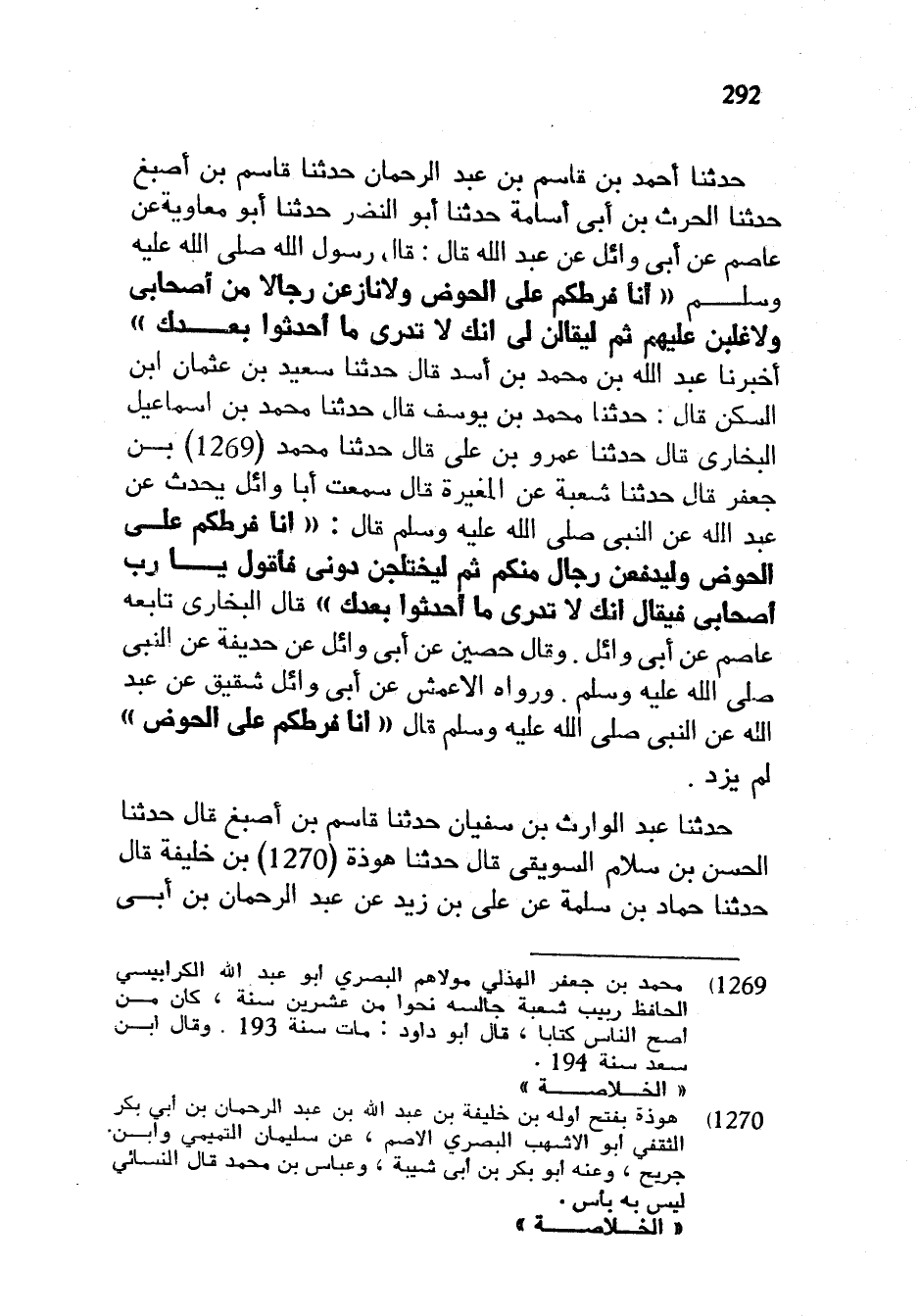 حدثنا أحمد بن قاسم بن عبد الرحمان حدثنا قاسم بن أصبغ حدثنا الحرث بْنُ أَبِي أُسَامَةَ حَدَّثَنَا أَبُو النَّضْرِ حَدَّثَنَا أَبُو مُعَاوِيَةَ عَنْ عَاصِمٍ عَنْ أَبِي وَائِلٍ عَنْ عَبْدِ اللَّهِ قَالَ قَالَ رَسُولُ اللَّهِ صَلَّى اللَّهُ عَلَيْهِ وَسَلَّمَ أَنَا فَرَطُكُمْ عَلَى الْحَوْضِ وَلَأُنَازِعَنَّ رِجَالًا مِنْ أَصْحَابِي وَلَأَغْلِبَنَّ عَلَيْهِمْ ثُمَّ لِيُقَالَنَّ لِي إِنَّكَ لَا تَدْرِي مَا أَحْدَثُوا بَعْدَكَ أَخْبَرَنَا عَبْدُ اللَّهِ بْنُ مُحَمَّدِ بْنِ أَسَدٍ قَالَ حَدَّثَنَا سَعِيدُ بْنُ عُثْمَانَ ابْنُ السَّكَنِ قَالَ حَدَّثَنَا مُحَمَّدُ بْنُ يُوسُفَ قَالَ حَدَّثَنَا مُحَمَّدُ بْنُ إِسْمَاعِيلَ الْبُخَارِيُّ قَالَ حَدَّثَنَا عَمْرُو بْنُ عَلِيٍّ قَالَ حَدَّثَنَا مُحَمَّدُ بْنُ جَعْفَرٍ قَالَ حَدَّثَنَا شُعْبَةُ عَنِ الْمُغِيرَةِ قَالَ سَمِعْتُ أَبَا وَائِلٍ يُحَدِّثُ عَنْ عَبْدِ اللَّهِ عَنِ النَّبِيِّ صَلَّى اللَّهُ عَلَيْهِ وَسَلَّمَ قَالَ أَنَا فَرَطُكُمْ عَلَى الْحَوْضِ وَلَيُدْفَعَنَّ رِجَالٌ مِنْكُمْ ثُمَّ لَيَخْتَلِجُنَّ دُونِي فَأَقُولُ يَا رَبِّ أَصْحَابِي فَيُقَالُ إِنَّكَ لَا تَدْرِي مَا أَحْدَثُوا بَعْدَكَ قَالَ الْبُخَارِيُّ تَابَعَهُ عَاصِمٌ عَنْ أَبِي وَائِلٍ وَقَالَ حُصَيْنٌ عَنْ أَبِي وَائِلٍ عَنْ حُذَيْفَةَ عَنِ النَّبِيِّ صَلَّى اللَّهُ عَلَيْهِ وَسَلَّمَ وَرَوَاهُ الْأَعْمَشُ عَنْ أَبِي وَائِلٍ شَقِيقٍ عَنْ عَبْدِ اللَّهِ عَنِ النَّبِيِّ صَلَّى اللَّهُ عَلَيْهِ وسلم أَنَا فَرَطُكُمْ عَلَى الْحَوْضِ لَمْ يُزِدْ حَدَّثَنَا عَبْدُ الْوَارِثِ بْنُ سُفْيَانَ حَدَّثَنَا قَاسِمُ بْنُ أَصْبَغَ قَالَ حَدَّثَنَا الْحَسَنُ بْنُ سَلَّامٍ السُّوَيْقِيُّ قَالَ حَدَّثَنَا هَوْذَةُ بْنُ خَلِيفَةَ قَالَ حَدَّثَنَا حَمَّادُ بْنُ سَلَمَةَ عَنْ عَلِيِّ بْنِ زَيْدٍ عن عبد الرحمان بن أبي