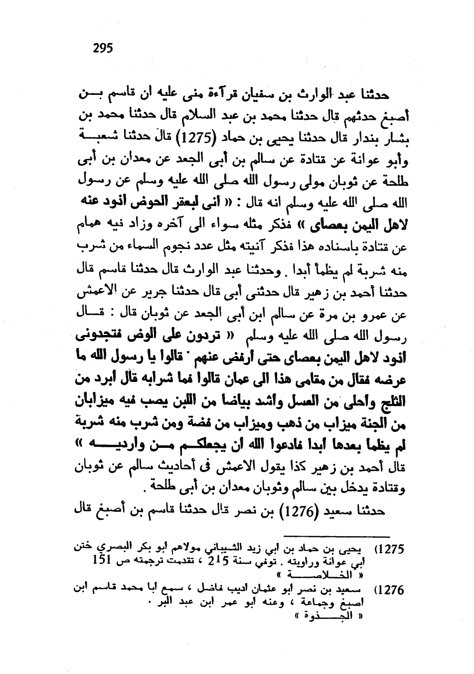 حَدَّثَنَا عَبْدُ الْوَارِثِ بْنُ سُفْيَانَ قِرَاءَةً مِنِّي عَلَيْهِ أَنَّ قَاسِمَ بْنَ أَصْبَغَ حَدَّثَهُمْ قَالَ حَدَّثَنَا مُحَمَّدُ بْنُ عَبْدِ السَّلَامِ قَالَ حَدَّثَنَا مُحَمَّدُ بْنُ بَشَّارِ بُنْدَارٌ قَالَ حَدَّثَنَا يَحْيَى بْنُ حَمَّادٍ قَالَ حَدَّثَنَا شُعْبَةُ وَأَبُو عَوَانَةَ عَنْ قَتَادَةَ عَنْ سَالِمِ بْنِ أَبِي الْجَعْدِ عَنْ مَعْدَانَ بْنِ أَبِي طَلْحَةَ عَنْ ثَوْبَانَ مَوْلَى رَسُولِ اللَّهِ صَلَّى اللَّهُ عَلَيْهِ وَسَلَّمَ عَنْ رَسُولِ اللَّهِ صَلَّى اللَّهُ عَلَيْهِ وَسَلَّمَ قال إني لعقر بعقر الْحَوْضِ أَذُودُ عَنْهُ لِأَهْلِ الْيَمَنِ بِعَصَايَ فَذَكَرَ مِثْلَهُ سَوَاءً إِلَى آخِرِهِ وَزَادَ فِيهِ هَمَّامٌ عَنْ قَتَادَةَ بِإِسْنَادِهِ هَذَا فَذَكَرَ آنِيَتَهُ مِثْلَ عدد نجوم السماء من شرب منه شربة لَمْ يَظْمَأْ أَبَدًا وَحَدَّثَنَا عَبْدُ الْوَارِثِ قَالَ حَدَّثَنَا قَاسِمٌ قَالَ حَدَّثَنَا أَحْمَدُ بْنُ زُهَيْرٍ قَالَ حَدَّثَنِي أَبِي قَالَ حَدَّثَنَا جَرِيرٌ عَنِ الْأَعْمَشِ عَنْ عَمْرِو بْنِ مُرَّةَ عَنْ سَالِمِ ابن أَبِي الْجَعْدِ عَنْ ثَوْبَانَ قَالَ قَالَ رَسُولُ اللَّهِ صَلَّى اللَّهُ عَلَيْهِ وَسَلَّمَ تَرِدُونَ عَلَى الْحَوْضِ فَتَجِدُونِي أَذُودُ لِأَهْلِ الْيَمَنِ بِعَصَايَ حَتَّى أَرْفُضَ عَنْهُمْ قَالُوا يَا رَسُولَ اللَّهِ مَا عرضه فقال من مقامي هذا إلى عمان قَالُوا فَمَا شَرَابُهُ قَالَ أَبْرَدُ مِنَ الثَّلْجِ وَأَحْلَى مِنَ الْعَسَلِ وَأَشَدُّ بَيَاضًا مِنَ اللَّبَنِ يَصُبُّ فِيهِ مِيزَابَانِ مِنَ الْجَنَّةِ مِيزَابٌ مَنْ ذَهَبٍ وَمِيزَابٌ مِنْ فِضَّةٍ وَمَنْ شَرِبَ مِنْهُ شَرْبَةً لَمْ يَظْمَأْ بَعْدَهَا أَبَدًا فَادْعُوا اللَّهَ أَنْ يَجْعَلَكُمْ مِنْ وَارِدِيهِ قَالَ أَحْمَدُ بْنُ زُهَيْرٍ كَذَا يَقُولُ الْأَعْمَشُ فِي أَحَادِيثِ سَالِمٍ عَنْ ثَوْبَانَ وَقَتَادَةَ يَدْخُلُ بَيْنَ سَالِمٍ وَثَوْبَانَ مَعْدَانُ بْنُ أَبِي طَلْحَةَ حَدَّثَنَا سَعِيدُ بْنُ نَصْرٍ قَالَ حَدَّثَنَا قَاسِمُ بْنُ أَصْبَغَ قَالَ