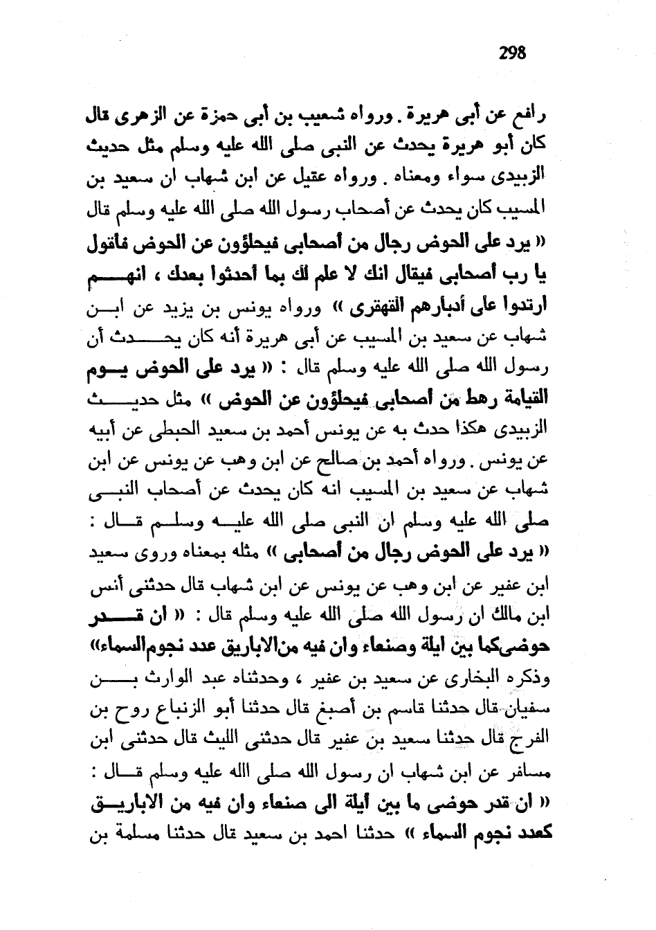 رَافِعٍ عَنْ أَبِي هُرَيْرَةَ وَرَوَاهُ شُعَيْبُ بْنُ أَبِي حَمْزَةَ عَنِ الزُّهْرِيِّ قَالَ كَانَ أَبُو هُرَيْرَةَ يُحَدِّثُ عَنِ النَّبِيِّ صَلَّى اللَّهُ عَلَيْهِ وَسَلَّمَ مِثْلَ حَدِيثِ الزُّبَيْدِيِّ سَوَاءً وَمَعْنَاهُ وَرَوَاهُ عُقَيْلٌ عَنِ ابْنِ شِهَابٍ أَنَّ سَعِيدَ بْنَ الْمُسَيَّبِ كَانَ يُحَدِّثُ عَنْ أَصْحَابِ رَسُولِ اللَّهِ صَلَّى اللَّهُ عَلَيْهِ وسلم قال يرد علي الحوض رجال من أصحابي فيحلؤون عَنِ الْحَوْضِ فَأَقُولُ يَا رَبِّ أَصْحَابِي فَيُقَالُ إِنَّكَ لَا عِلْمَ لَكَ بِمَا أَحْدَثُوا بَعْدَكَ إِنَّهُمُ ارْتَدُّوا عَلَى أَدْبَارِهِمُ الْقَهْقَرَى وَرَوَاهُ يُونُسُ بْنُ يَزِيدَ عَنِ ابْنِ شِهَابٍ عَنْ سَعِيدِ بْنِ الْمُسَيَّبِ عَنْ أَبِي هُرَيْرَةَ أَنَّهُ كَانَ يُحَدِّثُ أَنَّ رَسُولَ اللَّهِ صَلَّى اللَّهُ عَلَيْهِ وَسَلَّمَ قَالَ يَرِدُ عَلَى الْحَوْضِ يَوْمَ الْقِيَامَةِ رهط من أصحابي فيحلؤون عَنِ الْحَوْضِ مِثْلَ حَدِيثِ الزُّبَيْدِيِّ هَكَذَا حَدَّثَ بِهِ عَنْ يُونُسَ أَحْمَدُ بْنُ سَعِيدٍ الْحَبَطِيُّ عَنْ أَبِيهِ عَنْ يُونُسَ وَرَوَاهُ أَحْمَدُ بْنُ صَالِحٍ عَنِ ابْنِ وَهْبٍ عَنْ يُونُسَ عَنِ ابْنِ شِهَابٍ عَنْ سَعِيدِ بْنِ الْمُسَيَّبِ أَنَّهُ كَانَ يُحَدِّثُ عَنْ أَصْحَابِ النَّبِيِّ صَلَّى اللَّهُ عَلَيْهِ وَسَلَّمَ أَنَّ النَّبِيَّ صَلَّى اللَّهُ عَلَيْهِ وَسَلَّمَ قَالَ يَرِدُ عَلَى الْحَوْضِ رِجَالٌ مِنْ اصحابي مثله بمعناه وروى سعيد ابن عُفَيْرٍ عَنِ ابْنِ وَهْبٍ عَنْ يُونُسَ عَنِ ابْنِ شِهَابٍ قال حدثني أنس ابن مَالِكٍ أَنَّ رَسُولَ اللَّهِ صَلَّى اللَّهُ عَلَيْهِ وَسَلَّمَ قَالَ إِنَّ قَدْرَ حَوْضِي كَمَا بَيْنَ أَيْلَةَ وَصَنْعَاءَ وَإِنَّ فِيهِ مِنَ الْأَبَارِيقِ عَدَدَ نُجُومِ السَّمَاءِ وَذَكَرَهُ الْبُخَارِيُّ عَنْ سَعِيدِ بْنِ عُفَيْرٍ وَحَدَّثَنَاهُ عَبْدُ الْوَارِثِ بْنُ سُفْيَانَ قَالَ حَدَّثَنَا قَاسِمُ بْنُ أَصْبَغَ قَالَ حَدَّثَنَا أَبُو الزِّنْبَاعِ رَوْحُ بْنُ الْفَرَجِ قَالَ حَدَّثَنَا سَعِيدُ بْنُ عُفَيْرٍ قَالَ حَدَّثَنِيَ اللَّيْثُ قَالَ حَدَّثَنِيَ ابْنُ مُسَافِرٍ عَنِ ابْنِ شِهَابٍ أَنَّ رَسُولَ اللَّهِ صَلَّى اللَّهُ عَلَيْهِ وَسَلَّمَ قَالَ إِنَّ قَدْرَ حَوْضِي مَا بَيْنَ أَيْلَةَ إِلَى صَنْعَاءَ وَإِنَّ فِيهِ مِنَ الْأَبَارِيقِ كَعَدَدِ نُجُومِ السَّمَاءِ حَدَّثَنَا أَحْمَدُ بْنُ سَعِيدٍ قَالَ حَدَّثَنَا مَسْلَمَةُ بْنُ