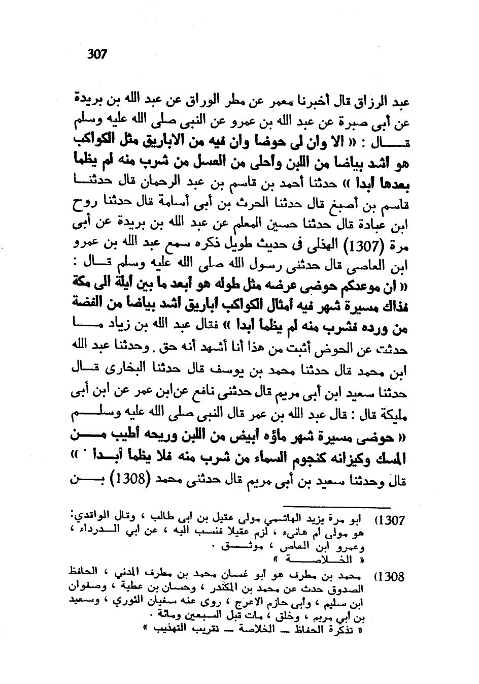 عَبْدُ الرَّزَّاقِ قَالَ أَخْبَرَنَا مَعْمَرٌ عن مطر الوارق عَنْ عَبْدِ اللَّهِ بْنِ بُرَيْدَةَ عَنْ أَبِي صَبْرَةَ عَنْ عَبْدِ اللَّهِ بْنِ عَمْرٍو عَنِ النَّبِيِّ صَلَّى اللَّهُ عَلَيْهِ وسلم قال ألا وَإِنَّ لِي حَوْضًا وَإِنَّ فِيهِ مِنَ الْأَبَارِيقِ مِثْلَ الْكَوَاكِبِ هُوَ أَشَدُّ بَيَاضًا مِنَ اللَّبَنِ وَأَحْلَى مِنَ الْعَسَلِ مَنْ شَرِبَ مِنْهُ لَمْ يَظْمَأْ بَعْدَهَا أَبَدًا حَدَّثَنَا أَحْمَدُ بْنُ قَاسِمِ بْنِ عَبْدِ الرحمان قَالَ حَدَّثَنَا قَاسِمُ بْنُ أَصْبَغَ قَالَ حَدَّثَنَا الحرث بن أبي أسامة قال حدثنا روح ابن عُبَادَةَ قَالَ حَدَّثَنَا حُسَيْنٌ الْمُعَلِّمُ عَنْ عَبْدِ اللَّهِ بْنِ بُرَيْدَةَ عَنْ أَبِي مُرَّةَ الْهُذَلِيِّ فِي حَدِيثٍ طَوِيلٍ ذَكَرَهُ سَمِعَ عَبْدَ اللَّهِ بن عمرو ابن العاصي قَالَ حَدَّثَنِي رَسُولُ اللَّهِ صَلَّى اللَّهُ عَلَيْهِ وَسَلَّمَ قَالَ إِنَّ مَوْعِدَكُمْ حَوْضِي عَرْضُهُ مِثْلُ طُولِهِ هُوَ أَبْعَدُ مَا بَيْنَ أَيْلَةَ إِلَى مَكَّةَ فَذَاكَ مَسِيرَةُ شَهْرٍ فِيهِ أَمْثَالُ الْكَوَاكِبِ أَبَارِيقُ أَشَدُّ بَيَاضًا مِنَ الْفِضَّةِ مَنْ وَرَدَهُ فَشَرِبَ مِنْهُ لَمْ يَظْمَأْ أَبَدًا فَقَالَ عَبْدُ اللَّهِ بْنُ زِيَادٍ مَا حُدِّثْتُ عَنِ الْحَوْضِ أَثْبَتَ مِنْ هَذَا أَنَا أَشْهَدُ أَنَّهُ حَقٌّ وحدثنا عبد الله ابن مُحَمَّدٍ قَالَ حَدَّثَنَا مُحَمَّدُ بْنُ يُوسُفَ قَالَ حَدَّثَنَا البخاري قال حدثنا سعيد ابن أَبِي مَرْيَمَ قَالَ حَدَّثَنِي نَافِعٌ عَنِ ابْنِ عُمَرَ عَنِ ابْنِ أَبِي مُلَيْكَةَ قَالَ قَالَ عَبْدُ اللَّهِ بْنُ عُمَرَ قَالَ النَّبِيُّ صَلَّى اللَّهُ عَلَيْهِ وَسَلَّمَ حَوْضِي مَسِيرَةُ شَهْرٍ مَاؤُهُ أَبْيَضُ مِنَ اللَّبَنِ وَرِيحُهُ أَطْيَبُ مِنَ الْمِسْكِ وَكِيزَانُهُ كَنُجُومِ السَّمَاءِ مَنْ شَرِبَ مِنْهُ فَلَا يَظْمَأْ أَبَدًا قَالَ وَحَدَّثَنَا سَعِيدُ بْنُ أَبِي مَرْيَمَ قَالَ حَدَّثَنِي مُحَمَّدُ بْنُ