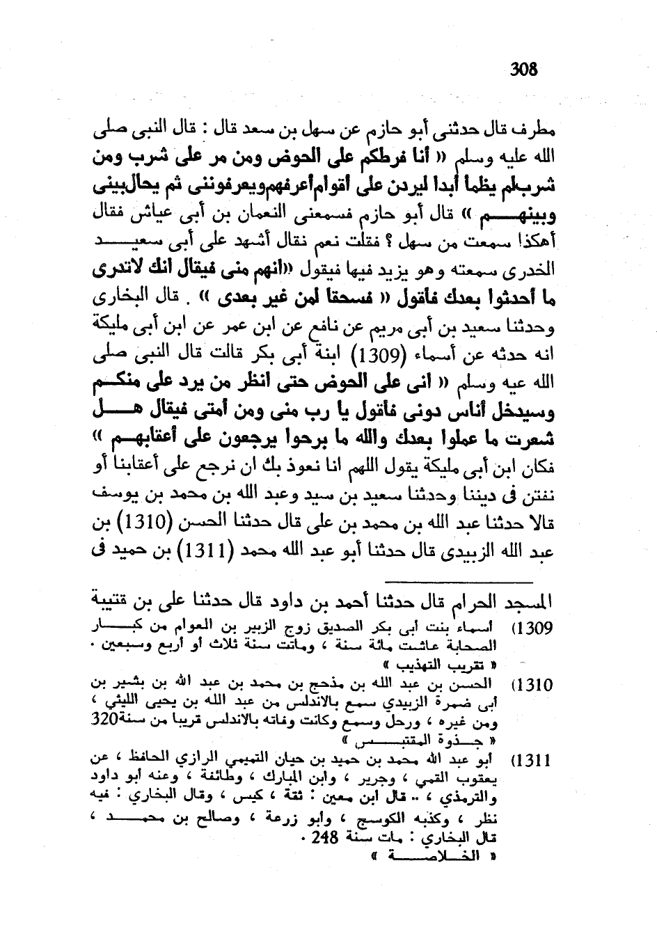 مُطَرِّفٍ قَالَ حَدَّثَنِي أَبُو حَازِمٍ عَنْ سَهْلِ بْنِ سَعْدٍ قَالَ قَالَ النَّبِيُّ صَلَّى اللَّهُ عَلَيْهِ وَسَلَّمَ أَنَا فَرَطُكُمْ عَلَى الْحَوْضِ وَمَنْ مَرَّ عَلَيَّ شَرِبَ وَمِنْ شَرِبَ لَمْ يَظْمَأْ أَبَدًا لَيَرِدَنَّ عَلَيَّ أَقْوَامٌ أَعْرِفُهُمْ وَيَعْرِفُونَنِي ثُمَّ يُحَالُ بَيْنِي وَبَيْنَهُمْ قَالَ أَبُو حَازِمٍ فَسَمِعَنِيَ النُّعْمَانُ بْنُ أَبِي عَيَّاشٍ فَقَالَ أَهَكَذَا سَمِعْتَ مِنْ سَهْلٍ فَقُلْتُ نَعَمْ فَقَالَ أَشْهَدُ عَلَى أَبِي سَعِيدٍ الْخُدْرِيِّ سَمِعْتُهُ وَهُوَ يَزِيدُ فِيهَا فَيَقُولُ إِنَّهُمْ مِنِّي فَيُقَالُ إِنَّكَ لَا تَدْرِي مَا أَحْدَثُوا بَعْدَكَ فَأَقُولُ فَسُحْقًا لِمَنْ غَيَّرَ بَعْدِي قَالَ الْبُخَارِيُّ وَحَدَّثَنَا سَعِيدُ بْنُ أَبِي مَرْيَمَ عَنْ نَافِعٍ عَنِ ابْنِ عُمَرَ عَنِ ابْنِ أَبِي مُلَيْكَةَ أَنَّهُ حَدَّثَهُ عَنْ أَسْمَاءَ ابْنَةِ أَبِي بَكْرٍ قَالَتْ قَالَ النَّبِيُّ صَلَّى اللَّهُ عَلَيْهِ وَسَلَّمَ إِنِّي عَلَى الْحَوْضِ حَتَّى أَنْظُرَ مَنْ يَرِدُ عَلَيَّ مِنْكُمْ وَسَيَدْخُلُ أُنَاسٌ دُونِي فَأَقُولُ يَا رَبِّ مِنِّي وَمِنْ أُمَّتِي فَيُقَالُ هَلْ شَعَرْتَ مَا عَمِلُوا بَعْدَكَ وَاللَّهِ مَا بَرِحُوا يَرْجِعُونَ عَلَى أَعْقَابِهِمْ فَكَانَ ابْنُ أَبِي مُلَيْكَةَ يَقُولُ اللَّهُمَّ إِنَّا نَعُوذُ بِكَ أَنْ نَرْجِعَ عَلَى أَعْقَابِنَا أَوْ نُفْتَنَ فِي دِينِنَا وَحَدَّثَنَا سَعِيدُ بْنُ سَيِّدٍ وَعَبْدُ اللَّهِ بْنُ مُحَمَّدِ بْنِ يُوسُفَ قَالَا حَدَّثَنَا عَبْدُ اللَّهِ بْنُ مُحَمَّدِ بْنِ عَلِيٍّ قَالَ حَدَّثَنَا الْحَسَنُ بْنُ عَبْدِ اللَّهِ الزُّبَيْدِيُّ قَالَ حَدَّثَنَا أَبُو عَبْدِ اللَّهِ مُحَمَّدُ بْنُ حُمَيْدٍ فِي