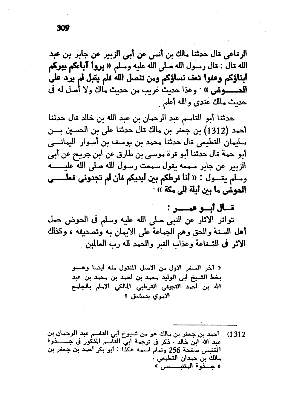 الرِّفَاعِيِّ قَالَ حَدَّثَنَا مَالِكُ بْنُ أَنَسٍ عَنْ أَبِي الزُّبَيْرِ عَنْ جَابِرِ بْنِ عَبْدِ اللَّهِ قَالَ قَالَ رَسُولُ اللَّهِ صَلَّى اللَّهُ عَلَيْهِ وَسَلَّمَ بِرُّوا آبَاءَكُمْ يَبَرُّكُمْ أَبْنَاؤُكُمْ وَعِفُّوا تَعِفَّ نِسَاؤُكُمْ وَمَنْ تَنَصَّلَ اللَّهُ فَلَمْ يَقْبَلْ لَمْ يَرِدْ عَلَى الْحَوْضِ وَهَذَا حَدِيثٌ غَرِيبٌ مِنْ حَدِيثِ مَالِكٍ وَلَا أَصْلَ لَهُ فِي حَدِيثِ مَالِكٍ عِنْدِي وَاللَّهُ أَعْلَمُ حَدَّثَنَا أَبُو الْقَاسِمِ عبد الرحمان بْنُ عَبْدِ اللَّهِ بْنِ خَالِدٍ قَالَ حَدَّثَنَا أَحْمَدُ بْنُ جَعْفَرِ بْنِ مَالِكٍ قَالَ حَدَّثَنَا عَلِيُّ بْنُ الْحُسَيْنِ بْنِ سُلَيْمَانَ الْقَطِيعِيُّ قَالَ حَدَّثَنَا مُحَمَّدُ بْنُ يُوسُفَ بْنِ أَسْوَارٍ الْيَمَانِيُّ أَبُو حُمَةَ قَالَ حَدَّثَنَا أَبُو قُرَّةَ مُوسَى بْنُ طَارِقٍ عَنِ ابْنِ جُرَيْحٍ عَنْ أَبِي الزُّبَيْرِ عَنْ جَابِرٍ سَمِعَهُ يَقُولُ سَمِعْتُ رَسُولَ اللَّهِ صَلَّى اللَّهُ عَلَيْهِ وَسَلَّمَ يَقُولُ أَنَا فَرَطُكُمْ بَيْنَ أَيْدِيكُمْ فَإِنْ لَمْ تَجِدُونِي فَعَلَى الْحَوْضِ مَا بَيْنَ أَيْلَةَ إِلَى مَكَّةَ قَالَ أَبُو عُمَرَ تَوَاتُرُ الْآثَارِ عَنِ النَّبِيِّ صَلَّى اللَّهُ عَلَيْهِ وَسَلَّمَ فِي الْحَوْضِ حَمَلَ أَهْلَ السُّنَّةِ وَالْحَقِّ وَهُمُ الْجَمَاعَةُ عَلَى الْإِيمَانِ بِهِ وَتَصْدِيقِهِ وَكَذَلِكَ الْأَثَرُ فِي الشَّفَاعَةِ وَعَذَابِ الْقَبْرِ والحمد لله رب العالمين آخر السفر الأول من الاصل المنقول منه أيضا وهو بخط الشيخ أبي الوليد محمد بن أحمد بن محمد بن عبد الله بن احمد التجيفي القرطبي المالكي الامام بالجامع الاموي بدمشق