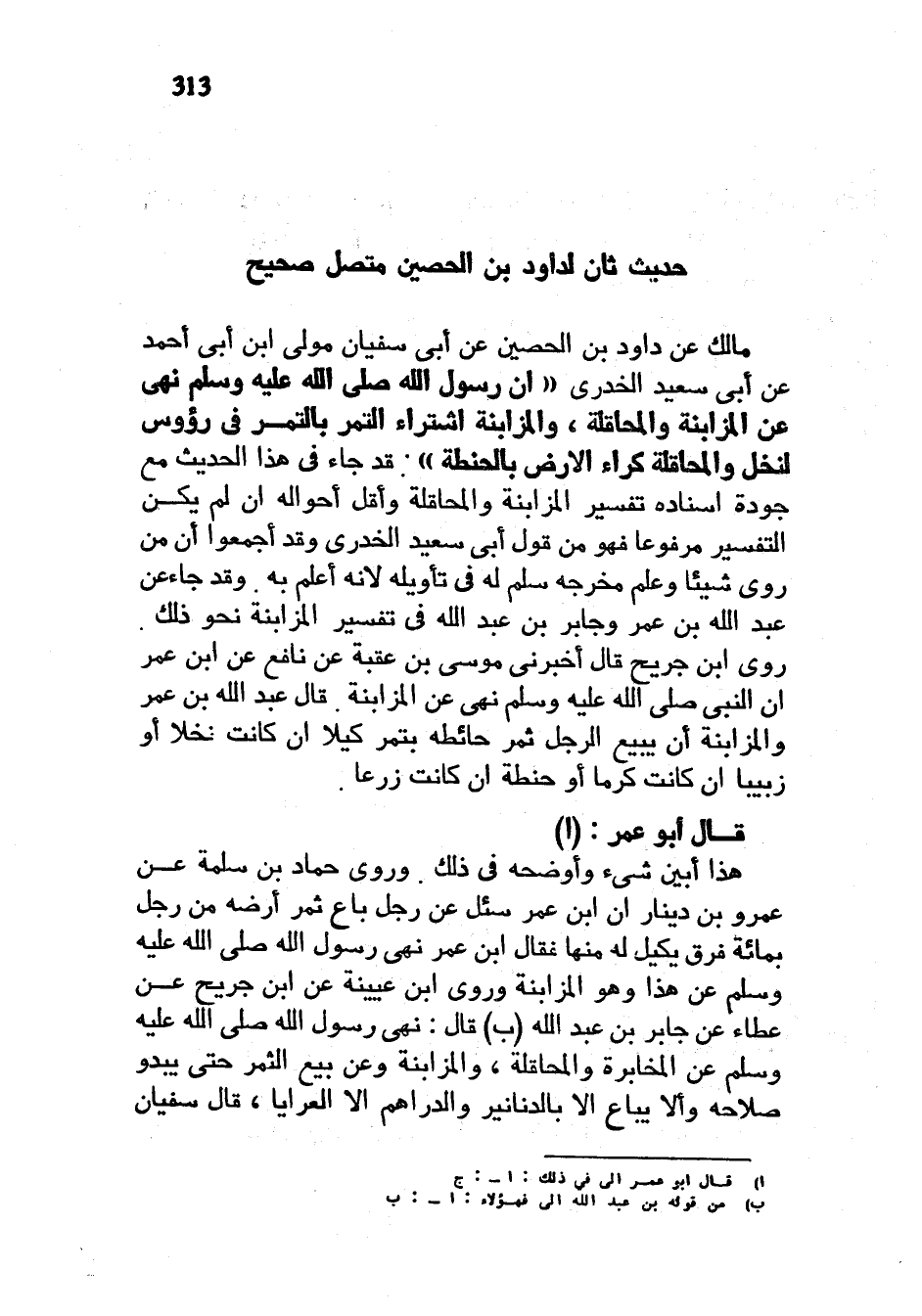 حَدِيثٌ ثَانٍ لِدَاوُدَ بْنِ الْحُصَيْنِ مُتَّصِلٌ صَحِيحٌ مَالِكٌ عَنْ دَاوُدَ بْنِ الْحُصَيْنِ عَنْ أَبِي سُفْيَانَ مَوْلَى ابْنِ أَبِي أَحْمَدَ عَنْ أَبِي سَعِيدٍ الْخُدْرِيِّ أَنَّ رَسُولَ اللَّهِ صَلَّى اللَّهُ عَلَيْهِ وَسَلَّمَ نَهَى عَنِ الْمُزَابَنَةِ والمحالقة والمزابنة اشتراء التمر بالتمر في رؤوس لِنَخْلٍ وَالْمُحَاقَلَةُ كِرَاءُ الْأَرْضِ بِالْحِنْطَةِ قَدْ جَاءَ فِي هَذَا الْحَدِيثِ مَعَ جَوْدَةِ إِسْنَادِهِ تَفْسِيرُ الْمُزَابَنَةِ وَالْمُحَاقَلَةِ وَأَقَلُّ أَحْوَالِهِ إِنْ لَمْ يَكُنِ التَّفْسِيرُ مَرْفُوعًا فَهُوَ مِنْ قَوْلِ أَبِي سَعِيدٍ الْخُدْرِيِّ وَقَدْ أَجْمَعُوا أَنَّ مَنْ رَوَى شَيْئًا وَعَلِمَ مَخْرَجَهُ سَلِمَ لَهُ فِي تَأْوِيلِهِ لِأَنَّهُ أَعْلَمُ بِهِ وَقَدْ جَاءَ عَنْ عَبْدِ اللَّهِ بْنِ عُمَرَ وَجَابِرِ بْنِ عَبْدِ اللَّهِ فِي تفسير المزابنة نحو ذلك ورى ابْنُ جُرَيْجٍ قَالَ أَخْبَرَنِي مُوسَى بْنُ عُقْبَةَ عَنْ نَافِعٍ عَنِ ابْنِ عُمَرَ أَنَّ النَّبِيَّ صَلَّى اللَّهُ عَلَيْهِ وَسَلَّمَ نَهَى عَنِ الْمُزَابَنَةِ قَالَ عَبْدُ اللَّهِ بْنُ عُمَرَ وَالْمُزَابَنَةُ أَنْ يَبِيعَ الرَّجُلُ ثَمَرَ حَائِطِهِ بِتَمْرٍ كَيْلًا إِنْ كَانَتْ نَخْلًا أَوْ زَبِيبًا إِنْ كَانَتْ كَرْمًا أَوْ حِنْطَةً إِنْ كَانَتْ زَرْعًا قَالَ أَبُو عُمَرَ هَذَا أَبْيَنُ شَيْءٍ وَأَوْضَحُهُ فِي ذَلِكَ وَرَوَى حَمَّادُ بْنُ سَلَمَةَ عَنْ عَمْرِو بْنِ دِينَارٍ أَنَّ ابْنَ عُمَرَ سُئِلَ عَنْ رَجُلٍ بَاعَ ثَمَرَ أَرْضِهِ مِنْ رَجُلٍ بِمِائَةِ فَرْقٍ يَكِيلُ لَهُ مِنْهَا فَقَالَ ابْنُ عُمَرَ نَهَى رَسُولُ اللَّهِ صَلَّى اللَّهُ عَلَيْهِ وَسَلَّمَ عن هَذَا وَهُوَ الْمُزَابَنَةُ وَرَوَى ابْنُ عُيَيْنَةَ عَنِ ابْنِ جُرَيْحٍ عَنْ عَطَاءٍ عَنْ جَابِرِ بْنِ عَبْدِ اللَّهِ قَالَ نَهَى رَسُولُ اللَّهِ صَلَّى اللَّهُ عَلَيْهِ وَسَلَّمَ عَنِ الْمُخَابَرَةِ وَالْمُحَاقَلَةِ وَالْمُزَابَنَةِ وَعَنْ بَيْعِ الثَّمَرِ حَتَّى يَبْدُوَ صَلَاحُهُ وَأَلَّا يباع إلا بالدناينر وَالدَّرَاهِمِ إِلَّا الْعَرَايَا قَالَ سُفْيَانُ