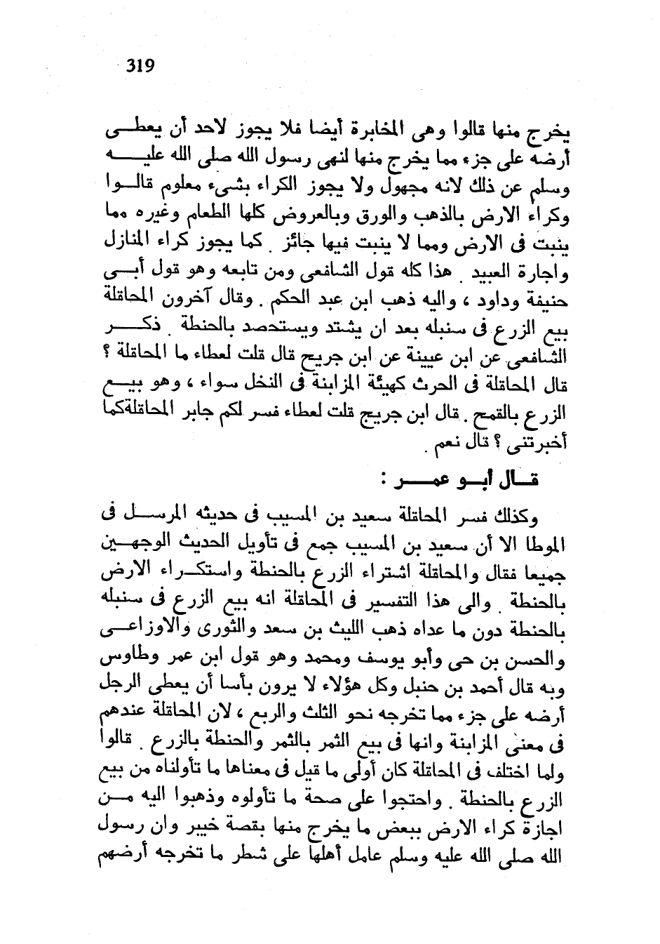يَخْرُجُ مِنْهَا قَالُوا وَهِيَ الْمُخَابَرَةُ أَيْضًا فَلَا يَجُوزُ لِأَحَدٍ أَنْ يُعْطِيَ أَرْضَهُ عَلَى جُزْءٍ مِمَّا يَخْرُجُ مِنْهَا لِنَهْيِ رَسُولِ اللَّهِ صَلَّى اللَّهُ عَلَيْهِ وَسَلَّمَ عَنْ ذَلِكَ لِأَنَّهُ مَجْهُولٌ وَلَا يَجُوزُ الْكِرَاءُ بِشَيْءٍ مَعْلُومٍ قَالُوا وَكَرَاءُ الْأَرْضِ بِالذَّهَبِ وَالْوَرِقِ وَبِالْعُرُوضِ كُلِّهَا الطَّعَامِ وَغَيْرِهِ مِمَّا يَنْبُتُ فِي الْأَرْضِ وَمِمَّا لَا يَنْبُتُ فِيهَا جَائِزٌ كَمَا يَجُوزُ كِرَاءُ الْمَنَازِلِ وَإِجَارَةُ الْعَبِيدِ هَذَا كُلُّهُ قَوْلُ الشَّافِعِيِّ وَمَنْ تَابَعَهُ وَهُوَ قَوْلُ أَبِي حَنِيفَةَ وَدَاوُدَ وَإِلَيْهِ ذَهَبَ ابْنُ عَبْدِ الْحَكَمِ وَقَالَ آخَرُونَ الْمُحَاقَلَةُ بَيْعُ الزَّرْعِ فِي سُنْبُلِهِ بَعْدَ أَنْ يَشْتَدَّ وَيَسْتَحْصِدَ بِالْحِنْطَةِ ذَكَرَ الشَّافِعِيُّ عَنِ ابْنِ عُيَيْنَةَ عَنِ ابْنِ جُرَيْحٍ قَالَ قُلْتُ لِعَطَاءٍ مَا الْمُحَاقَلَةُ قال المحاقلة في الحرث كهينة الْمُزَابَنَةِ فِي النَّخْلِ سَوَاءٌ وَهُوَ بَيْعُ الزَّرْعِ بِالْقَمْحِ قَالَ ابْنُ جُرَيْجٍ قُلْتُ لِعَطَاءٍ فَسَّرَ لَكُمْ جَابِرٌ الْمُحَاقَلَةَ كَمَا أَخْبَرْتَنِي قَالَ نَعَمْ قَالَ أَبُو عُمَرَ وَكَذَلِكَ فَسَّرَ الْمُحَاقَلَةَ سَعِيدُ بْنُ الْمُسَيَّبِ فِي حَدِيثِهِ الْمُرْسَلِ فِي الْمُوَطَّأِ إِلَّا أَنَّ سَعِيدَ بْنَ الْمُسَيَّبِ جَمَعَ فِي تَأْوِيلِ الْحَدِيثِ الْوَجْهَيْنِ جَمِيعًا فَقَالَ وَالْمُحَاقَلَةُ اشْتِرَاءُ الزَّرْعِ بِالْحِنْطَةِ وَاسْتِكْرَاءُ الْأَرْضِ بِالْحِنْطَةِ وَإِلَى هَذَا التَّفْسِيرِ فِي الْمُحَاقَلَةِ أَنَّهُ بَيْعُ الزَّرْعِ فِي سُنْبُلِهِ بِالْحِنْطَةِ دُونَ مَا عَدَاهُ ذَهَبَ اللَّيْثُ بْنُ سَعْدٍ وَالثَّوْرِيُّ وَالْأَوْزَاعِيُّ وَالْحَسَنُ بْنُ حَيٍّ وَأَبُو يُوسُفَ وَمُحَمَّدٌ وَهُوَ قَوْلُ ابْنِ عُمَرَ وَطَاوُسٍ وَبِهِ قَالَ أَحْمَدُ بْنُ حَنْبَلٍ وَكُلُّ هَؤُلَاءِ لَا يَرَوْنَ بَأْسًا أَنْ يُعْطِيَ الرَّجُلُ أَرْضَهُ عَلَى جُزْءٍ مِمَّا تُخْرِجُهُ نَحْوَ الثُّلُثِ وَالرُّبُعِ لِأَنَّ الْمُحَاقَلَةَ عِنْدَهُمْ فِي مَعْنَى الْمُزَابَنَةِ وَأَنَّهَا فِي بَيْعِ الثَّمَرِ بِالثَّمَرِ وَالْحِنْطَةِ بِالزَّرْعِ قَالُوا وَلَمَّا اخْتُلِفَ فِي الْمُحَاقَلَةِ كَانَ أَوْلَى مَا قِيلَ فِي مَعْنَاهَا مَا تَأَوَّلْنَاهُ مِنْ بَيْعِ الزَّرْعِ بِالْحِنْطَةِ وَاحْتَجُّوا عَلَى صِحَّةِ مَا تَأَوَّلُوهُ وَذَهَبُوا إِلَيْهِ مِنْ إِجَازَةِ كِرَاءِ الْأَرْضِ بِبَعْضِ مَا يَخْرُجُ مِنْهَا بِقِصَّةِ خَيْبَرَ وَأَنَّ رَسُولَ اللَّهِ صَلَّى اللَّهُ عَلَيْهِ وَسَلَّمَ عَامَلَ أَهْلَهَا عَلَى شَطْرِ مَا تُخْرِجُهُ أَرْضُهُمْ
