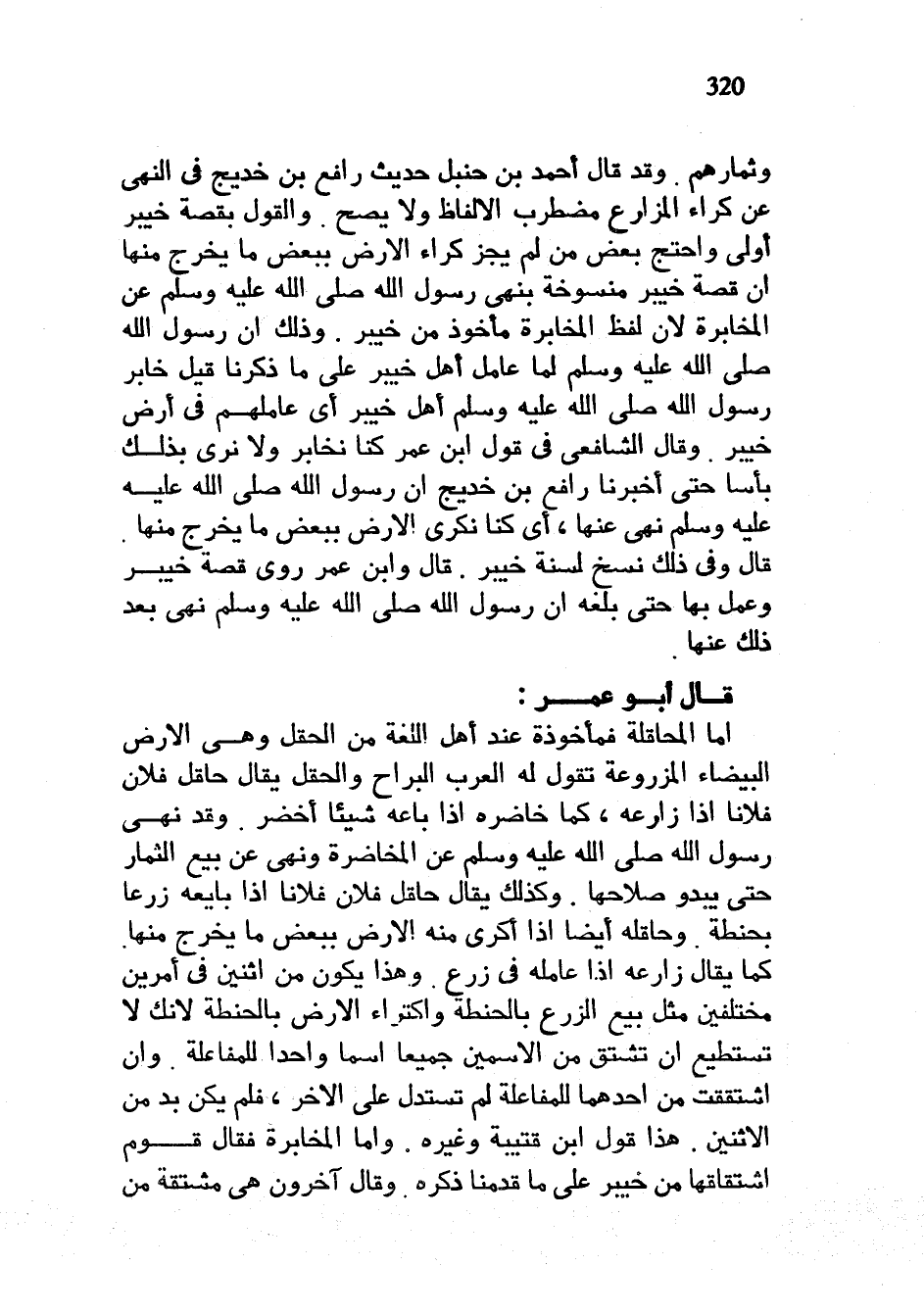 وَثِمَارُهُمْ وَقَدْ قَالَ أَحْمَدُ بْنُ حَنْبَلٍ حَدِيثُ رافع بن خديح فِي النَّهْيِ عَنْ كِرَاءِ الْمَزَارِعِ مُضْطَرِبُ الْأَلْفَاظِ وَلَا يَصِحُّ وَالْقَوْلُ بِقِصَّةِ خَيْبَرَ أَوْلَى وَاحْتَجَّ بَعْضُ مَنْ لَمْ يُجِزْ كِرَاءَ الْأَرْضِ بِبَعْضِ مَا يَخْرُجُ مِنْهَا أَنَّ قِصَّةَ خَيْبَرَ مَنْسُوخَةٌ بِنَهْيِ رَسُولِ اللَّهِ صَلَّى اللَّهُ عَلَيْهِ وَسَلَّمَ عَنِ الْمُخَابَرَةِ لِأَنَّ لَفْظَ الْمُخَابَرَةِ مَأْخُوذٌ مِنْ خَيْبَرَ وَذَلِكَ أَنَّ رَسُولَ اللَّهِ صَلَّى اللَّهُ عَلَيْهِ وَسَلَّمَ لَمَّا عَامَلَ أَهْلَ خَيْبَرَ عَلَى مَا ذَكَرْنَا قِيلَ خَابَرَ رَسُولُ اللَّهِ صَلَّى اللَّهُ عَلَيْهِ وَسَلَّمَ أَهْلَ خَيْبَرَ أَيْ عَامَلَهُمْ فِي أَرْضِ خَيْبَرَ وَقَالَ الشَّافِعِيُّ فِي قَوْلِ ابْنِ عُمَرَ كُنَّا نُخَابِرُ وَلَا نَرَى بِذَلِكَ بَأْسًا حَتَّى أَخْبَرَنَا رَافِعُ بْنُ خَدِيجٍ أَنَّ رسول الله صلى الله عليه وسلم نهى عَنْهَا أَيْ كُنَّا نُكْرِي الْأَرْضَ بِبَعْضِ مَا يَخْرُجُ مِنْهَا قَالَ وَفِي ذَلِكَ نَسْخٌ لِسَنَةِ خَيْبَرَ قَالَ وَابْنُ عُمَرَ رَوَى قِصَّةَ خَيْبَرَ وَعَمِلَ بِهَا حَتَّى بَلَغَهُ أَنَّ رَسُولَ اللَّهِ صَلَّى اللَّهُ عَلَيْهِ وَسَلَّمَ نَهَى بَعْدَ ذَلِكَ عَنْهَا قَالَ أَبُو عُمَرَ أَمَّا الْمُحَاقَلَةُ فَمَأْخُوذَةٌ عِنْدَ أَهْلِ اللُّغَةِ مِنَ الْحَقْلِ وَهِيَ الْأَرْضُ الْبَيْضَاءُ الْمَزْرُوعَةُ تَقُولُ لَهُ الْعَرَبُ الْبَرَاحُ وَالْحَقْلُ يُقَالُ حَاقَلَ فُلَانٌ فُلَانًا إِذَا زَارَعَهُ كَمَا خَاضَرَهُ إِذَا بَاعَهُ شَيْئًا أَخْضَرَ وَقَدْ نَهَى رَسُولُ اللَّهِ صَلَّى اللَّهُ عَلَيْهِ وَسَلَّمَ عن الْمُخَاضَرَةِ وَنَهَى عَنْ بَيْعِ الثِّمَارِ حَتَّى يَبْدُوَ صَلَاحُهَا وَكَذَلِكَ يُقَالُ حَاقَلَ فُلَانٌ فُلَانًا إِذَا بَايَعَهُ زَرْعًا بِحِنْطَةٍ وَحَاقَلَهُ أَيْضًا إِذَا أَكْرَى مِنْهُ الْأَرْضَ بِبَعْضِ مَا يَخْرُجُ مِنْهَا كَمَا يقال زارعه إذاعامله فِي زَرْعٍ وَهَذَا يَكُونُ مِنِ اثْنَيْنِ فِي أَمْرَيْنِ مُخْتَلِفَيْنِ مِثْلِ بَيْعِ الزَّرْعِ بِالْحِنْطَةِ وَاكْتِرَاءِ الْأَرْضِ بِالْحِنْطَةِ لِأَنَّكَ لَا تَسْتَطِيعُ أَنْ تَشْتَقَّ مِنَ الِاسْمَيْنِ جَمِيعًا اسْمًا وَاحِدًا لِلْمُفَاعَلَةِ وَإِنِ اشْتَقَقْتَ مِنْ أَحَدِهِمَا لِلْمُفَاعَلَةِ لَمْ تَسْتَدِلَّ عَلَى الْآخَرِ فَلَمْ يَكُنْ بُدٌّ مِنَ الِاثْنَيْنِ هَذَا قَوْلُ ابْنِ قُتَيْبَةَ وَغَيْرِهِ وَأَمَّا الْمُخَابَرَةُ فَقَالَ قَوْمٌ اشْتِقَاقُهَا مِنْ خَيْبَرَ عَلَى مَا قَدَّمْنَا ذِكْرَهُ وَقَالَ آخَرُونَ هِيَ مُشْتَقَّةٌ مِنَ