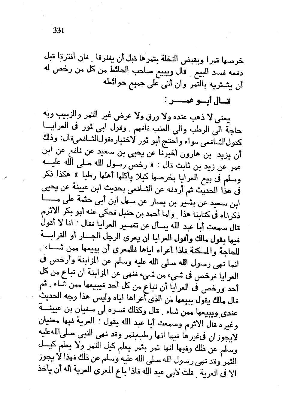 خَرْصِهَا تَمْرًا وَيَقْبِضُ النَّخْلَةَ بِتَمْرِهَا قَبْلَ أَنْ يفترقا فإن افترقا قبل دفعه فسدالبيع قَالَ وَيَبِيعُ صَاحِبُ الْحَائِطِ مِنْ كُلِّ مَنْ رُخِّصَ لَهُ أَنْ يَشْتَرِيَهُ بِالتَّمْرِ وَإِنْ أَتَى عَلَى جَمِيعِ حَوَائِطِهِ قَالَ أَبُو عُمَرَ يَعْنِي لَا ذَهَبَ عِنْدَهُ وَلَا وَرِقَ وَلَا عَرَضَ غَيْرَ التَّمْرِ وَالزَّبِيبِ وَبِهِ حَاجَةٌ إِلَى الرُّطَبِ وَإِلَى الْعِنَبِ فَافْهَمْ وَقَوْلُ أَبِي ثَوْرٍ فِي العريا كَقَوْلِ الشَّافِعِيِّ سَوَاءٌ وَاحْتَجَّ أَبُو ثَوْرٍ لِاخْتِيَارِهِ قَوْلَ الشَّافِعِيِّ قَالَ وَذَلِكَ أَنَّ يَزِيدَ بْنَ هَارُونَ أَخْبَرَنَا عَنْ يَحْيَى بْنِ سَعِيدٍ عَنْ نَافِعٍ عَنِ ابْنِ عُمَرَ عَنْ زَيْدِ بْنِ ثَابِتٍ قَالَ رَخَّصَ رَسُولُ اللَّهِ صَلَّى اللَّهُ عَلَيْهِ وَسَلَّمَ فِي بَيْعِ الْعَرَايَا بِخَرْصِهَا كَيْلَا يأكلها أهلا رُطَبًا هَكَذَا ذُكِرَ فِي هَذَا الْحَدِيثِ ثُمَّ أَرْدَفَهُ عَنِ الشَّافِعِيِّ بِحَدِيثِ ابْنِ عُيَيْنَةَ عَنْ يحيى ابن سَعِيدٍ عَنْ بُشَيْرِ بْنِ يَسَارٍ عَنْ سَهْلِ ابن أَبِي حَثْمَةَ عَلَى مَا ذَكَرْنَاهُ فِي كِتَابِنَا هَذَا وَأَمَّا أَحْمَدُ بْنُ حَنْبَلٍ فَحَكَى عَنْهُ أَبُو بَكْرٍ الْأَثْرَمُ قَالَ سَمِعْتُ أَبَا عَبْدِ اللَّهِ يَسْأَلُ عَنْ تَفْسِيرِ الْعَرَايَا فَقَالَ أَنَا لَا أَقُولُ فِيهَا بِقَوْلِ مَالِكٍ وَأَقُولُ الْعَرَايَا أَنْ يُعْرِيَ الرَّجُلُ الْجَارَ أَوِ الْقَرَابَةَ لِلْحَاجَةِ وَالْمَسْكَنَةِ فَإِذَا أَعْرَاهُ إِيَّاهَا فَلِلْمُعْرَى أَنْ يَبِيعَهَا مِمَّنْ شَاءَ إِنَّمَا نَهَى رَسُولُ اللَّهِ صَلَّى اللَّهُ عَلَيْهِ وَسَلَّمَ عَنِ الْمُزَابَنَةِ وَأَرْخَصَ فِي الْعَرَايَا فَرَخَّصَ فِي شَيْءٍ مِنْ شَيْءٍ فَنَهَى عَنِ الْمُزَابَنَةِ أَنْ تُبَاعَ مِنْ كُلِّ أَحَدٍ وَرَخَّصَ فِي الْعَرَايَا أَنْ تُبَاعَ مَنْ كُلِّ أَحَدٍ فَيَبِيعُهَا مِمَّنْ شَاءَ ثُمَّ قَالَ مَالِكٌ يَقُولُ بِبَيْعِهَا مِنَ الَّذِي أَعْرَاهَا إِيَّاهُ وَلَيْسَ هَذَا وَجْهَ الْحَدِيثِ عِنْدِي وَيَبِيعُهَا مِمَّنْ شَاءَ قَالَ وَكَذَلِكَ فَسَّرَهُ لِي سُفْيَانُ بْنُ عُيَيْنَةَ وَغَيْرُهُ قَالَ الْأَثْرَمُ وَسَمِعْتُ أَبَا عَبْدِ اللَّهِ يَقُولُ الْعَرِيَّةُ فِيهَا مَعْنَيَانِ لَا يَجُوزَانِ فِي غَيْرِهَا فِيهَا أَنَّهَا رُطَبٌ بِتَمْرٍ وَقَدْ نَهَى النَّبِيُّ صَلَّى اللَّهُ عَلَيْهِ وَسَلَّمَ عَنْ ذَلِكَ وَفِيهَا أَنَّهَا تَمْرٌ بِثَمَرٍ يُعْلَمُ كَيْلُ التَّمْرِ وَلَا يُعْلَمُ كَيْلُ الثَّمَرِ وَقَدْ نَهَى رَسُولُ اللَّهِ صَلَّى اللَّهُ عَلَيْهِ وَسَلَّمَ عَنْ ذَلِكَ فَهَذَا لَا يَجُوزُ إِلَّا فِي الْعَرِيَّةِ قُلْتُ لِأَبِي عَبْدِ اللَّهِ فَإِذَا بَاعَ الْمُعْرِي الْعَرِيَّةَ أَلَهُ أَنْ يَأْخُذَ