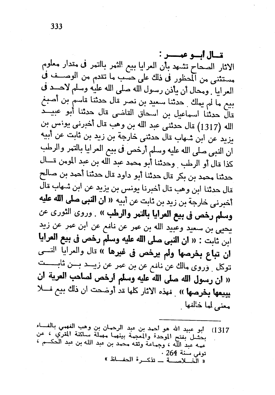 قَالَ أَبُو عُمَرَ الْآثَارُ الصِّحَاحُ تَشْهَدُ بِأَنَّ الْعَرَايَا بِيعُ الثَّمَرِ بِالتَّمْرِ فِي مِقْدَارٍ مَعْلُومٍ مُسْتَثْنًى مِنَ الْمَحْظُورِ فِي ذَلِكَ عَلَى حَسَبِ مَا تَقَدَّمَ مِنَ الْوَصْفِ فِي الْعَرَايَا وَمُحَالٌ أَنْ يَأْذَنَ رَسُولُ اللَّهِ صَلَّى اللَّهُ عَلَيْهِ وَسَلَّمَ لِأَحَدٍ فِي بَيْعِ مَا لَمْ يَمْلِكْ حَدَّثَنَا سَعِيدُ بْنُ نَصْرٍ قَالَ حَدَّثَنَا قَاسِمُ بْنُ أَصْبَغَ قَالَ حَدَّثَنَا إِسْمَاعِيلُ بْنُ إِسْحَاقَ الْقَاضِي قَالَ حَدَّثَنَا أَبُو عُبَيْدِ اللَّهِ قَالَ حَدَّثَنِي عَبْدُ اللَّهِ بْنُ وَهْبٍ قَالَ أَخْبَرَنِي يُونُسُ بْنُ يَزِيدَ عَنِ ابْنِ شِهَابٍ قَالَ حَدَّثَنِي خَارِجَةُ بْنُ زَيْدِ بْنِ ثَابِتٍ عَنْ أَبِيهِ أَنَّ النَّبِيَّ صَلَّى اللَّهُ عَلَيْهِ وَسَلَّمَ أَرْخَصَ فِي بَيْعِ الْعَرَايَا بِالتَّمْرِ وَالرُّطَبِ كَذَا قَالَ أَوِ الرُّطَبِ وَحَدَّثَنَا أَبُو مُحَمَّدٍ عَبْدُ اللَّهِ بْنُ عَبْدِ الْمُؤْمِنِ قَالَ حَدَّثَنَا مُحَمَّدُ بْنُ بَكْرٍ قَالَ حَدَّثَنَا أَبُو دَاوُدَ قَالَ حَدَّثَنَا أَحْمَدُ بْنُ صَالِحٍ قَالَ حَدَّثَنَا ابْنُ وَهْبٍ قَالَ أَخْبَرَنَا يُونُسُ بْنُ يَزِيدَ عَنِ ابْنِ شِهَابٍ قَالَ أَخْبَرَنِي خَارِجَةُ بْنُ زَيْدِ بْنِ ثَابِتٍ عَنْ أَبِيهِ أَنَّ النَّبِيَّ صَلَّى اللَّهُ عَلَيْهِ وَسَلَّمَ رَخَّصَ فِي بَيْعِ الْعَرَايَا بِالتَّمْرِ وَالرُّطَبِ وَرَوَى الثَّوْرِيُّ عَنْ يَحْيَى بْنِ سَعِيدٍ وَعُبَيْدِ اللَّهِ بْنِ عُمَرَ عَنْ نَافِعٍ عن ابن عمر عن زيد ابن ثَابِتٍ أَنَّ النَّبِيَّ صَلَّى اللَّهُ عَلَيْهِ وَسَلَّمَ رَخَّصَ فِي بَيْعِ الْعَرَايَا أَنْ تُبَاعَ بِخَرْصِهَا وَلَمْ يُرَخِّصْ فِي غَيْرِهَا قَالَ وَالْعَرَايَا الَّتِي تؤكل وروى مالك عن نافع عن بن عُمَرَ عَنْ زَيْدِ بْنِ ثَابِتٍ أَنَّ رَسُولَ اللَّهِ صَلَّى اللَّهُ عَلَيْهِ وَسَلَّمَ أَرْخَصَ لِصَاحِبِ الْعَرِيَّةِ أَنْ يَبِيعَهَا بِخَرْصِهَا فَهَذِهِ الْآثَارُ كُلُّهَا قَدْ أَوْضَحَتْ أَنَّ ذَلِكَ بَيْعٌ فَلَا مَعْنًى لما خالفها