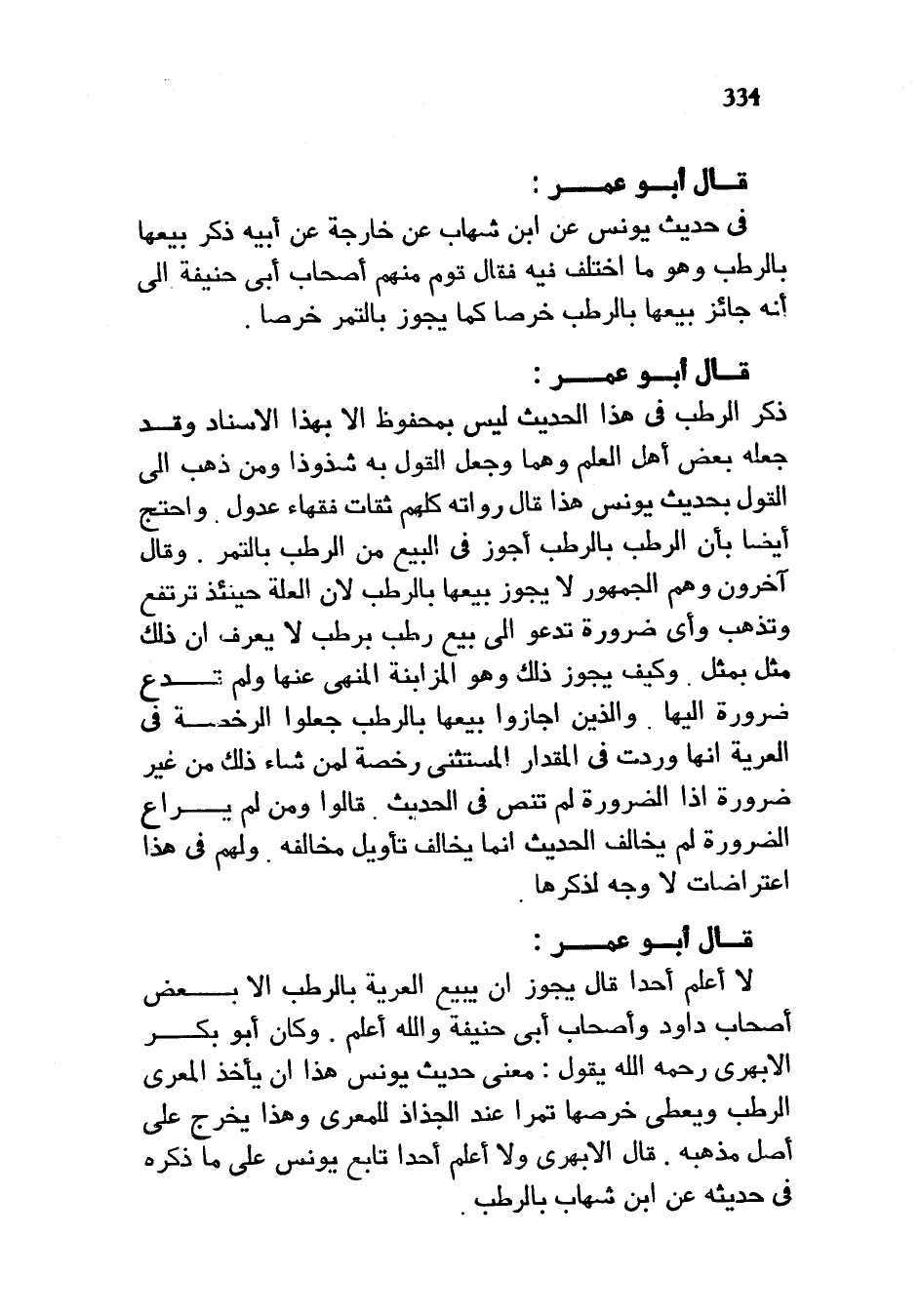 قَالَ أَبُو عُمَرَ فِي حَدِيثِ يُونُسَ عَنِ ابْنِ شِهَابٍ عَنْ خَارِجَةَ عَنْ أَبِيهِ ذَكَرَ بَيْعَهَا بِالرُّطَبِ وَهُوَ مَا اخْتُلِفَ فِيهِ فَقَالَ قَوْمٌ مِنْهُمْ أَصْحَابُ أَبِي حَنِيفَةَ إِلَى أَنَّهُ جَائِزٌ بَيْعُهَا بِالرُّطَبِ خَرْصًا كَمَا يَجُوزُ بِالتَّمْرِ خَرْصًا قَالَ أَبُو عُمَرَ ذِكْرُ الرُّطَبِ فِي هَذَا الْحَدِيثِ لَيْسَ بِمَحْفُوظٍ إِلَّا بِهَذَا الْإِسْنَادِ وَقَدْ جَعَلَهُ بَعْضُ أَهْلِ الْعِلْمِ وَهْمًا وَجُعِلَ الْقَوْلُ بِهِ شُذُوذًا وَمَنْ ذَهَبَ إِلَى الْقَوْلِ بِحَدِيثِ يُونُسَ هَذَا قَالَ رُوَاتُهُ كُلُّهُمْ ثِقَاتٌ فُقَهَاءُ عُدُولٌ وَاحْتَجَّ أَيْضًا بِأَنَّ الرُّطَبَ بِالرُّطَبِ أَجْوَزُ فِي الْبَيْعِ مِنَ الرُّطَبِ بِالتَّمْرِ وَقَالَ آخَرُونَ وَهُمُ الْجُمْهُورُ لَا يَجُوزُ بَيْعُهَا بِالرُّطَبِ لِأَنَّ الْعِلَّةَ حِينَئِذٍ تَرْتَفِعُ وَتَذْهَبُ وَأَيُّ ضَرُورَةٍ تَدْعُو إِلَى بَيْعِ رُطَبٍ بِرُطَبٍ لَا يُعْرَفُ أَنَّ ذَلِكَ مِثْلٌ بِمِثْلٍ وَكَيْفَ يَجُوزُ ذَلِكَ وَهُوَ الْمُزَابَنَةُ الْمَنْهِيُّ عَنْهَا وَلَمْ تَدْعُ ضَرُورَةٌ إِلَيْهَا وَالَّذِينَ أَجَازُوا بَيْعَهَا بِالرُّطَبِ جَعَلُوا الرُّخْصَةَ فِي الْعَرِيَّةِ أَنَّهَا وَرَدَتْ فِي الْمِقْدَارِ الْمُسْتَثْنَى رُخْصَةً لِمَنْ شَاءَ ذَلِكَ مِنْ غَيْرِ ضَرُورَةٍ إذا الضَّرُورَةُ لَمْ تُنَصَّ فِي الْحَدِيثِ قَالُوا وَمَنْ لَمْ يُرَاعِ الضَّرُورَةَ لَمْ يُخَالِفِ الْحَدِيثَ إِنَّمَا يُخَالِفُ تَأْوِيلَ مُخَالِفِهِ وَلَهُمْ فِي هَذَا اعْتِرَاضَاتٌ لَا وَجْهَ لِذِكْرِهَا قَالَ أَبُو عُمَرَ لَا أَعْلَمُ أَحَدًا قَالَ يَجُوزُ أَنْ يَبِيعَ الْعَرِيَّةَ بِالرُّطَبِ إِلَّا بَعْضَ أَصْحَابِ دَاوُدَ وَأَصْحَابِ أَبِي حَنِيفَةَ وَاللَّهُ أَعْلَمُ وَكَانَ أَبُو بَكْرٍ الْأَبْهَرِيُّ رَحِمَهُ اللَّهُ يَقُولُ مَعْنَى حَدِيثِ يُونُسَ هَذَا أَنْ يَأْخُذَ الْمُعْرَى الرُّطَبِ وَيُعْطِيَ خَرْصَهَا تَمْرًا عِنْدَ الْجُذَاذِ لِلْمُعْرِي وَهَذَا يَخْرُجُ عَلَى أَصْلِ مَذْهَبِهِ قَالَ الْأَبْهَرِيُّ وَلَا أَعْلَمُ أَحَدًا تَابَعَ يُونُسَ عَلَى مَا ذَكَرَهُ فِي حَدِيثِهِ عَنِ ابْنِ شِهَابٍ بِالرُّطَبِ