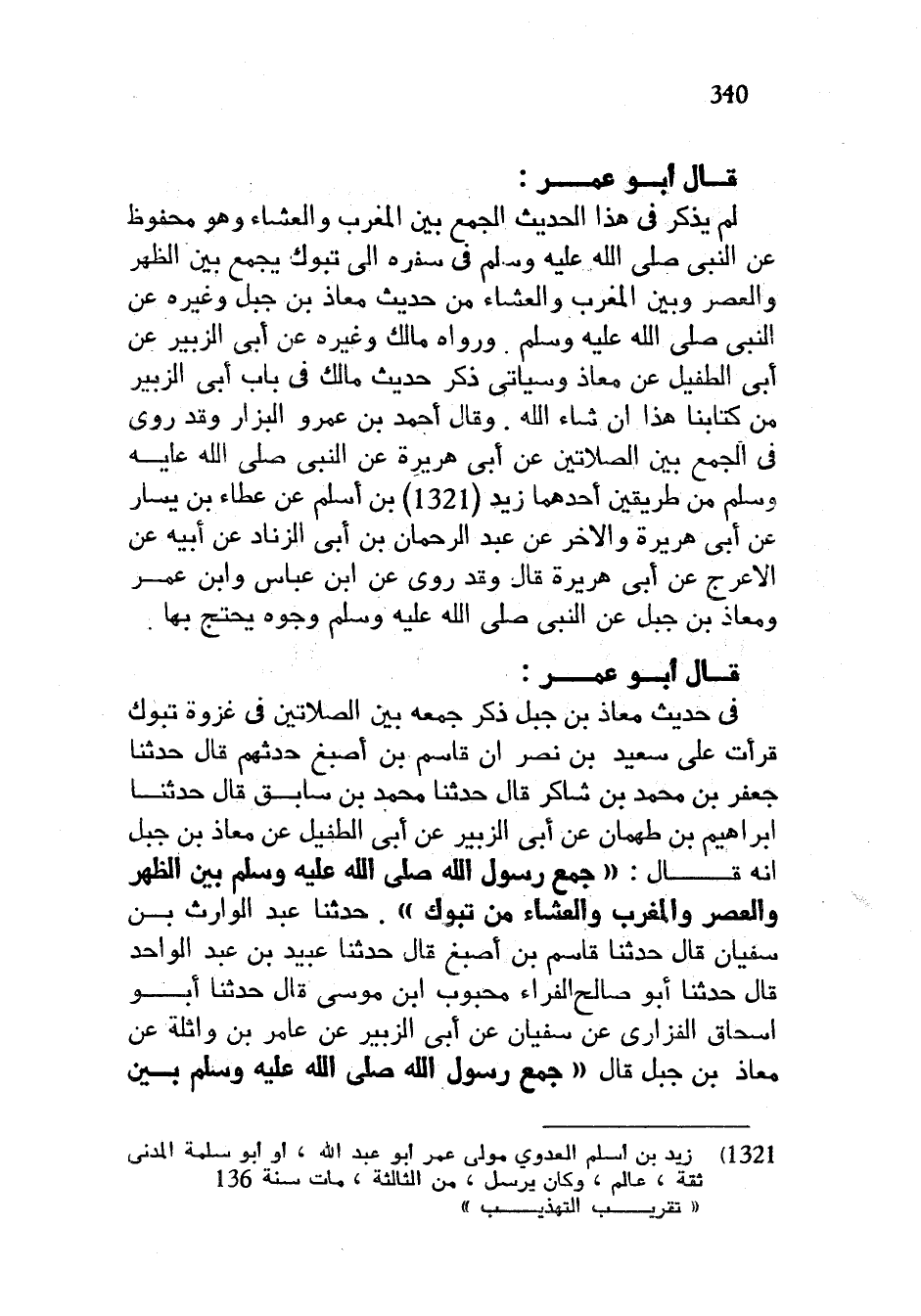 قَالَ أَبُو عُمَرَ لَمْ يُذْكَرْ فِي هَذَا الْحَدِيثِ الْجَمْعُ بَيْنَ الْمَغْرِبِ وَالْعِشَاءِ وَهُوَ مَحْفُوظٌ عَنِ النَّبِيِّ صَلَّى اللَّهُ عَلَيْهِ وَسَلَّمَ فِي سَفَرِهِ إِلَى تَبُوكَ يَجْمَعُ بَيْنَ الظُّهْرِ وَالْعَصْرِ وَبَيْنَ الْمَغْرِبِ وَالْعِشَاءِ مِنْ حَدِيثِ مُعَاذِ بْنِ جَبَلٍ وَغَيْرِهِ عَنِ النَّبِيِّ صَلَّى اللَّهُ عَلَيْهِ وَسَلَّمَ وَرَوَاهُ مَالِكٌ وَغَيْرُهُ عَنْ أَبِي الزُّبَيْرِ عَنْ أَبِي الطُّفَيْلِ عَنْ مُعَاذٍ وَسَيَأْتِي ذِكْرُ حَدِيثِ مَالِكٍ فِي بَابِ أَبِي الزُّبَيْرِ مِنْ كِتَابِنَا هَذَا إِنْ شَاءَ اللَّهُ وَقَالَ أَحْمَدُ بْنُ عَمْرٍو الْبَزَّارُ وَقَدْ رُوِيَ فِي الْجَمْعِ بَيْنَ الصَّلَاتَيْنِ عَنْ أَبِي هُرَيْرَةَ عَنِ النَّبِيِّ صَلَّى اللَّهُ عَلَيْهِ وَسَلَّمَ مِنْ طَرِيقَيْنِ أَحَدُهُمَا زَيْدِ بْنِ أَسْلَمَ عَنْ عَطَاءِ بْنِ يَسَارٍ عن أبي هريرة والاخر عن عبد الرحمان بْنِ أَبِي الزِّنَادِ عَنْ أَبِيهِ عَنِ الْأَعْرَجِ عَنْ أَبِي هُرَيْرَةَ قَالَ وَقَدْ رُوِيَ عَنِ ابْنِ عَبَّاسٍ وَابْنِ عُمَرَ وَمُعَاذِ بْنِ جَبَلٍ عَنِ النَّبِيِّ صَلَّى اللَّهُ عَلَيْهِ وَسَلَّمَ وُجُوهٌ يُحْتَجُّ بِهَا قَالَ أَبُو عُمَرَ فِي حَدِيثِ مُعَاذِ بْنِ جَبَلٍ ذَكَرَ جَمْعَهُ بَيْنَ الصَّلَاتَيْنِ فِي غَزْوَةِ تَبُوكَ قَرَأْتُ عَلَى سَعِيدِ بْنِ نَصْرٍ أَنَّ قَاسِمَ بْنَ أَصْبَغَ حَدَّثَهُمْ قَالَ حَدَّثَنَا جَعْفَرُ بْنُ مُحَمَّدِ بْنِ شَاكِرٍ قَالَ حَدَّثَنَا مُحَمَّدُ بْنُ سَابِقٍ قَالَ حَدَّثَنَا إِبْرَاهِيمُ بْنُ طَهْمَانَ عَنْ أَبِي الزُّبَيْرِ عَنْ أَبِي الطُّفَيْلِ عَنْ مُعَاذِ بْنِ جَبَلٍ أَنَّهُ قَالَ جَمَعَ رَسُولُ اللَّهِ صَلَّى اللَّهُ عَلَيْهِ وَسَلَّمَ بَيْنَ الظُّهْرِ وَالْعَصْرِ وَالْمَغْرِبِ وَالْعِشَاءِ مِنْ تَبُوكَ حَدَّثَنَا عَبْدُ الْوَارِثِ بْنُ سُفْيَانَ قَالَ حَدَّثَنَا قَاسِمُ بْنُ أَصْبَغَ قَالَ حَدَّثَنَا عُبَيْدُ بْنُ عَبْدِ الْوَاحِدِ قَالَ حَدَّثَنَا أَبُو صَالِحٍ الْفَرَّاءُ محبوب ابن مُوسَى قَالَ حَدَّثَنَا أَبُو إِسْحَاقَ الْفَزَارِيُّ عَنْ سُفْيَانَ عَنْ أَبِي الزُّبَيْرِ عَنْ عَامِرِ بْنِ وَاثِلَةَ عَنْ مُعَاذِ بْنِ جَبَلٍ قَالَ جَمَعَ رَسُولُ اللَّهِ صَلَّى اللَّهُ عَلَيْهِ وَسَلَّمَ بَيْنَ