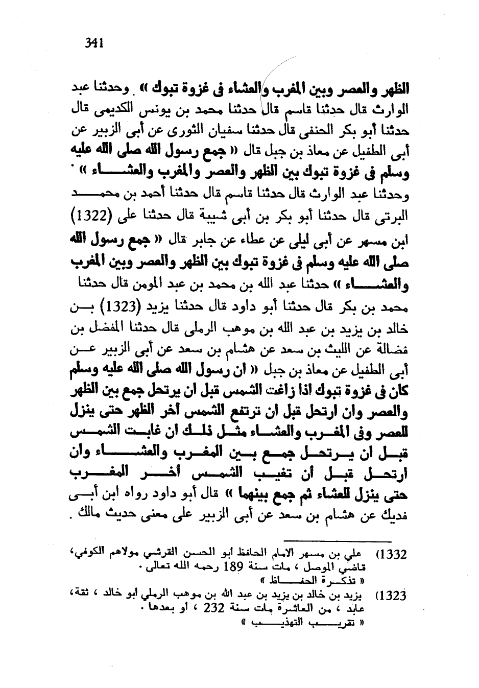 الظُّهْرِ وَالْعَصْرِ وَبَيْنَ الْمَغْرِبِ وَالْعِشَاءِ فِي غَزْوَةِ تَبُوكَ وَحَدَّثَنَا عَبْدُ الْوَارِثِ قَالَ حَدَّثَنَا قَاسِمٌ قَالَ حَدَّثَنَا مُحَمَّدُ بْنُ يُونُسَ الْكُدَيْمِيُّ قَالَ حَدَّثَنَا أَبُو بَكْرٍ الْحَنَفِيُّ قَالَ حَدَّثَنَا سُفْيَانُ الثَّوْرِيُّ عَنْ أَبِي الزُّبَيْرِ عَنْ أَبِي الطُّفَيْلِ عَنْ مُعَاذِ بْنِ جَبَلٍ قَالَ جَمَعَ رَسُولُ اللَّهِ صَلَّى اللَّهُ عَلَيْهِ وسلم في عزوة تَبُوكَ بَيْنَ الظُّهْرِ وَالْعَصْرِ وَالْمَغْرِبِ وَالْعِشَاءِ وَحَدَّثَنَا عَبْدُ الْوَارِثِ قَالَ حَدَّثَنَا قَاسِمٌ قَالَ حَدَّثَنَا أَحْمَدُ بْنُ مُحَمَّدٍ الْبِرْتِيُّ قَالَ حَدَّثَنَا أَبُو بَكْرِ بْنُ أَبِي شَيْبَةَ قَالَ حَدَّثَنَا عَلِيُّ ابن مُسْهِرٍ عَنْ أَبِي لَيْلَى عَنْ عَطَاءٍ عَنْ جَابِرٍ قَالَ جَمَعَ رَسُولُ اللَّهِ صَلَّى اللَّهُ عَلَيْهِ وَسَلَّمَ فِي غَزْوَةِ تَبُوكَ بَيْنَ الظُّهْرِ وَالْعَصْرِ وَبَيْنَ الْمَغْرِبِ وَالْعِشَاءِ حَدَّثَنَا عَبْدُ اللَّهِ بْنُ مُحَمَّدِ بْنِ عَبْدِ الْمُؤْمِنِ قَالَ حَدَّثَنَا مُحَمَّدُ بْنُ بَكْرٍ قَالَ حَدَّثَنَا أَبُو دَاوُدَ قَالَ حَدَّثَنَا يَزِيدُ بْنُ خَالِدِ بْنِ يَزِيدَ بْنِ عَبْدِ اللَّهِ بْنِ مَوْهَبٍ الرَّمْلِيُّ قَالَ حَدَّثَنَا الْمُفَضَّلُ بْنُ فَضَالَةَ عَنِ اللَّيْثِ بْنِ سَعْدٍ عَنْ هِشَامِ بْنِ سَعْدٍ عَنْ أَبِي الزُّبَيْرِ عَنْ أَبِي الطُّفَيْلِ عَنْ مُعَاذِ بْنِ جَبَلٍ أَنَّ رَسُولَ اللَّهِ صَلَّى اللَّهُ عَلَيْهِ وَسَلَّمَ كَانَ فِي غَزْوَةِ تَبُوكَ إِذَا زَاغَتِ الشَّمْسُ قَبْلَ أَنْ يَرْتَحِلَ جَمَعَ بَيْنَ الظُّهْرِ وَالْعَصْرِ وَإِنِ ارْتَحَلَ قَبْلَ أَنْ تَرْتَفِعَ الشَّمْسُ أَخَّرَ الظُّهْرَ حَتَّى يَنْزِلَ لِلْعَصْرِ وَفِي الْمَغْرِبِ وَالْعِشَاءِ مِثْلُ ذَلِكَ إِنْ غَابَتِ الشَّمْسُ قَبْلَ أَنْ يَرْتَحِلَ جَمَعَ بَيْنَ الْمَغْرِبِ وَالْعِشَاءِ وَإِنِ ارْتَحَلَ قَبْلَ أَنْ تَغِيبَ الشَّمْسُ أَخَّرَ الْمَغْرِبَ حَتَّى ينزل العشاء ثُمَّ جَمَعَ بَيْنَهُمَا قَالَ أَبُو دَاوُدَ رَوَاهُ ابْنُ أَبِي فُدَيْكٍ عَنْ هِشَامِ بْنِ سَعْدٍ عَنْ أَبِي الزُّبَيْرِ عَلَى مَعْنَى حَدِيثِ مَالِكٍ