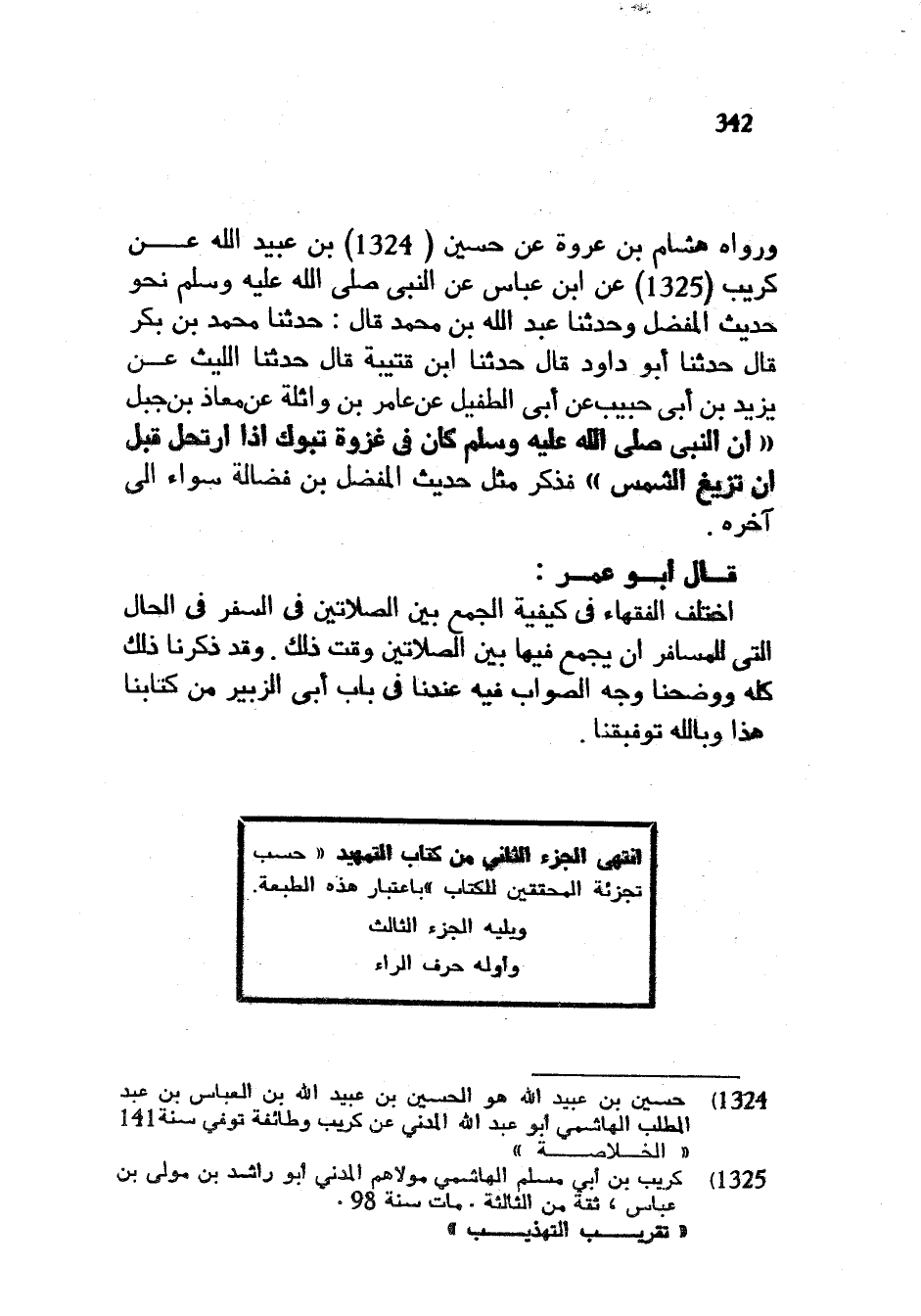 وَرَوَاهُ هِشَامُ بْنُ عُرْوَةَ عَنْ حُسَيْنِ بْنِ عُبَيْدِ اللَّهِ عَنْ كُرَيْبٍ عَنِ ابْنِ عَبَّاسٍ عَنِ النَّبِيِّ صَلَّى اللَّهُ عَلَيْهِ وَسَلَّمَ نَحْوَ حَدِيثِ الْمُفَضَّلِ وَحَدَّثَنَا عَبْدُ اللَّهِ بْنُ مُحَمَّدٍ قَالَ حَدَّثَنَا مُحَمَّدُ بْنُ بَكْرٍ قَالَ حَدَّثَنَا أَبُو دَاوُدَ قَالَ حَدَّثَنَا ابْنُ قُتَيْبَةَ قَالَ حَدَّثَنَا اللَّيْثُ عَنْ يَزِيدَ بْنِ أَبِي حَبِيبٍ عَنْ أَبِي الطُّفَيْلِ عَنْ عَامِرِ بْنِ وَاثِلَةَ عَنْ مُعَاذِ بْنِ جَبَلٍ أَنَّ النَّبِيَّ صَلَّى اللَّهُ عَلَيْهِ وَسَلَّمَ كَانَ فِي غَزْوَةِ تَبُوكَ إذاارتحل قَبْلَ أَنْ تَزِيغَ الشَّمْسُ فَذَكَرَ مِثْلَ حَدِيثِ الْمُفَضَّلِ بْنِ فَضَالَةَ سَوَاءً إِلَى آخِرِهِ قَالَ أَبُو عُمَرَ اخْتَلَفَ الْفُقَهَاءُ فِي كَيْفِيَّةِ الْجَمْعِ بَيْنَ الصَّلَاتَيْنِ فِي السَّفَرِ فِي الْحَالِ الَّتِي لِلْمُسَافِرِ أَنْ يَجْمَعَ فِيهَا بَيْنَ الصَّلَاتَيْنِ وَقْتَ ذَلِكَ وَقَدْ ذَكَرْنَا ذَلِكَ كُلَّهُ وَوَضَّحْنَا وَجْهَ الصَّوَابِ فِيهِ عِنْدَنَا فِي بَابِ أَبِي الزُّبَيْرِ مِنْ كِتَابِنَا هَذَا وَبِاللَّهِ تَوْفِيقُنَا