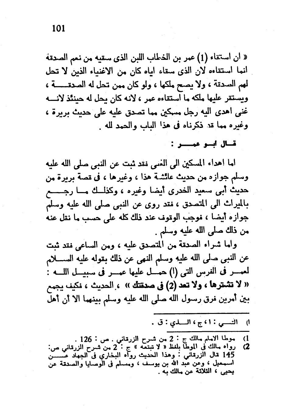 إِنَّ اسْتِقَاءَ عُمَرَ بْنِ الْخَطَّابِ اللَّبَنَ الَّذِي سُقِيَهُ مِنْ نَعَمِ الصَّدَقَةِ إِنَّمَا اسْتَقَاءَهُ لِأَنَّ الَّذِي سَقَاهُ إِيَّاهُ كَانَ مِنَ الْأَغْنِيَاءِ الَّذِينَ لَا تَحِلُّ لَهُمُ الصَّدَقَةُ وَلَا يَصِحُّ مِلْكُهَا وَلَوْ كَانَ مِمَّنْ تَحِلُّ لَهُ الصَّدَقَةُ وَيَسْتَقِرُّ عليها ملكه ما اسقاءه عُمَرُ لِأَنَّهُ كَانَ يَحِلُّ لَهُ حِينَئِذٍ لِأَنَّهُ غَنِيٌّ أَهْدَى إِلَيْهِ رَجُلٌ مِسْكِينٌ مِمَّا تُصُدِّقَ عَلَيْهِ عَلَى حَدِيثِ بَرِيرَةَ وَغَيْرِهِ مِمَّا قَدْ ذَكَرْنَاهُ فِي هَذَا الْبَابِ وَالْحَمْدُ لِلَّهِ قَالَ أَبُو عُمَرَ أَمَّا إِهْدَاءُ الْمِسْكِينِ إِلَى الْغَنِيِّ فَقَدْ ثَبَتَ عَنِ النَّبِيِّ صَلَّى اللَّهُ عَلَيْهِ وَسَلَّمَ جَوَازُهُ مِنْ حَدِيثِ عَائِشَةَ هَذَا وَغَيْرِهَا فِي قِصَّةِ بَرِيرَةَ مِنْ حَدِيثِ أَبِي سَعِيدٍ الْخُدْرِيِّ أَيْضًا وَغَيْرِهِ وَكَذَلِكَ مَا رَجَعَ بِالْمِيرَاثِ إِلَى الْمُتَصَدِّقِ فَقَدْ رُوِيَ عَنِ النَّبِيِّ صَلَّى اللَّهُ عَلَيْهِ وَسَلَّمَ جَوَازُهُ أَيْضًا فَوَجَبَ الْوُقُوفُ عند ذَلِكَ كُلُّهُ عَلَى حَسَبِ مَا نُقِلَ عَنْهُ مِنْ ذَلِكَ صَلَّى اللَّهُ عَلَيْهِ وَسَلَّمَ وَأَمَّا شِرَاءُ الصَّدَقَةِ مِنَ الْمُتَصَدَّقِ عَلَيْهِ وَمِنَ السَّاعِي فَقَدْ ثَبَتَ عَنِ النَّبِيِّ صَلَّى اللَّهُ عَلَيْهِ وَسَلَّمَ النَّهْيُ عَنْ ذَلِكَ بِقَوْلِهِ عَلَيْهِ السَّلَامُ لِعُمَرَ فِي الْفَرَسِ الَّتِي حَمَلَ عَلَيْهَا عُمَرُ فِي سَبِيلِ اللَّهِ لَا تَشْتَرِهَا وَلَا تَعُدْ فِي صَدَقَتِكَ الْحَدِيثَ فَكَيْفَ يُجْمَعُ بَيْنَ أَمْرَيْنِ فَرَّقَ رَسُولُ اللَّهِ صَلَّى اللَّهُ عَلَيْهِ وَسَلَّمَ بَيْنَهُمَا إِلَّا أَنَّ أَهْلَ