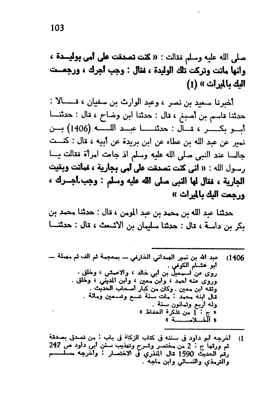 صَلَّى اللَّهُ عَلَيْهِ وَسَلَّمَ فَقَالَتْ كُنْتُ تَصَدَّقْتُ عَلَى أُمِّي بِوَلِيدَةٍ وَإِنَّهَا مَاتَتْ وَتَرَكَتْ تِلْكَ الْوَلِيدَةَ فَقَالَ وَجَبَ أَجْرُكِ وَرَجَعَتْ إِلَيْكِ بِالْمِيرَاثِ أَخْبَرَنَا سَعِيدُ بْنُ نَصْرٍ وَعَبْدُ الْوَارِثِ بْنُ سُفْيَانَ قَالَا حَدَّثَنَا قَاسِمُ بْنُ أَصْبَغَ قَالَ حَدَّثَنَا ابْنُ وَضَّاحٍ قَالَ حَدَّثَنَا أَبُو بَكْرٍ قَالَ حَدَّثَنَا عَبْدُ اللَّهِ بْنُ نُمَيْرٍ عَنْ عَبْدِ اللَّهِ بْنِ عَطَاءٍ عَنِ ابْنِ بُرَيْدَةَ عَنْ أَبِيهِ قَالَ كُنْتُ جَالِسًا عِنْدَ النَّبِيِّ صَلَّى اللَّهُ عَلَيْهِ وَسَلَّمَ إِذْ جَاءَتِ امْرَأَةٌ فَقَالَتْ يَا رَسُولَ اللَّهِ إِنِّي كُنْتُ تَصَدَّقْتُ عَلَى أُمِّي بِجَارِيَةٍ فَمَاتَتْ وَبَقِيَتِ الْجَارِيَةُ فَقَالَ لَهَا النَّبِيُّ صَلَّى اللَّهُ عَلَيْهِ وَسَلَّمَ وَجَبَ أَجْرُكِ وَرَجَعَتْ إِلَيْكِ بِالْمِيرَاثِ حَدَّثَنَا عَبْدُ اللَّهِ بْنُ مُحَمَّدِ بْنِ عَبْدِ الْمُومِنِ قَالَ حَدَّثَنَا مُحَمَّدُ بْنُ بَكْرِ بْنِ دَاسَةَ قَالَ حَدَّثَنَا سُلَيْمَانُ بْنُ الْأَشْعَثِ قَالَ حَدَّثَنَا