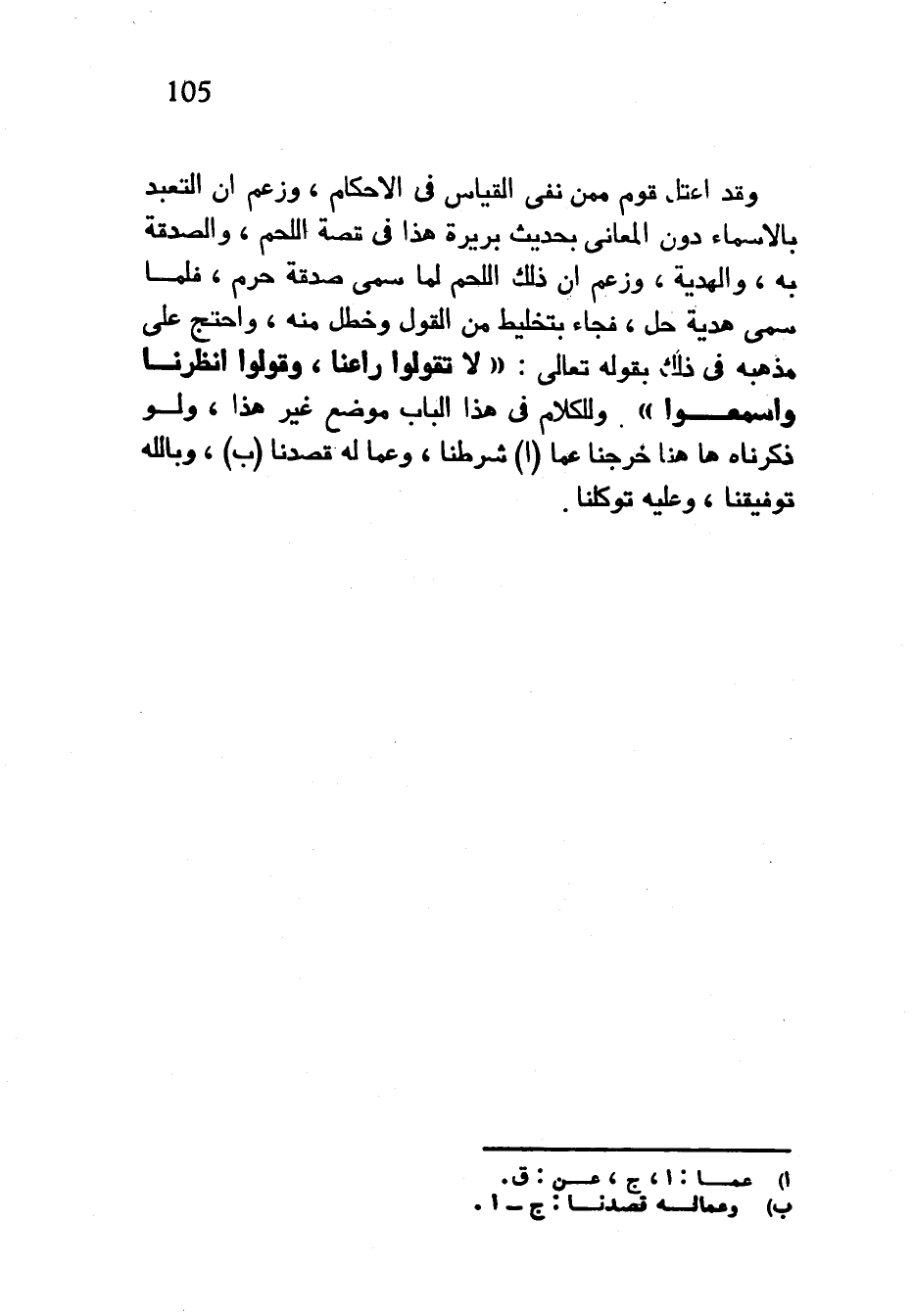 وَقَدِ اعْتَلَّ قَوْمٌ مِمَّنْ نَفَى الْقِيَاسَ فِي الْأَحْكَامِ وَزَعَمَ أَنَّ التَّعَبُّدَ بِالْأَسْمَاءِ دُونَ الْمَعَانِي بِحَدِيثِ بَرِيرَةَ هَذَا فِي قِصَّةِ اللَّحْمِ وَالصَّدَقَةِ بِهِ وَالْهَدِيَّةِ وَزَعَمَ أَنَّ ذَلِكَ اللَّحْمَ لَمَّا سُمِّيَ صَدَقَةً حَرُمَ فَلَمَّا سُمِّيَ هَدِيَّةً حَلَّ فَجَاءَ بِتَخْلِيطٍ مِنَ الْقَوْلِ وَخَطَلٍ مِنْهُ وَاحْتَجَّ عَلَى مَذْهَبِهِ فِي ذَلِكَ بِقَوْلِهِ تَعَالَى لَا تَقُولُوا رَاعِنَا وَقُولُوا انْظُرْنَا وَاسْمَعُوا وَلِلْكَلَامِ فِي هَذَا الْبَابِ مَوْضِعٌ غَيْرُ هَذَا وَلَوْ ذَكَرْنَاهُ ها هنا خَرَجْنَا عَمَّا شَرَطْنَا وَعَمَّا لَهُ قَصَدْنَا وَبِاللَّهِ تَوْفِيقُنَا وَعَلَيْهِ تَوَكُّلُنَا