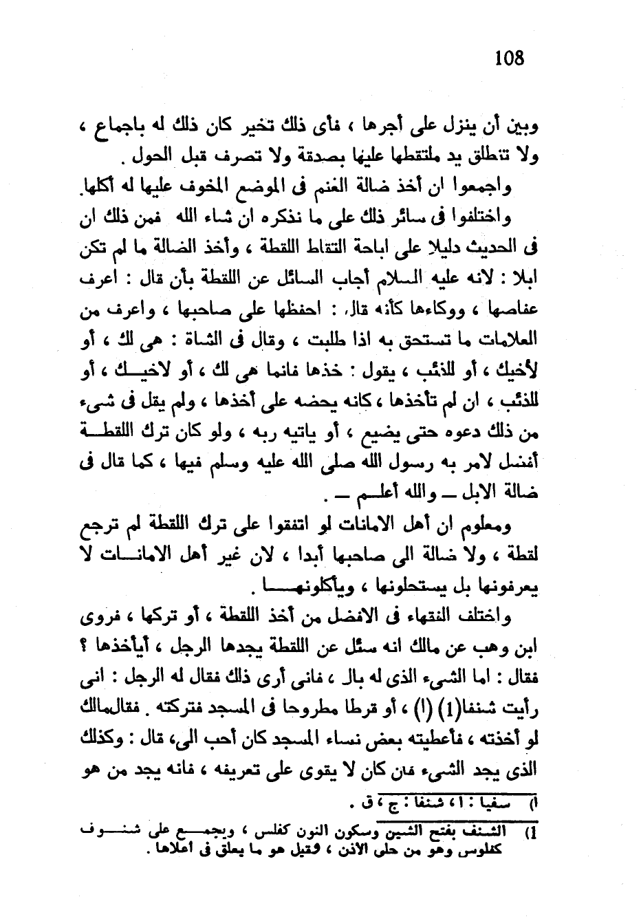 وَبَيْنَ أَنْ يَنْزِلَ عَلَى أَجْرِهَا فَأَيَّ ذَلِكَ تَخَيَّرَ كَانَ ذَلِكَ لَهُ بِإِجْمَاعٍ وَلَا تَنْطَلِقُ يَدُ مُلْتَقِطَهَا عَلَيْهَا بِصَدَقَةٍ وَلَا تَصَرُّفٍ قَبْلَ الْحَوْلِ وَأَجْمَعُوا أَنَّ آخِذَ ضَالَّةِ الْغَنَمِ فِي الْمَوْضِعِ الْمَخُوفِ عَلَيْهَا لَهُ أَكْلُهَا وَاخْتَلَفُوا فِي سَائِرِ ذَلِكَ عَلَى مَا نَذْكُرُهُ إِنْ شَاءَ اللَّهُ فَمِنْ ذَلِكَ أَنَّ فِي الْحَدِيثِ دَلِيلًا عَلَى إِبَاحَةِ الْتِقَاطِ اللُّقَطَةِ وَأَخْذِ الضَّالَّةِ مَا لَمْ تَكُنْ إِبِلًا لِأَنَّهُ عَلَيْهِ السَّلَامُ أَجَابَ السَّائِلَ عَنِ اللُّقَطَةِ بِأَنْ قَالَ اعْرِفْ عِفَاصَهَا وَوِكَاءَهَا كَأَنَّهُ قَالَ احْفَظْهَا عَلَى صَاحِبِهَا وَاعْرِفْ مِنَ الْعَلَامَاتِ مَا تُسْتَحَقُّ بِهِ إِذَا طُلِبَتْ وَقَالَ فِي الشَّاةِ هِيَ لَكَ أَوْ لِأَخِيكَ أَوْ لِلذِّئْبِ يَقُولُ خُذْهَا فَإِنَّمَا هِيَ لَكَ أَوْ لِأَخِيكَ أَوْ لِلذِّئْبِ إِنْ لَمْ تَأْخُذْهَا كَأَنَّهُ يَحُضُّهُ عَلَى أَخْذِهَا وَلَمْ يَقُلْ فِي شَيْءٍ مِنْ ذَلِكَ دَعُوهُ حَتَّى يَضِيعَ أَوْ يَأْتِيَهُ رَبُّهُ وَلَوْ كَانَ تَرْكُ اللُّقَطَةِ أَفْضَلَ لَأَمَرَ بِهِ رَسُولُ اللَّهِ صَلَّى اللَّهُ عَلَيْهِ وَسَلَّمَ فِيهَا كَمَا قَالَ فِي ضَالَّةِ الْإِبِلِ وَاللَّهُ أَعْلَمُ وَمَعْلُومٌ أَنَّ أَهْلَ الْأَمَانَاتِ لَوِ اتَّفَقُوا عَلَى تَرْكِ اللُّقَطَةِ لَمْ تَرْجِعْ لُقَطَةٌ وَلَا ضَالَّةٌ إِلَى صَاحِبِهَا أَبَدًا لِأَنَّ غَيْرَ أَهْلِ الْأَمَانَاتِ لَا يَعْرِفُونَهَا بَلْ يَسْتَحِلُّونَهَا وَيَأْكُلُونَهَا وَاخْتَلَفَ الْفُقَهَاءُ فِي الْأَفْضَلِ مِنْ أَخْذِ اللُّقَطَةِ أَوْ تَرْكِهَا فَرَوَى ابْنُ وَهْبٍ عَنْ مَالِكٍ أَنَّهُ سُئِلَ عَنِ اللُّقَطَةِ يَجِدُهَا الرَّجُلُ أَيَأْخُذُهَا فَقَالَ أَمَّا الشَّيْءُ الَّذِي لَهُ بَالٌ فَإِنِّي أَرَى ذَلِكَ فَقَالَ لَهُ الرَّجُلُ إِنِّي رَأَيْتُ شفنا أَوْ قُرْطًا مَطْرُوحًا فِي الْمَسْجِدِ فَتَرَكْتُهُ فَقَالَ مَالِكٌ لَوْ أَخَذْتَهُ فَأَعْطَيْتَهُ بَعْضَ نِسَاءِ الْمَسْجِدِ كَانَ أَحَبَّ إِلَيَّ قَالَ وَكَذَلِكَ الَّذِي يَجِدُ الشَّيْءَ فَإِنْ كَانَ لَا يَقْوَى عَلَى تَعْرِيفِهِ فَإِنَّهُ يَجِدُ مَنْ هُوَ