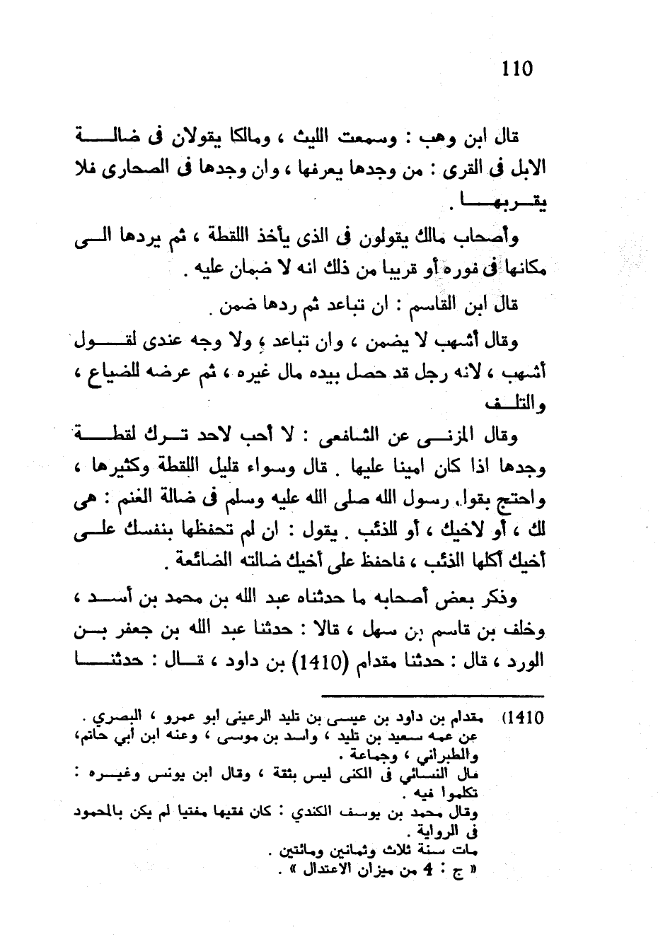 قَالَ ابْنُ وَهْبٍ وَسَمِعْتُ اللَّيْثَ وَمَالِكًا يَقُولَانِ فِي ضَالَّةِ الْإِبِلِ فِي الْقُرَى مَنْ وَجَدَهَا يُعَرِّفْهَا وَإِنْ وَجَدَهَا فِي الصَّحَارِي فَلَا يَقْرَبْهَا وَأَصْحَابُ مَالِكٍ يَقُولُونَ فِي الَّذِي يَأْخُذُ اللُّقَطَةَ ثُمَّ يَرُدُّهَا إِلَى مَكَانِهَا فِي فَوْرِهِ أَوْ قَرِيبًا مِنْ ذَلِكَ إِنَّهُ لَا ضَمَانَ عَلَيْهِ قَالَ ابْنُ الْقَاسِمِ إِنْ تَبَاعَدَ ثُمَّ رَدَّهَا ضَمِنَ وَقَالَ أَشْهَبُ لَا يَضْمَنُ وَإِنْ تَبَاعَدَ وَلَا وَجْهَ عِنْدِي لِقَوْلِ أَشْهَبَ لِأَنَّهُ رَجُلٌ قَدْ حَصَلَ بِيَدِهِ مَالُ غَيْرِهِ ثُمَّ عَرَّضَهُ لِلضَّيَاعِ وَالتَّلَفِ وَقَالَ الْمُزَنِيُّ عَنِ الشَّافِعِيِّ لَا أُحِبُّ لِأَحَدٍ تَرْكُ لُقَطَةٍ وَجَدَهَا إِذَا كَانَ أَمِينًا عَلَيْهَا قَالَ وَسَوَاءٌ قَلِيلُ اللُّقَطَةِ وَكَثِيرُهَا وَاحْتَجَّ بِقَوْلِ رَسُولِ اللَّهِ صَلَّى اللَّهُ عَلَيْهِ وَسَلَّمَ فِي ضَالَّةِ الْغَنَمِ هِيَ لَكَ أَوْ لِأَخِيكَ أَوْ لِلذِّئْبِ يَقُولُ إِنْ لَمْ تَحْفَظْهَا بِنَفْسِكَ عَلَى أَخِيكَ أَكَلَهَا الذِّئْبُ فَاحْفَظْ عَلَى أَخِيكَ ضَالَّتَهُ الضَّائِعَةَ وَذَكَرَ بَعْضُ أَصْحَابِهِ مَا حَدَّثَنَاهُ عَبْدُ اللَّهِ بْنُ مُحَمَّدِ بْنِ أَسَدٍ وَخَلَفُ بْنُ قَاسِمِ بْنِ سَهْلٍ قَالَا حَدَّثَنَا عَبْدُ اللَّهِ بْنُ جَعْفَرِ بْنِ الْوَرْدِ قَالَ حَدَّثَنَا مِقْدَامُ بْنُ دَاوُدَ قَالَ حَدَّثَنَا