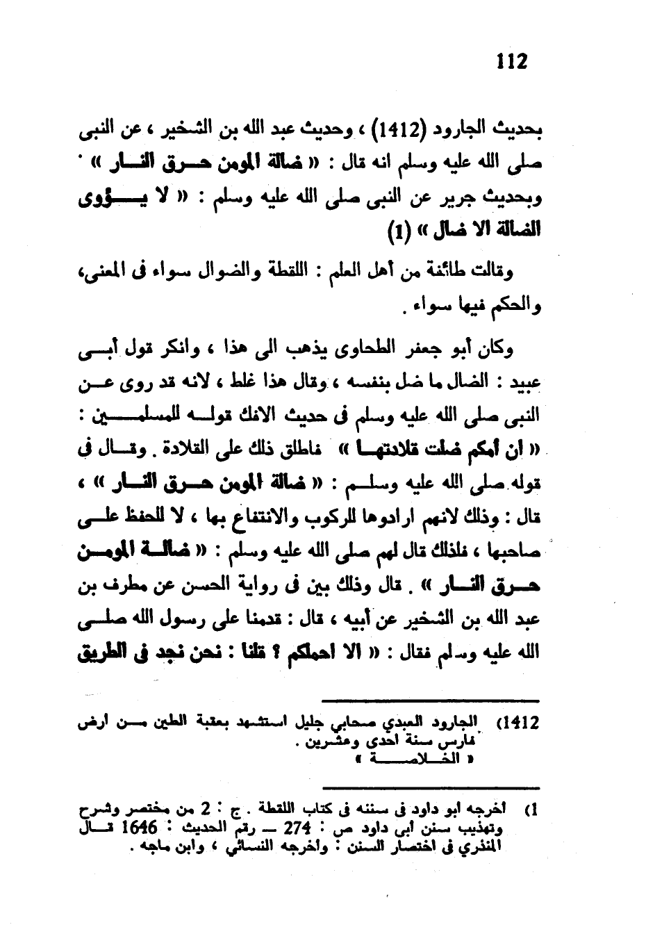 بِحَدِيثِ الْجَارُودِ وَحَدِيثِ عَبْدِ اللَّهِ بْنِ الشِّخِّيرِ عَنِ النَّبِيِّ صَلَّى اللَّهُ عَلَيْهِ وَسَلَّمَ أَنَّهُ قَالَ ضَالَّةُ الْمُؤْمِنِ حَرْقُ النَّارِ وَبِحَدِيثِ جَرِيرٍ عَنِ النَّبِيِّ صَلَّى اللَّهُ عَلَيْهِ وَسَلَّمَ لَا يؤوى الضَّالَّةَ إِلَّا ضَالٌّ وَقَالَتْ طَائِفَةٌ مِنْ أَهْلِ الْعِلْمِ اللُّقَطَةُ وَالضَّوَالُّ سَوَاءٌ فِي الْمَعْنَى وَالْحُكْمُ فِيهَا سَوَاءٌ وَكَانَ أَبُو جَعْفَرٍ الطَّحَاوِيُّ يَذْهَبُ إِلَى هَذَا وَأَنْكَرَ قَوْلَ أَبِي عُبَيْدٍ الضَّالُّ مَا ضَلَّ بِنَفْسِهِ وَقَالَ هَذَا غَلَطٌ لِأَنَّهُ قَدْ رُوِيَ عَنِ النَّبِيِّ صَلَّى اللَّهُ عَلَيْهِ وَسَلَّمَ فِي حَدِيثِ الْإِفْكِ قَوْلُهُ لِلْمُسْلِمِينَ إِنَّ أُمَّكُمْ ضَلَّتْ قِلَادَتَهَا فَأَطْلَقَ ذَلِكَ عَلَى الْقِلَادَةِ وَقَالَ فِي قَوْلِهِ صَلَّى اللَّهُ عَلَيْهِ وَسَلَّمَ ضَالَّةُ الْمُؤْمِنِ حَرْقُ النَّارِ قَالَ وَذَلِكَ لِأَنَّهُمْ أَرَادُوهَا لِلرُّكُوبِ وَالِانْتِفَاعِ بِهَا لَا لِلْحِفْظِ عَلَى صَاحِبِهَا لِذَلِكَ قَالَ لَهُمْ صَلَّى اللَّهُ عَلَيْهِ وَسَلَّمَ ضَالَّةُ الْمُؤْمِنِ حَرْقُ النَّارِ قَالَ وَذَلِكَ بَيِّنٌ فِي رِوَايَةِ الْحَسَنِ عَنْ مُطَرِّفِ بْنِ عَبْدِ اللَّهِ بْنِ الشِّخِّيرِ عَنْ أَبِيهِ قَالَ قَدِمْنَا عَلَى رَسُولِ اللَّهِ صَلَّى اللَّهُ عَلَيْهِ وَسَلَّمَ فَقَالَ أَلَا أَحْمِلُكُمْ قُلْنَا نَحْنُ نَجِدُ في الطريق