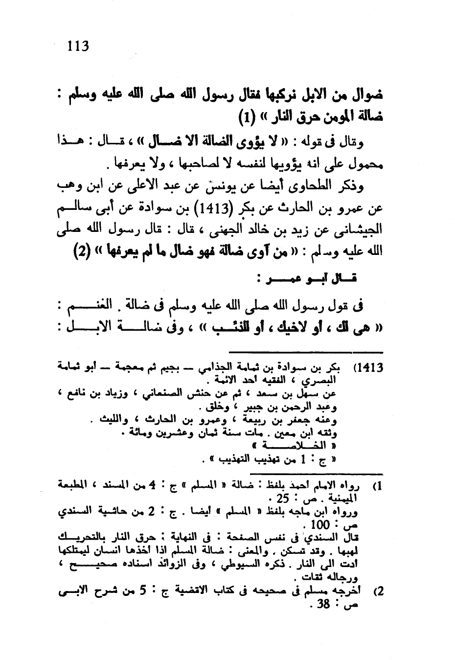 ضَوَالَّ مِنَ الْإِبِلِ نَرْكَبُهَا فَقَالَ رَسُولُ اللَّهِ صَلَّى اللَّهُ عَلَيْهِ وَسَلَّمَ ضَالَّةُ الْمُؤْمِنِ حَرْقُ النار وقال في قوله لا يؤوى الضَّالَّةَ إِلَّا ضَالٌّ قَالَ هَذَا مَحْمُولٌ عَلَى أَنَّهُ يُؤْوِيهَا لِنَفْسِهِ لَا لِصَاحِبِهَا وَلَا يُعَرِّفُهَا وذكر الحطاوي أَيْضًا عَنْ يُونُسَ عَنْ عَبْدِ الْأَعْلَى عَنِ ابْنُ وَهْبٍ عَنْ عَمْرِو بْنِ الْحَارِثِ عَنْ بَكْرِ بْنِ سَوَادَةَ عَنْ أَبِي سَالِمٍ الْجَيْشَانِيِّ عَنْ زَيْدِ بْنِ خَالِدٍ الْجُهَنِيِّ قَالَ قَالَ رَسُولُ اللَّهِ صَلَّى اللَّهُ عَلَيْهِ وسلم من آوَى ضَالَّةً فَهُوَ ضَالٌّ مَا لَمْ يُعَرِّفْهَا قَالَ أَبُو عُمَرَ فِي قَوْلِ رَسُولِ اللَّهِ صَلَّى اللَّهُ عَلَيْهِ وَسَلَّمَ فِي ضَالَّةِ الْغَنَمِ هِيَ لَكَ أَوْ لِأَخِيكَ أَوْ لِلذِّئْبِ وَفِي ضالة الابل