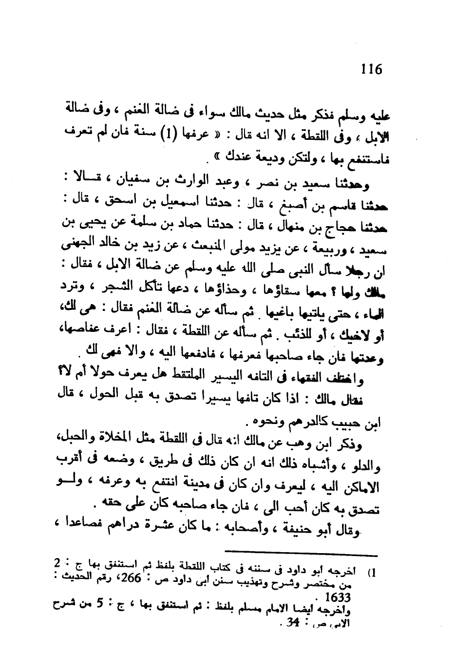 عَلَيْهِ وَسَلَّمَ فَذَكَرَ مِثْلَ حَدِيثِ مَالِكٍ سَوَاءً فِي ضَالَّةِ الْغَنَمِ وَفِي ضَالَّةِ الْإِبِلِ وَفِي اللُّقَطَةِ إِلَّا أَنَّهُ قَالَ عَرِّفْهَا سَنَةً فَإِنْ لَمْ تُعْرَفْ فَاسْتَنْفِعْ بِهَا وَلْتَكُنْ وَدِيعَةً عِنْدَكَ وَحَدَّثَنَا سَعِيدُ بْنُ نَصْرٍ وَعَبْدُ الْوَارِثِ بْنُ سُفْيَانَ قَالَا حَدَّثَنَا قَاسِمُ بْنُ أَصْبَغَ قَالَ حدثنا اسمعيل بْنُ إِسْحَاقَ قَالَ حَدَّثَنَا حَجَّاجُ بْنُ مِنْهَالٍ قَالَ حَدَّثَنَا حَمَّادُ بْنُ سَلَمَةَ عَنْ يَحْيَى بْنِ سَعِيدٍ وَرَبِيعَةَ عَنْ يَزِيدَ مَوْلَى الْمُنْبَعِثِ عَنْ زَيْدِ بْنِ خَالِدٍ الْجُهَنِيِّ أَنَّ رَجُلًا سَأَلَ النَّبِيَّ صَلَّى اللَّهُ عَلَيْهِ وَسَلَّمَ عَنْ ضالة الابل فقال مالك وَلَهَا مَعَهَا سِقَاؤُهَا وَحِذَاؤُهَا دَعْهَا تَأْكُلُ الشَّجَرَ وَتَرِدُ الْمَاءَ حَتَّى يَأْتِيَهَا بَاغِيهَا ثُمَّ سَأَلَهُ عَنْ ضَالَّةِ الْغَنَمِ فَقَالَ هِيَ لَكَ أَوْ لِأَخِيكَ أَوْ لِلذِّئْبِ ثُمَّ سَأَلَهُ عَنِ اللُّقَطَةِ فَقَالَ اعْرِفْ عِفَاصَهَا وَعِدَّتَهَا فَإِنْ جَاءَ صَاحِبُهَا فَعَرَّفَهَا فَادْفَعْهَا إِلَيْهِ وَإِلَّا فَهِيَ لَكَ وَاخْتَلَفَ الْفُقَهَاءُ فِي التَّافِهِ الْيَسِيرِ الْمُلْتَقَطِ هَلْ يُعَرَّفُ حَوْلًا أَمْ لَا فَقَالَ مَالِكٌ إِذَا كَانَ تَافِهًا يَسِيرًا تُصُدِّقَ بِهِ قَبْلَ الْحَوْلِ قَالَ ابْنُ حَبِيبٍ كَالدِّرْهَمِ وَنَحْوِهِ وَذَكَرَ ابْنُ وَهْبٍ عَنْ مَالِكٍ أَنَّهُ قَالَ فِي اللُّقَطَةِ مِثْلَ الْمِخْلَاةِ وَالْحَبْلِ وَالدَّلْوِ وَأَشْبَاهِ ذَلِكَ أَنَّهُ إِنْ كَانَ ذَلِكَ فِي طَرِيقٍ وَضَعَهُ فِي أَقْرَبِ الْأَمَاكِنِ إِلَيْهِ لِيُعْرَفَ وَإِنْ كَانَ فِي مَدِينَةٍ انْتَفَعَ بِهِ وَعَرَّفَهُ وَلَوْ تَصَدَّقَ بِهِ كَانَ أَحَبَّ إِلَيَّ فَإِنْ جَاءَ صَاحِبُهُ كَانَ عَلَى حَقِّهِ وَقَالَ أَبُو حَنِيفَةَ وَأَصْحَابُهُ مَا كَانَ عشرة دراهم فصاعدا