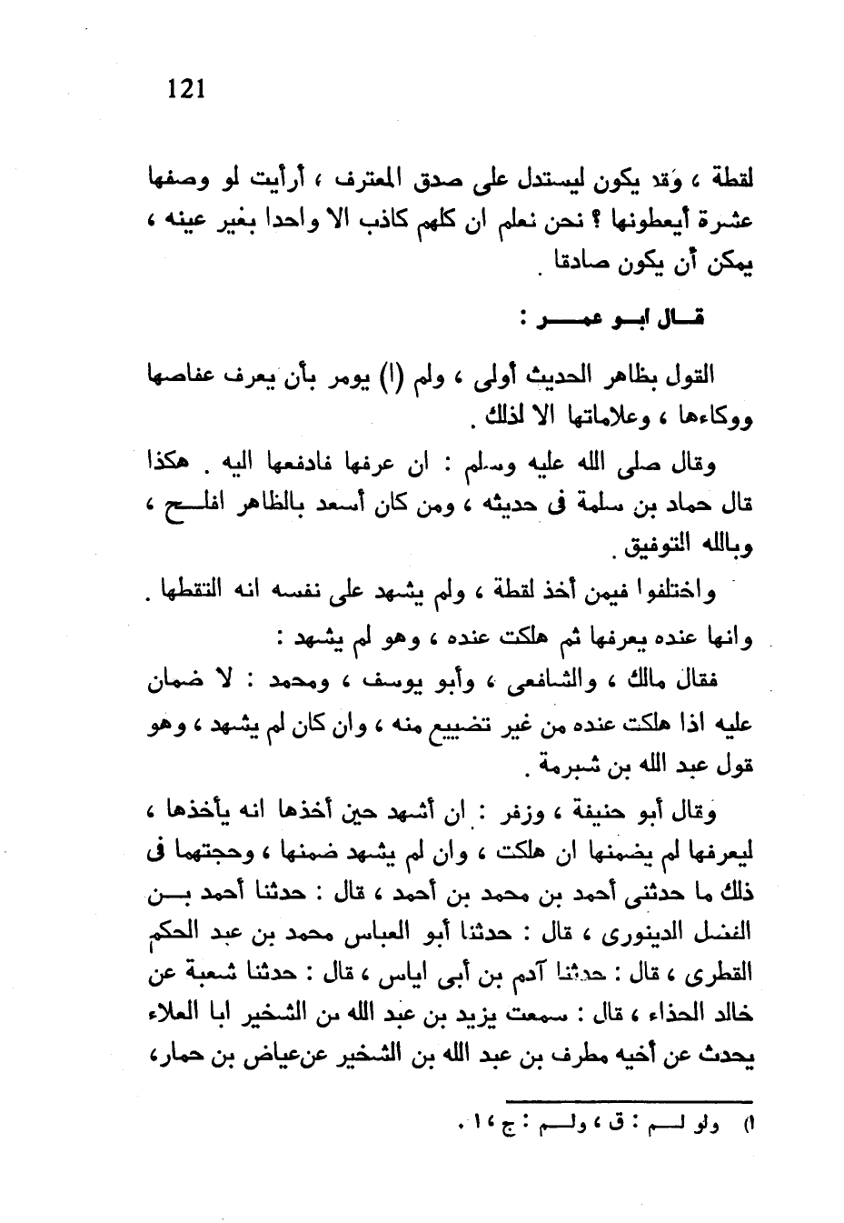 لُقَطَةٌ وَقَدْ يَكُونُ لِيَسْتَدِلَّ عَلَى صِدْقِ الْمُعْتَرِفِ أَرَأَيْتَ لَوْ وَصَفَهَا عَشَرَةٌ أَيُعْطَوْنَهَا نَحْنُ نَعْلَمُ أَنَّ كُلَّهُمْ كَاذِبٌ إِلَّا وَاحِدًا بِغَيْرِ عَيْنِهِ يُمْكِنُ أَنْ يَكُونَ صَادِقًا قَالَ أَبُو عُمَرَ الْقَوْلُ بِظَاهِرِ الْحَدِيثِ أَوْلَى وَلَمْ يُؤْمَرْ بِأَنْ يَعْرِفَ عِفَاصَهَا وَوِكَاءَهَا وَعَلَامَاتِهَا إِلَّا لِذَلِكَ وَقَالَ صَلَّى اللَّهُ عَلَيْهِ وَسَلَّمَ إِنْ عَرَفَهَا فَادْفَعْهَا إِلَيْهِ هَكَذَا قَالَ حَمَّادُ بْنُ سَلَمَةَ فِي حَدِيثِهِ وَمَنْ كَانَ أَسْعَدَ بِالظَّاهِرِ أَفْلَحَ وَبِاللَّهِ التَّوْفِيقُ وَاخْتَلَفُوا فِيمَنْ أَخَذَ لُقَطَةً وَلَمْ يُشْهِدْ عَلَى نَفْسِهِ أَنَّهُ الْتَقَطَهَا وَإِنَّهَا عِنْدَهُ يُعَرِّفُهَا ثُمَّ هَلَكَتْ عِنْدَهُ وَهُوَ لَمْ يُشْهِدْ فَقَالَ مَالِكٌ وَالشَّافِعِيُّ وَأَبُو يُوسُفَ وَمُحَمَّدٌ لَا ضَمَانَ عَلَيْهِ إِذَا هَلَكَتْ عِنْدَهُ مِنْ غَيْرِ تَضْيِيعٍ مِنْهُ وَإِنْ كَانَ لَمْ يُشْهِدْ وَهُوَ قَوْلُ عَبْدِ اللَّهِ بْنِ شُبْرُمَةَ وَقَالَ أَبُو حَنِيفَةَ وَزُفَرُ إِنْ أَشْهَدْ حِينَ أَخَذَهَا أَنَّهُ يَأْخُذُهَا لِيُعَرِّفْهَا لَمْ يَضْمَنْهَا إِنْ هَلَكَتْ وَإِنْ لَمْ يُشْهِدْ ضَمِنَهَا وَحُجَّتُهُمَا فِي ذَلِكَ مَا حَدَّثَنِي أَحْمَدُ بْنُ مُحَمَّدِ بْنِ أَحْمَدَ قَالَ حَدَّثَنَا أَحْمَدُ بْنُ الْفَضْلِ الدِّينَوَرِيُّ قَالَ حَدَّثَنَا أَبُو الْعَبَّاسِ مُحَمَّدُ بْنُ عَبْدِ الْحَكَمِ الْقَطْرِيُّ قَالَ حَدَّثَنَا آدَمُ بْنُ أَبِي إِيَاسٍ قَالَ حَدَّثَنَا شُعْبَةُ عَنْ خَالِدٍ الْحَذَّاءِ قَالَ سَمِعْتُ يَزِيدَ بْنَ عَبْدِ اللَّهِ بْنِ الشِّخِّيرِ أَبَا الْعَلَاءِ يُحَدِّثُ عَنْ أَخِيهِ مُطَرِّفِ بْنِ عَبْدِ اللَّهِ بْنِ الشِّخِّيرِ عَنْ عِيَاضِ بْنِ حِمَارٍ