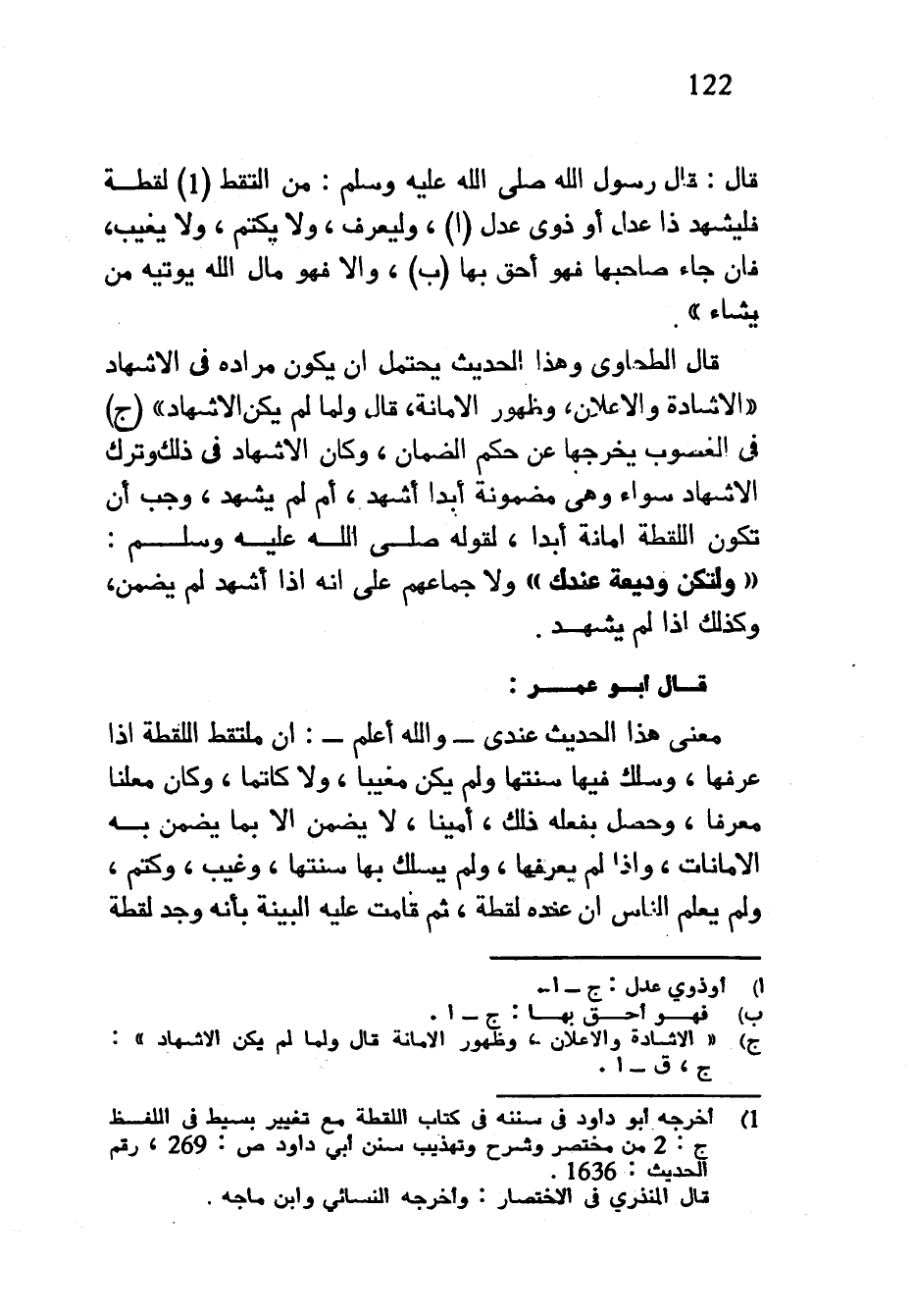 قَالَ قَالَ رَسُولُ اللَّهِ صَلَّى اللَّهُ عَلَيْهِ وَسَلَّمَ مَنِ الْتَقَطَ لُقَطَةً فَلْيُشْهِدْ ذَا عَدْلٍ أَوْ ذَوَيْ عَدْلٍ وَلِيُعَرِّفْ وَلَا يَكْتُمْ وَلَا يُغَيِّبْ فَإِنْ جَاءَ صَاحِبُهَا فَهُوَ أَحَقُّ بِهَا وَإِلَّا فَهُوَ مَالُ اللَّهِ يُؤْتِيهِ مَنْ يَشَاءُ قَالَ الطَّحَاوِيُّ وَهَذَا الْحَدِيثُ يَحْتَمِلُ أَنْ يَكُونَ مُرَادُهُ فِي الْإِشْهَادِ الْإِشَادَةَ وَالْإِعْلَانَ وَظُهُورَ الْأَمَانَةِ قَالَ وَلَمَّا لَمْ يَكُنِ الْإِشْهَادُ فِي الْغُصُوبِ يُخْرِجُهَا عَنْ حُكْمِ الضَّمَانِ وَكَانَ الْإِشْهَادُ فِي ذَلِكَ وَتَرْكُ الْإِشْهَادِ سَوَاءً وَهِيَ مَضْمُونَةٌ أَبَدًا أَشْهَدَ أَمْ لَمْ يُشْهِدْ وَجَبَ أَنْ تَكُونَ اللُّقَطَةُ أَمَانَةً أَبَدًا لِقَوْلِهِ صَلَّى اللَّهُ عَلَيْهِ وَسَلَّمَ وَلْتَكُنْ وَدِيعَةً عِنْدَكَ وَلِإِجْمَاعِهِمْ عَلَى أَنَّهُ إِذَا أَشْهَدَ لَمْ يَضْمَنْ وَكَذَلِكَ إِذَا لَمْ يُشْهِدْ قَالَ أَبُو عُمَرَ مَعْنَى هَذَا الْحَدِيثِ عِنْدِي وَاللَّهُ أَعْلَمُ أَنَّ مُلْتَقِطَ اللُّقَطَةِ إِذَا عَرَّفَهَا وَسَلَكَ فِيهَا سُنَّتَهَا وَلَمْ يَكُنْ مُغَيِّبًا وَلَا كَاتِمًا وَكَانَ مُعْلِنًا مُعَرِّفًا وَحَصَلَ بِفِعْلِهِ ذَلِكَ أَمِينًا لَا يَضْمَنُ إِلَّا بِمَا يَضْمَنُ بِهِ الْأَمَانَاتِ وَإِذَا لَمْ يُعَرِّفْهَا وَلَمْ يَسْلُكْ بِهَا سُنَّتَهَا وَغَيَّبَ وَكَتَمَ وَلَمْ يُعْلِمِ النَّاسَ أَنَّ عِنْدَهُ لُقَطَةً ثُمَّ قَامَتْ عَلَيْهِ الْبَيِّنَةُ بِأَنَّهُ وَجَدَ لُقَطَةً