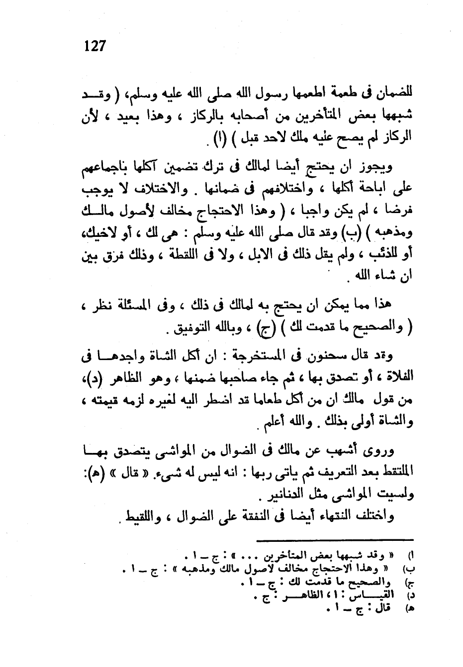 لِلضَّمَانِ فِي طُعْمَةٍ أَطْعَمَهَا رَسُولُ اللَّهِ صَلَّى اللَّهُ عَلَيْهِ وَسَلَّمَ (وَقَدْ شَبَّهَهَا بَعْضُ الْمُتَأَخِّرِينَ مِنْ أَصْحَابِهِ بِالرِّكَازِ وَهَذَا بَعِيدٌ لِأَنَّ الرِّكَازَ لم يصح عليه ملك لأحد قبل) (أ) ويجوز ان يحتج أيضا لمالك فِي تَرْكِ تَضْمِينِ آكِلِهَا بِإِجْمَاعِهِمْ عَلَى إِبَاحَةِ أَكْلِهَا وَاخْتِلَافِهِمْ فِي ضَمَانِهَا وَالِاخْتِلَافُ لَا يُوجِبُ فَرْضًا لَمْ يَكُنْ وَاجِبًا (وَهَذَا الِاحْتِجَاجُ مُخَالِفٌ لأصول مالك ومذهبه) (ب) وَقَدْ قَالَ صَلَّى اللَّهُ عَلَيْهِ وَسَلَّمَ هِيَ لَكَ أَوْ لِأَخِيكَ أَوْ لِلذِّئْبِ وَلَمْ يَقُلْ ذَلِكَ فِي الْإِبِلِ وَلَا فِي اللُّقَطَةِ وَذَلِكَ فَرْقٌ بَيِّنٌ إِنْ شَاءَ اللَّهُ هَذَا مِمَّا يمكن أن يحتج به لمالك في ذلك وفي المسئلة نظر (والصحيح ما قدمت لك) (ج) وَبِاللَّهِ التَّوْفِيقُ وَقَدْ قَالَ سَحْنُونٌ فِي الْمُسْتَخْرَجَةِ إِنْ أَكَلَ الشَّاةَ وَاجِدُهَا فِي الْفَلَاةِ أَوْ تَصَدَّقَ بِهَا ثُمَّ جَاءَ صَاحِبُهَا ضَمِنَهَا وَهُوَ الظَّاهِرُ مِنْ قَوْلِ مَالِكٍ أَنَّ مَنْ أَكَلَ طَعَامًا قَدِ اضْطُرَّ إِلَيْهِ لِغَيْرِهِ لَزِمَهُ قِيمَتُهُ وَالشَّاةُ أَوْلَى بِذَلِكَ وَاللَّهُ أَعْلَمُ وَرَوَى أَشْهَبُ عَنْ مَالِكٍ فِي الضَّوَالِّ مِنَ الْمَوَاشِي يَتَصَدَّقُ بِهَا الْمُلْتَقِطُ بَعْدَ التَّعْرِيفِ ثُمَّ يَأْتِي رَبُّهَا أنه ليس له شيء قال (هـ) وَلَيْسَتِ الْمَوَاشِي مِثْلَ الدَّنَانِيرِ وَاخْتَلَفَ الْفُقَهَاءُ أَيْضًا فِي النَّفَقَةِ عَلَى الضَّوَالِّ وَاللَّقِيطِ