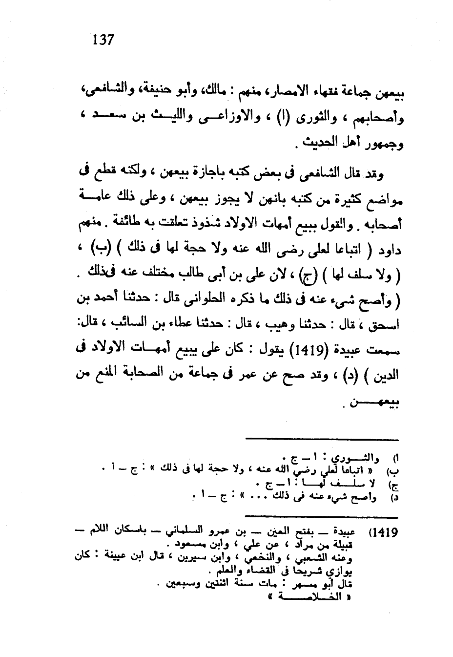 بين جَمَاعَةُ فُقَهَاءِ الْأَمْصَارِ مِنْهُمْ مَالِكٌ وَأَبُو حَنِيفَةَ وَالشَّافِعِيُّ وَأَصْحَابُهُمْ وَالثَّوْرِيُّ وَالْأَوْزَاعِيُّ وَاللَّيْثُ بْنُ سَعْدٍ وَجُمْهُورُ أَهْلِ الْحَدِيثِ وَقَدْ قَالَ الشَّافِعِيُّ فِي بَعْضِ كُتُبِهِ بِإِجَازَةِ بَيْعِهِنَّ وَلَكِنَّهُ قَطَعَ فِي مَوَاضِعَ كَثِيرَةٍ مِنْ كُتُبِهِ بِأَنَّهُنَّ لَا يَجُوزُ بَيْعُهُنَّ وَعَلَى ذَلِكَ عَامَّةُ أَصْحَابِهِ وَالْقَوْلُ بِبَيْعِ أُمَّهَاتِ الْأَوْلَادِ شُذُوذٌ تَعَلَّقَتْ بِهِ طَائِفَةٌ مِنْهُمْ داود (اتباعا لعلي رضي الله عنه ولاحجة لها في ذلك) (ب) (ولا سلف لها) (ج) لِأَنَّ عَلِيَّ بْنَ أَبِي طَالِبٍ مُخْتَلَفٌ عَنْهُ فِي ذَلِكَ (وَأَصَحُّ شَيْءٍ عَنْهُ فِي ذَلِكَ مَا ذَكَرَهُ الْحَلْوَانِيُّ قَالَ حَدَّثَنَا أَحْمَدُ بْنُ إِسْحَاقَ قَالَ حَدَّثَنَا وُهَيْبٌ قَالَ حَدَّثَنَا عَطَاءُ بْنُ السَّائِبِ قَالَ سَمِعْتُ عُبَيْدَةَ (1419) يَقُولُ كَانَ عَلِيٌّ يَبِيعُ أُمَّهَاتِ الْأَوْلَادِ فِي الدَّيْنِ) وَقَدْ صَحَّ عَنْ عُمَرَ فِي جَمَاعَةٍ مِنَ الصَّحَابَةِ الْمَنْعُ مِنْ بَيْعِهِنَّ