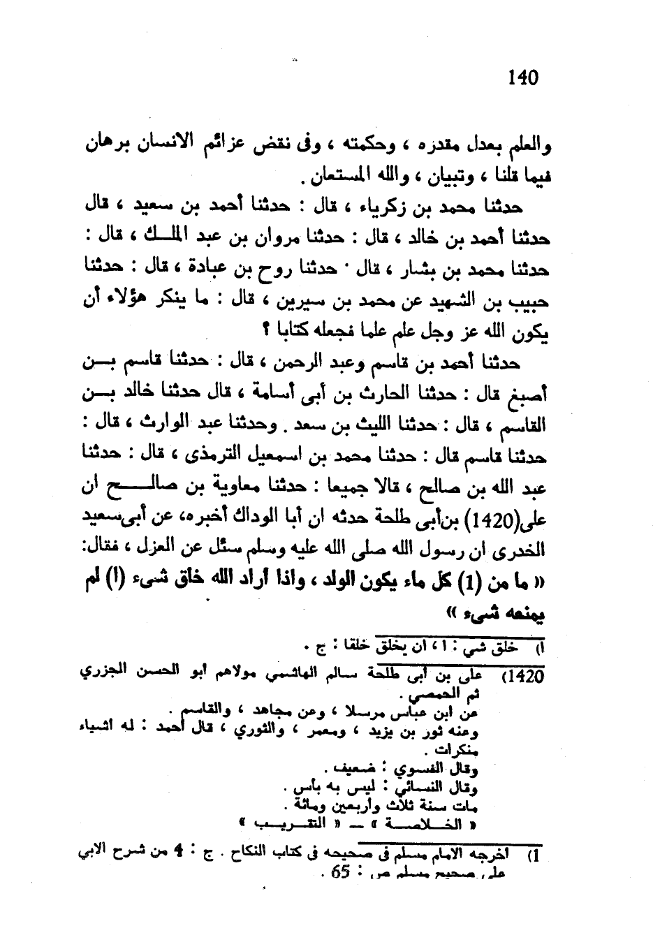 وَالْعِلْمِ بِعَدْلِ مُقَدِّرِهِ وَحِكْمَتِهِ وَفِي نَقْضِ عَزَائِمِ الْإِنْسَانِ بُرْهَانٌ فِيمَا قُلْنَا وَتِبْيَانٌ وَاللَّهُ الْمُسْتَعَانُ حَدَّثَنَا مُحَمَّدُ بْنُ زَكَرِيَّاءَ قَالَ حَدَّثَنَا أَحْمَدُ بْنُ سَعِيدٍ قَالَ حَدَّثَنَا أَحْمَدُ بْنُ خَالِدٍ قَالَ حَدَّثَنَا مَرْوَانُ بْنُ عَبْدِ الْمَلِكِ قَالَ حَدَّثَنَا مُحَمَّدُ بْنُ بَشَّارٍ قَالَ حَدَّثَنَا رَوْحُ بْنُ عُبَادَةَ قَالَ حَدَّثَنَا حَبِيبُ بْنُ الشَّهِيدِ عَنْ مُحَمَّدِ بْنِ سِيرِينَ قَالَ مَا يُنْكِرُ هَؤُلَاءِ أَنْ يَكُونَ اللَّهُ عَزَّ وَجَلَّ عَلِمَ عِلْمًا فَجَعَلَهُ كِتَابًا حَدَّثَنَا أَحْمَدُ بْنُ قَاسِمٍ وَعَبْدُ الرَّحْمَنِ قَالَ حَدَّثَنَا قَاسِمُ بْنُ أَصْبَغَ قَالَ حَدَّثَنَا الْحَارِثُ بْنُ أَبِي أُسَامَةَ قَالَ حَدَّثَنَا خَالِدُ بْنُ الْقَاسِمِ قَالَ حَدَّثَنَا اللَّيْثُ بْنُ سَعْدٍ وَحَدَّثَنَا عَبْدُ الْوَارِثِ قَالَ حَدَّثَنَا قَاسِمٌ قَالَ حدثنا محمد بن إسمعيل التِّرْمِذِيُّ قَالَ حَدَّثَنَا عَبْدُ اللَّهِ بْنُ صَالِحٍ قَالَا جَمِيعًا حَدَّثَنَا مُعَاوِيَةُ بْنُ صَالِحٍ أَنَّ عَلِيَّ بْنَ أَبِي طَلْحَةَ حَدَّثَهُ أَنَّ أَبَا الْوَدَّاكِ أَخْبَرَهُ عَنْ أَبِي سَعِيدٍ الْخُدْرِيِّ أَنَّ رَسُولَ اللَّهِ صَلَّى اللَّهُ عَلَيْهِ وَسَلَّمَ سُئِلَ عَنِ الْعَزْلِ فَقَالَ مَا مِنْ كُلِّ مَاءٍ يَكُونُ الْوَلَدُ وَإِذَا أَرَادَ اللَّهُ خَلْقَ شَيْءٍ لَمْ يَمْنَعْهُ شَيْءٌ