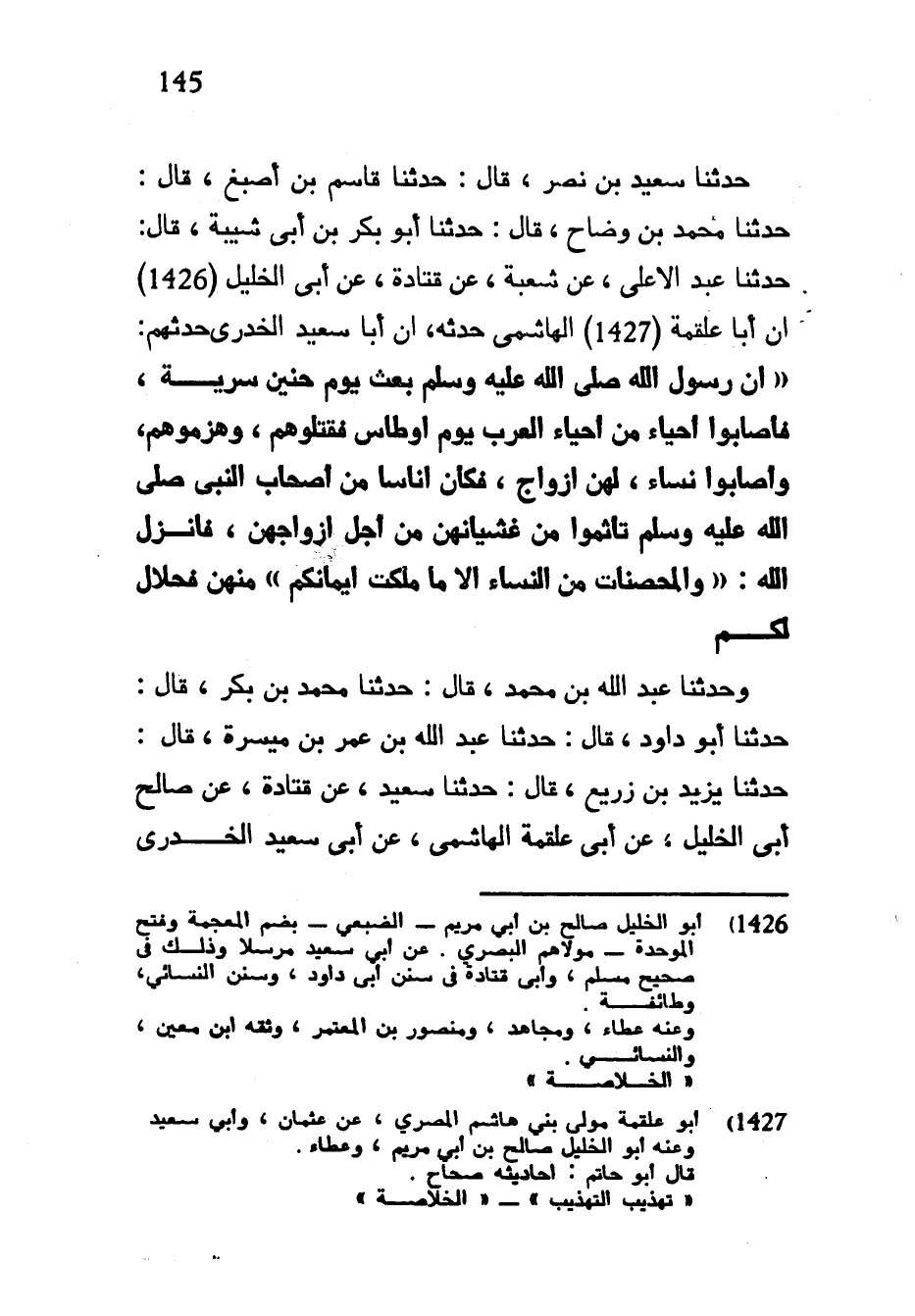 حَدَّثَنَا سَعِيدُ بْنُ نَصْرٍ قَالَ حَدَّثَنَا قَاسِمُ بْنُ أَصْبَغَ قَالَ حَدَّثَنَا مُحَمَّدُ بْنُ وَضَّاحٍ قَالَ حَدَّثَنَا أَبُو بَكْرِ بْنُ أَبِي شَيْبَةَ قَالَ حَدَّثَنَا عَبْدُ الْأَعْلَى عَنْ شُعْبَةَ عَنْ قَتَادَةَ عَنْ أَبِي الْخَلِيلِ أَنَّ أَبَا عَلْقَمَةَ الْهَاشِمِيَّ حَدَّثَهُ أَنَّ أَبَا سَعِيدٍ الْخُدْرِيَّ حَدَّثَهُمْ أن رسول الله صلى الله عليه وسلم بَعَثَ يَوْمَ حُنَيْنٍ سَرِيَّةً فَأَصَابُوا أَحْيَاءً مِنْ أَحْيَاءِ الْعَرَبِ يَوْمَ أَوْطَاسٍ فَقَتَلُوهُمْ وَهَزَمُوهُمْ وَأَصَابُوا نِسَاءً لَهُنَّ أَزْوَاجٌ فَكَأَنَّ أُنَاسًا مِنْ أَصْحَابِ النَّبِيِّ صَلَّى اللَّهُ عَلَيْهِ وَسَلَّمَ تَأَثَّمُوا مِنْ غِشْيَانِهِنَّ مِنْ أَجْلِ أَزْوَاجِهِنَّ فَأَنْزَلَ اللَّهُ وَالْمُحْصَنَاتُ مِنَ النِّسَاءِ إِلَّا مَا مَلَكَتْ أَيْمَانُكُمْ مِنْهُنَّ فَحَلَالٌ لَكُمْ وَحَدَّثَنَا عَبْدُ اللَّهِ بْنُ مُحَمَّدٍ قَالَ حَدَّثَنَا مُحَمَّدُ بْنُ بَكْرٍ قَالَ حَدَّثَنَا أَبُو دَاوُدَ قَالَ حَدَّثَنَا عَبْدُ اللَّهِ بْنُ عُمَرَ بْنِ مَيْسَرَةَ قَالَ حَدَّثَنَا يَزِيدُ بْنُ زُرَيْعٍ قَالَ حَدَّثَنَا سَعِيدٌ عَنْ قَتَادَةَ عَنْ صَالِحٍ أَبِي الْخَلِيلِ عَنْ أَبِي عَلْقَمَةَ الْهَاشِمِيِّ عَنْ أَبِي سَعِيدٍ الْخُدْرِيِّ
