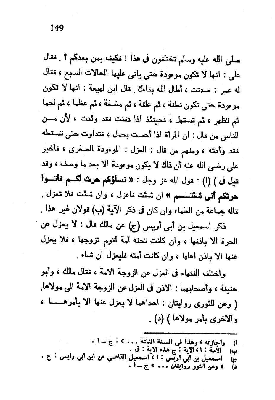 صَلَّى اللَّهُ عَلَيْهِ وَسَلَّمَ تَخْتَلِفُونَ فِي هَذَا فَكَيْفَ بِمَنْ بَعْدَكُمْ فَقَالَ عَلِيٌّ إِنَّهَا لَا تَكُونُ مَوْءُودَةً حَتَّى يَأْتِيَ عَلَيْهَا الْحَالَاتُ السَّبْعُ فَقَالَ لَهُ عُمَرُ صَدَقْتَ أَطَالَ اللَّهُ بَقَاءَكَ قال ابن لهيعة انها لاتكون مَوْءُودَةً حَتَّى تَكُونَ نُطْفَةً ثُمَّ عَلَقَةً ثُمَّ مُضْغَةً ثُمَّ عَظْمًا ثُمَّ لَحْمًا ثُمَّ تَظْهَرُ ثُمَّ تَسْتَهِلُّ فَحِينَئِذٍ إِذَا دُفِنَتْ فَقَدْ وُئِدَتْ لِأَنَّ مِنَ النَّاسِ مَنْ قَالَ إِنَّ الْمَرْأَةَ إِذَا أَحَسَّتْ بِحَمْلٍ فَتَدَاوَتْ حَتَّى تُسْقِطَهُ فَقَدْ وأدته ومنهم من قال العزل الموءدوة الصُّغْرَى فَأَخْبَرَ عَلِيٌّ رَضِيَ اللَّهُ عَنْهُ أَنَّ ذلك لا يكون موءدة إِلَّا بَعْدَ مَا وَصَفَ وَقَدْ قِيلَ فِي) قَوْلِ اللَّهِ عَزَّ وَجَلَّ نِسَاؤُكُمْ حَرْثٌ لَكُمْ فَأْتُوا حَرْثَكُمْ أَنَّى شِئْتُمْ إِنْ شِئْتَ فَاعْزِلْ وَإِنْ شِئْتَ فَلَا تَعْزِلْ قَالَهُ جَمَاعَةٌ مِنَ الْعُلَمَاءِ وَإِنْ كَانَ فِي ذِكْرِ الْآيَةِ قَوْلَانِ غير هذا ذكر إسمعيل بْنُ أَبِي أُوَيْسٍ عَنْ مَالِكٍ قَالَ لَا يَعْزِلُ عَنِ الْحُرَّةِ إِلَّا بِإِذْنِهَا وَإِنْ كَانَتْ تَحْتَهُ أَمَةٌ لِقَوْمٍ تَزَوَّجَهَا فَلَا يَعْزِلُ عَنْهَا إِلَّا بِإِذْنِ أَهْلِهَا وَإِنْ كَانَتْ أَمَتَهُ فَلْيَعْزِلْ إِنْ شَاءَ وَاخْتَلَفَ الْفُقَهَاءُ فِي الْعَزْلِ عَنِ الزَّوْجَةِ الْأَمَةِ فَقَالَ مَالِكٌ وَأَبُو حَنِيفَةَ وَأَصْحَابُهُمَا الْإِذْنُ فِي الْعَزْلِ عَنِ الزَّوْجَةِ الْأَمَةِ إِلَى مَوْلَاهَا (وَعَنِ الثَّوْرِيِّ رِوَايَتَانِ إِحْدَاهُمَا لَا يَعْزِلُ عنها الا بامرها والاخرى بأمر مولاها) (د)