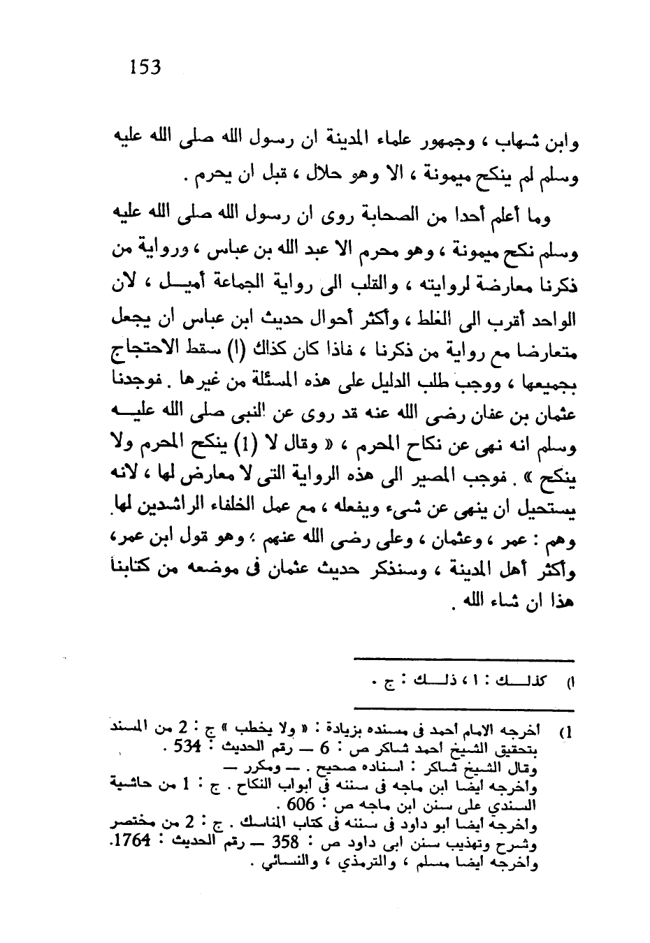 وَابْنِ شِهَابٍ وَجُمْهُورِ عُلَمَاءِ الْمَدِينَةِ أَنَّ رَسُولَ اللَّهِ صَلَّى اللَّهُ عَلَيْهِ وَسَلَّمَ لَمْ يَنْكِحْ مَيْمُونَةَ إِلَّا وَهُوَ حَلَالٌ قَبْلَ أَنْ يُحْرِمَ وَمَا أَعْلَمُ أَحَدًا مِنَ الصَّحَابَةِ رَوَى أَنَّ رَسُولَ اللَّهِ صَلَّى اللَّهُ عَلَيْهِ وَسَلَّمَ نَكَحَ مَيْمُونَةَ وَهُوَ مُحْرِمٌ إِلَّا عَبْدَ اللَّهِ بْنَ عَبَّاسٍ وَرِوَايَةُ مَنْ ذَكَرْنَا مُعَارِضَةٌ لِرِوَايَتِهِ وَالْقَلْبُ إِلَى رِوَايَةِ الْجَمَاعَةِ أَمْيَلُ لِأَنَّ الْوَاحِدَ أَقْرَبُ إِلَى الْغَلَطِ وَأَكْثَرُ أَحْوَالِ حَدِيثِ ابْنِ عَبَّاسٍ أَنْ يُجْعَلَ مُتَعَارِضًا مَعَ رِوَايَةِ مَنْ ذَكَرْنَا فَإِذَا كَانَ كَذَلِكَ سَقَطَ الِاحْتِجَاجُ بِجَمِيعِهَا وَوَجَبَ طلب الدليل على هذه المسئلة مِنْ غَيْرِهَا فَوَجَدْنَا عُثْمَانَ بْنَ عَفَّانَ رَضِيَ اللَّهُ عَنْهُ قَدْ رَوَى عَنِ النَّبِيِّ صَلَّى اللَّهُ عَلَيْهِ وَسَلَّمَ أَنَّهُ نَهَى عَنْ نِكَاحِ الْمُحْرِمِ وَقَالَ لَا يَنْكِحُ الْمُحْرِمُ وَلَا يُنْكَحُ فَوَجَبَ الْمَصِيرُ إِلَى هَذِهِ الرِّوَايَةِ الَّتِي لَا مُعَارِضَ لَهَا لِأَنَّهُ يَسْتَحِيلُ أَنْ يَنْهَى عَنْ شَيْءٍ وَيَفْعَلَهُ مَعَ عَمَلِ الْخُلَفَاءِ الرَّاشِدِينَ لَهَا وَهُمْ عُمَرُ وَعُثْمَانُ وَعَلِيٌّ رَضِيَ اللَّهُ عَنْهُمْ وَهُوَ قَوْلُ ابْنِ عُمَرَ وَأَكْثَرِ أَهْلِ الْمَدِينَةِ وَسَنَذْكُرُ حَدِيثَ عُثْمَانَ فِي مَوْضِعِهِ مِنْ كِتَابِنَا هَذَا إِنْ شَاءَ اللَّهُ