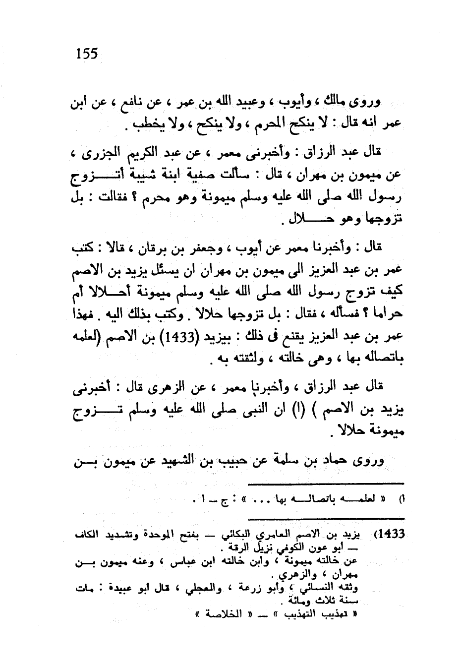 وَرَوَى مَالِكٌ وَأَيُّوبُ وَعُبَيْدُ اللَّهِ بْنُ عُمَرَ عَنْ نَافِعٍ عَنِ ابْنِ عُمَرَ أَنَّهُ قَالَ لَا يَنْكِحُ الْمُحْرِمُ وَلَا يُنْكَحُ وَلَا يَخْطُبُ قَالَ عَبْدُ الرَّزَّاقِ وَأَخْبَرَنِي مَعْمَرٌ عَنْ عَبْدِ الْكَرِيمِ الْجَزَرِيِّ عَنْ مَيْمُونَ بْنِ مِهْرَانَ قَالَ سَأَلْتُ صَفِيَّةَ ابْنَةَ شَيْبَةَ أَتَزَوَّجَ رَسُولُ اللَّهِ صَلَّى اللَّهُ عَلَيْهِ وَسَلَّمَ مَيْمُونَةَ وَهُوَ مُحْرِمٌ فَقَالَتْ بَلْ تَزَوَّجَهَا وَهُوَ حَلَالٌ قَالَ وَأَخْبَرَنَا مَعْمَرٌ عَنْ أَيُّوبَ وَجَعْفَرِ بْنِ بُرْقَانَ قَالَا كَتَبَ عُمَرُ بْنُ عَبْدِ الْعَزِيزِ إِلَى مَيْمُونَ بن مهران ان يسئل يَزِيدَ بْنَ الْأَصَمِّ كَيْفَ تَزَوَّجَ رَسُولُ اللَّهِ صَلَّى اللَّهُ عَلَيْهِ وَسَلَّمَ مَيْمُونَةَ أَحَلَالًا أَمْ حَرَامًا فَسَأَلَهُ فَقَالَ بَلْ تَزَوَّجَهَا حَلَالًا وَكَتَبَ بِذَلِكَ إِلَيْهِ فَهَذَا عُمَرُ بْنُ عَبْدِ الْعَزِيزِ يقنع في ذلك بيزيد بن الأصم (لِعِلْمِهِ بِاتِّصَالِهِ بِهَا وَهِيَ خَالَتُهُ وَلِثِقَتِهِ بِهِ قَالَ عَبْدُ الرَّزَّاقِ وَأَخْبَرَنَا مَعْمَرٌ عَنِ الزُّهْرِيِّ قال أخبرني يزيد بن الأصم) (أ) أَنَّ النَّبِيَّ صَلَّى اللَّهُ عَلَيْهِ وَسَلَّمَ تَزَوَّجَ مَيْمُونَةَ حَلَالًا وَرَوَى حَمَّادُ بْنُ سَلَمَةَ عَنْ حَبِيبِ بْنِ الشَّهِيدِ عَنْ مَيْمُونَ بْنِ