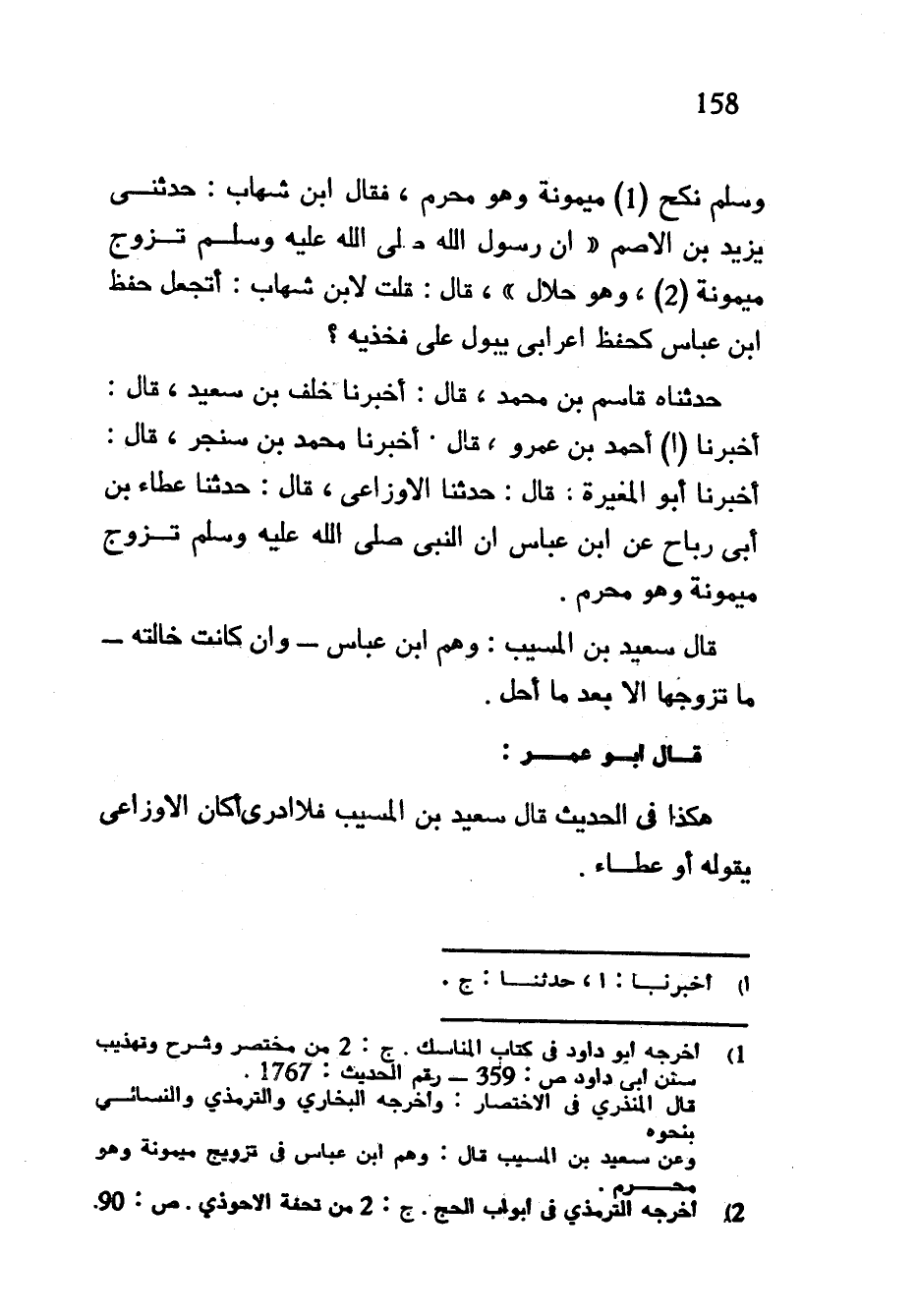 نَكَحَ مَيْمُونَةَ وَهُوَ مُحْرِمٌ فَقَالَ ابْنُ شِهَابٍ حدثني يزيد بن الأصم أن رسول الله صلى الله عليه وسلم تَزَوَّجَ مَيْمُونَةَ وَهُوَ حَلَالٌ قَالَ قُلْتُ لِابْنِ شِهَابٍ أَتَجْعَلُ حِفْظَ ابْنِ عَبَّاسٍ كَحِفْظِ أَعْرَابِيٍّ يَبُولُ عَلَى فَخِذَيْهِ حَدَّثَنَاهُ قَاسِمُ بْنُ مُحَمَّدٍ قَالَ أَخْبَرَنَا خَلَفُ بْنُ سَعِيدٍ قَالَ أَخْبَرَنَا أَحْمَدُ بْنُ عَمْرٍو قَالَ أَخْبَرَنَا مُحَمَّدُ بْنُ سَنْجَرٍ قَالَ أَخْبَرَنَا أَبُو الْمُغِيرَةِ قَالَ حَدَّثَنَا الْأَوْزَاعِيُّ قَالَ حَدَّثَنَا عَطَاءُ بْنُ أَبِي رَبَاحٍ عَنِ ابْنِ عَبَّاسٍ أَنَّ النَّبِيَّ صَلَّى اللَّهُ عَلَيْهِ وَسَلَّمَ تَزَوَّجَ مَيْمُونَةَ وَهُوَ مُحْرِمٌ قَالَ سَعِيدُ بْنُ الْمُسَيَّبِ وَهِمَ ابْنُ عَبَّاسٍ وَإِنْ كَانَتْ خَالَتَهُ مَا تَزَوَّجَهَا إِلَّا بَعْدَ مَا أَحَلَّ قَالَ أَبُو عُمَرَ هَكَذَا فِي الْحَدِيثِ قَالَ سَعِيدُ بْنُ الْمُسَيَّبِ فَلَا أَدْرِي أَكَانَ الْأَوْزَاعِيُّ يَقُولُهُ أَوْ عَطَاءٌ