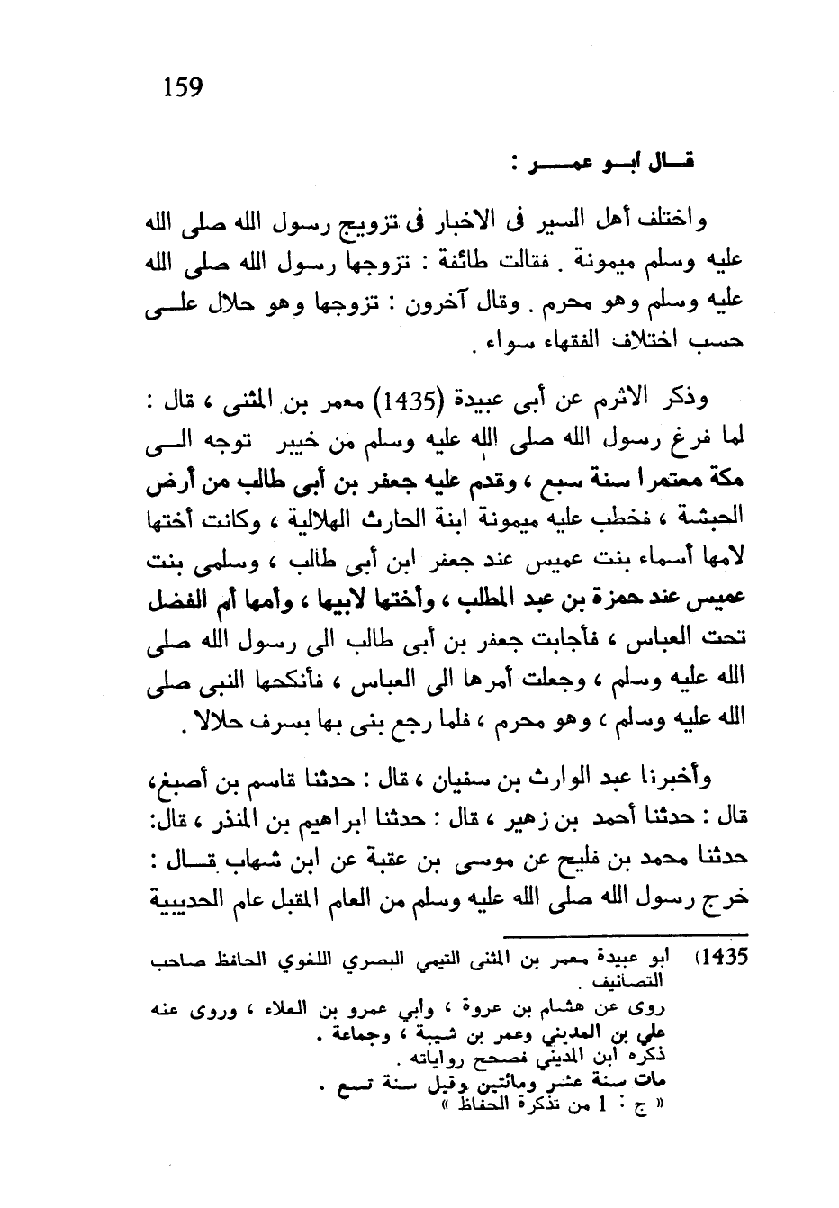 قَالَ أَبُو عُمَرَ وَاخْتَلَفَ أَهْلُ السِّيَرِ فِي الْأَخْبَارِ فِي تَزْوِيجِ رَسُولِ اللَّهِ صَلَّى اللَّهُ عَلَيْهِ وَسَلَّمَ مَيْمُونَةَ فَقَالَتْ طَائِفَةٌ تَزَوَّجَهَا رَسُولُ اللَّهِ صَلَّى اللَّهُ عَلَيْهِ وَسَلَّمَ وَهُوَ مُحْرِمٌ وَقَالَ آخَرُونَ تَزَوَّجَهَا وَهُوَ حَلَالٌ عَلَى حَسَبِ اخْتِلَافِ الْفُقَهَاءِ سَوَاءٌ وَذَكَرَ الْأَثْرَمُ عَنْ أَبِي عُبَيْدَةَ مَعْمَرِ بْنِ الْمُثَنَّى قَالَ لَمَّا فَرَغَ رَسُولُ اللَّهِ صَلَّى اللَّهُ عَلَيْهِ وَسَلَّمَ من خَيْبَرَ تَوَجَّهَ إِلَى مَكَّةَ مُعْتَمِرًا سَنَةَ سَبْعٍ وَقَدِمَ عَلَيْهِ جَعْفَرُ بْنُ أَبِي طَالِبٍ مِنْ أَرْضِ الْحَبَشَةِ فَخَطَبَ عَلَيْهِ مَيْمُونَةَ ابْنَةَ الْحَارِثِ الْهِلَالِيَّةَ وَكَانَتْ أُخْتَهَا لِأُمِّهَا أَسْمَاءُ بِنْتُ عُمَيْسٍ عند جعفر ابن أبي طالب وسلمى بنت عميس عند حَمْزَةُ بْنُ عَبْدِ الْمُطَّلِبِ وَأُخْتَهَا لِأَبِيهَا وَأُمِّهَا أُمُّ الْفَضْلِ تَحْتَ الْعَبَّاسِ فَأَجَابَتْ جَعْفَرَ بْنَ أَبِي طَالِبٍ إِلَى رَسُولِ اللَّهِ صَلَّى اللَّهُ عَلَيْهِ وَسَلَّمَ وَجَعَلَتْ أَمْرَهَا إِلَى الْعَبَّاسِ فَأَنْكَحَهَا النَّبِيَّ صَلَّى اللَّهُ عَلَيْهِ وَسَلَّمَ وَهُوَ مُحْرِمٌ فَلَمَّا رَجَعَ بَنَى بِهَا بِسَرَفَ حَلَالًا وَأَخْبَرَنَا عَبْدُ الْوَارِثِ بْنُ سُفْيَانَ قَالَ حَدَّثَنَا قَاسِمُ بْنُ أَصْبَغَ قَالَ حَدَّثَنَا أَحْمَدُ بْنُ زُهَيْرٍ قَالَ حَدَّثَنَا إِبْرَاهِيمُ بْنُ الْمُنْذِرِ قَالَ حَدَّثَنَا مُحَمَّدُ بْنُ فُلَيْحٍ عَنْ مُوسَى بْنِ عُقْبَةَ عَنِ ابْنِ شِهَابٍ قَالَ خَرَجَ رَسُولُ اللَّهِ صَلَّى اللَّهُ عَلَيْهِ وَسَلَّمَ مِنَ الْعَامِ الْمُقْبِلِ عام الحديبية